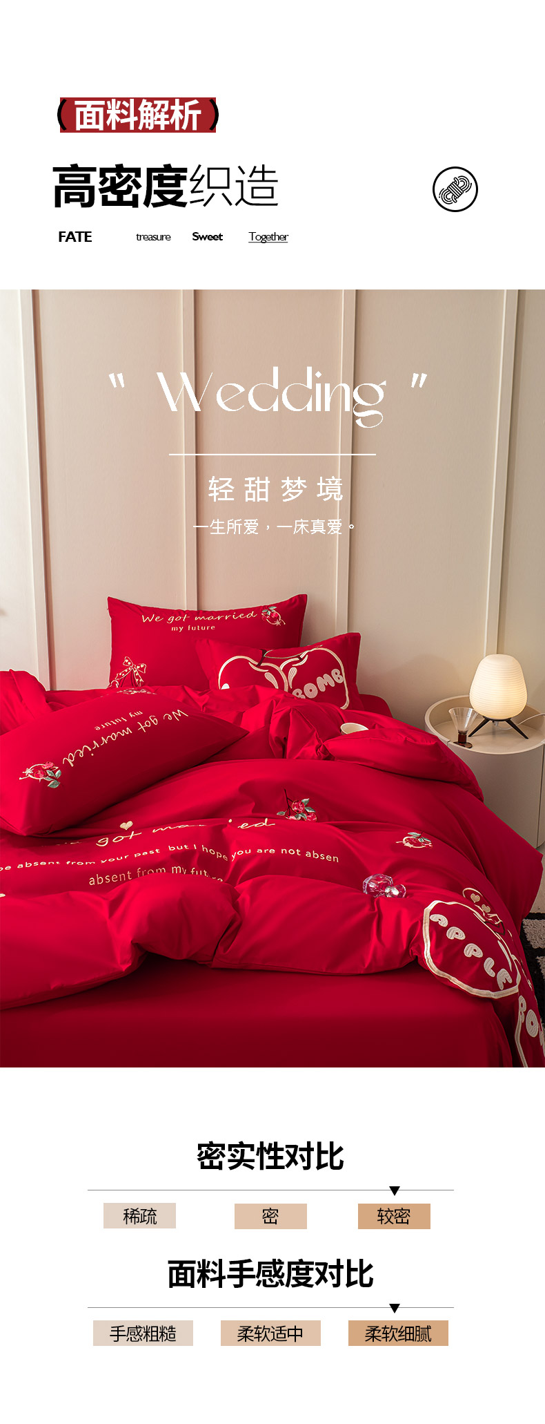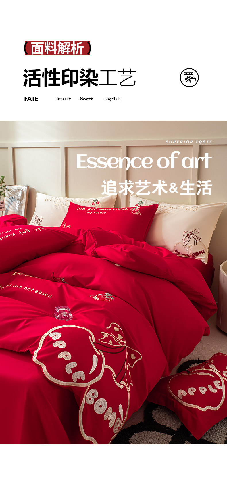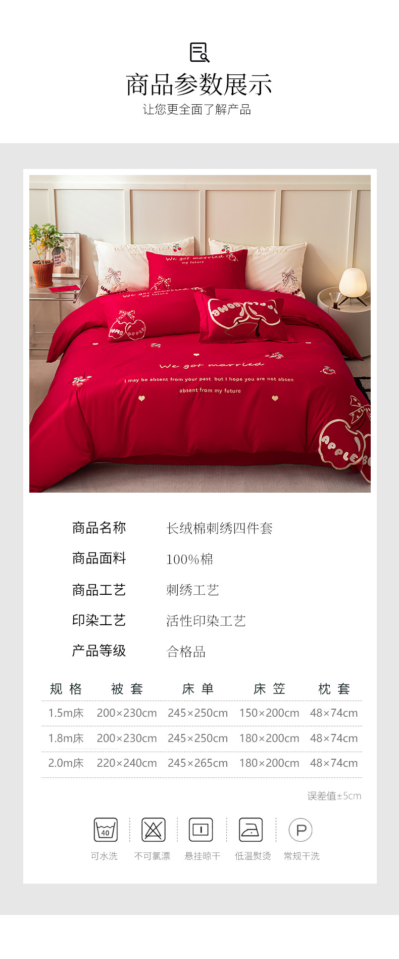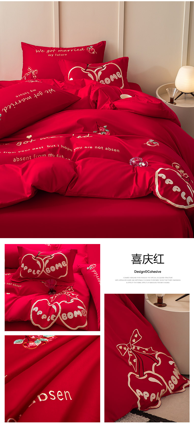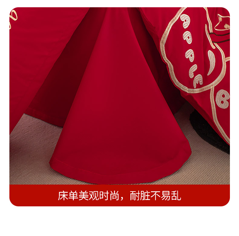 商品名称: 婚庆100支贡缎长绒棉四件套全棉纯棉刺绣结婚床单被套红色纯色床笠款床上用品 苹安喜乐-喜庆红