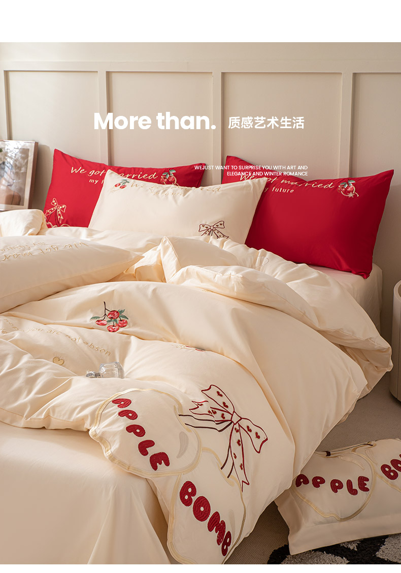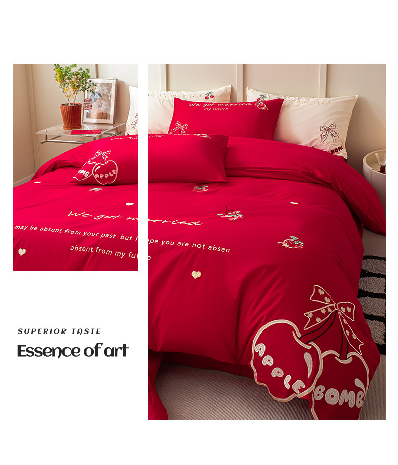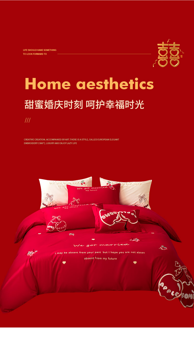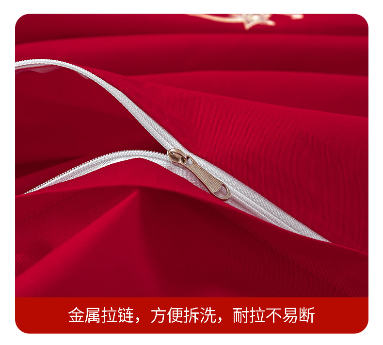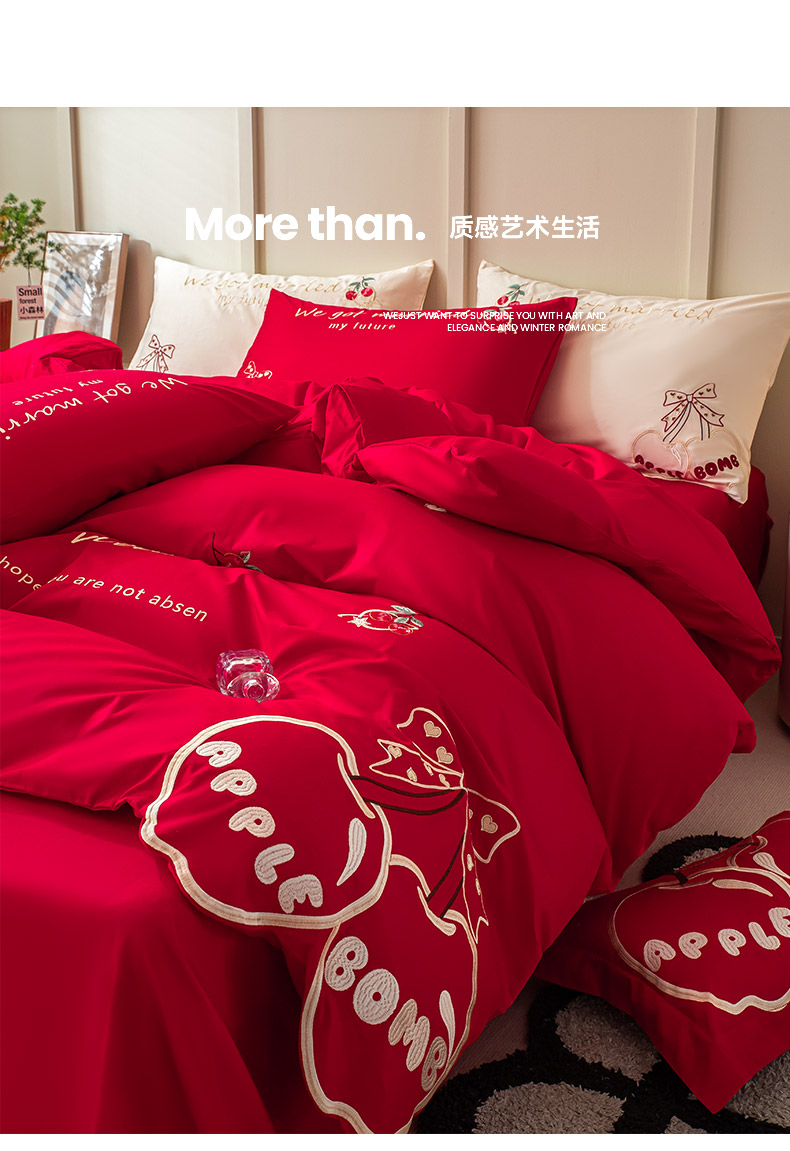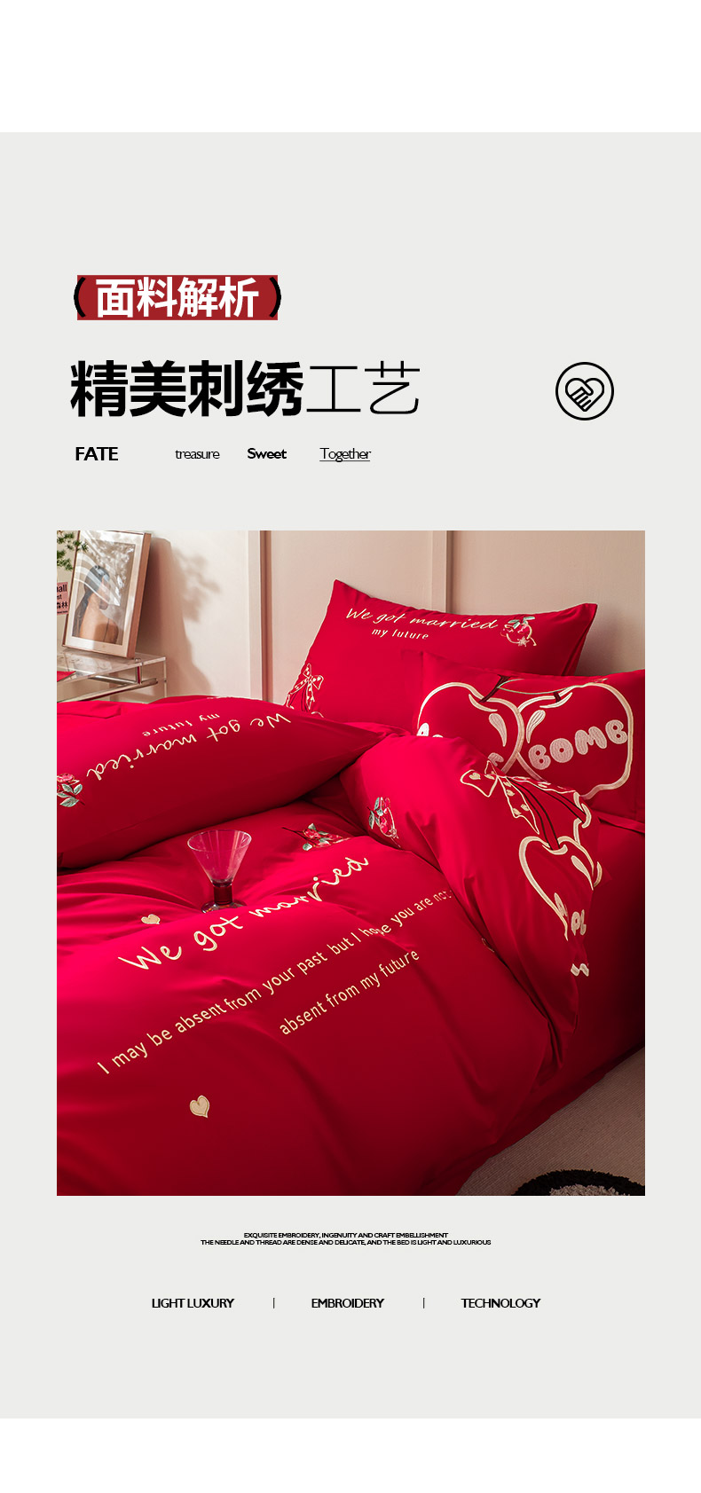 商品名称: 婚庆100支贡缎长绒棉四件套全棉纯棉刺绣结婚床单被套红色纯色床笠款床上用品 苹安喜乐-喜庆红