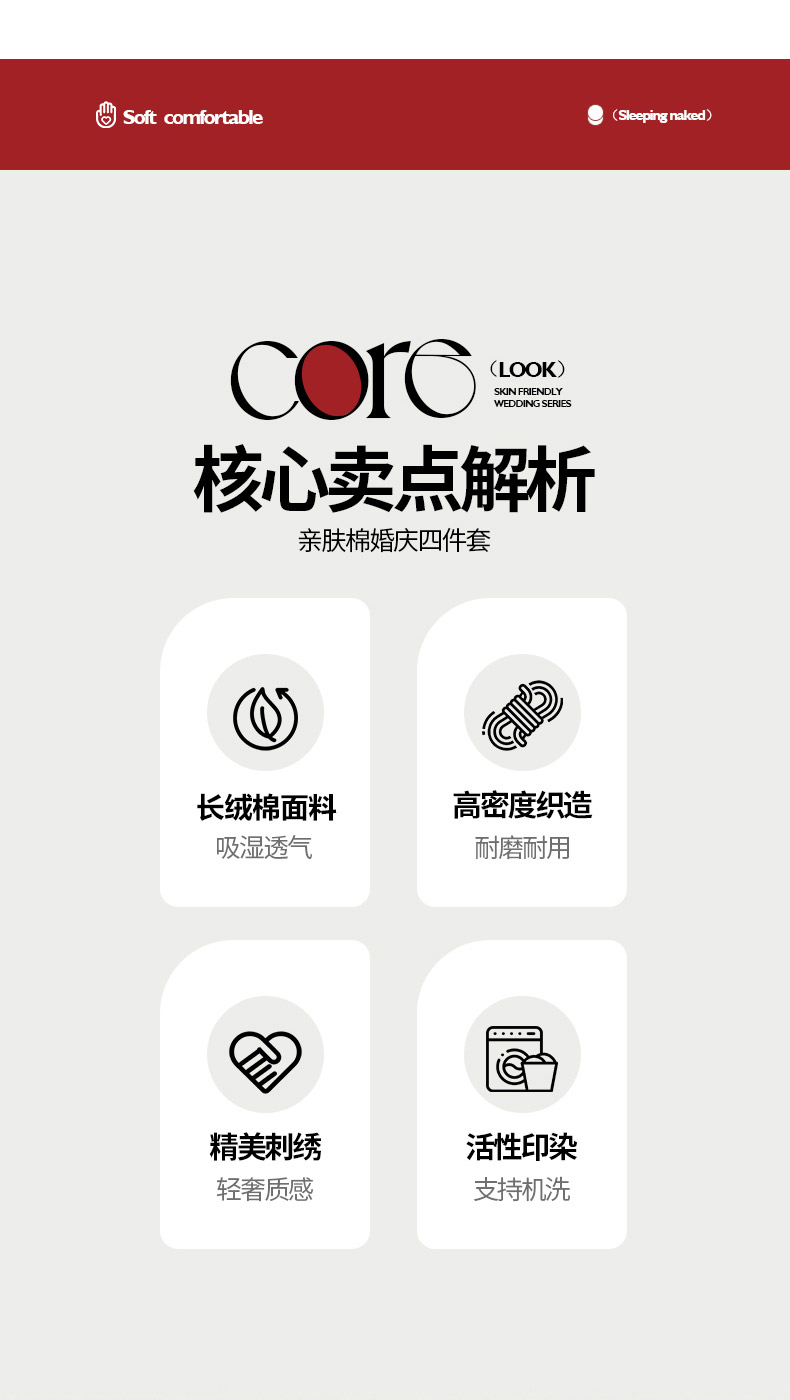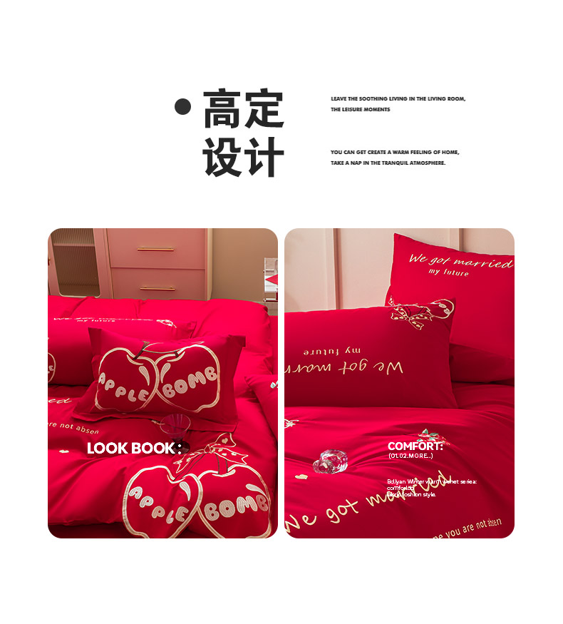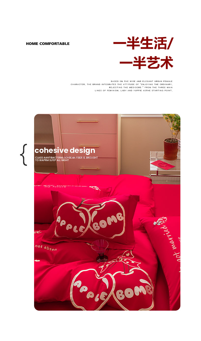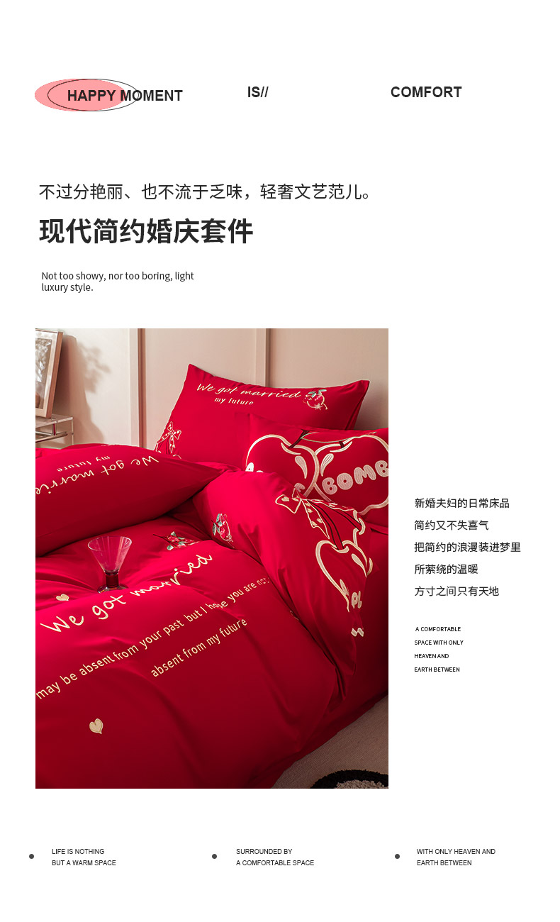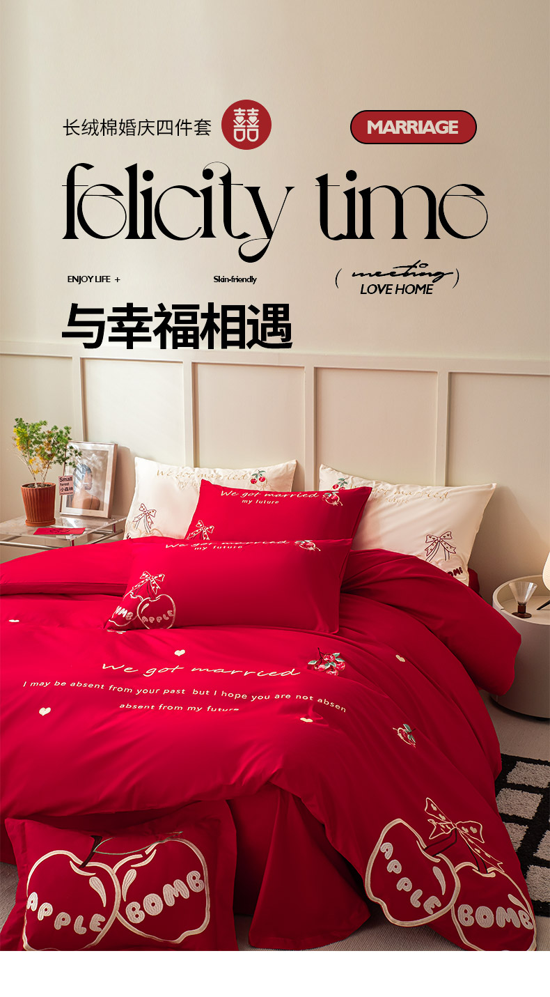 商品名称: 婚庆100支贡缎长绒棉四件套全棉纯棉刺绣结婚床单被套红色纯色床笠款床上用品 苹安喜乐-喜庆红