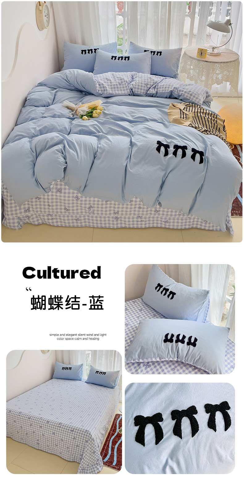 当前位置: 91家纺网 > 商品网购 > 床品套件 > 四件套 > 其它四件套 > 玉海棠家纺 2024新款超柔云朵棉毛巾绣四件套 蝴蝶结-蓝