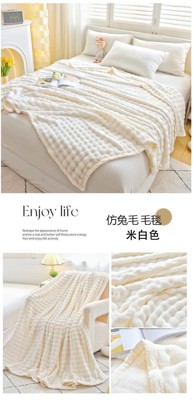 启优家纺 2024新款仿兔毛泡泡绒毛毯兔兔绒毛毯法兰绒毛毯 奶白