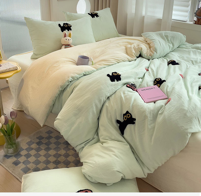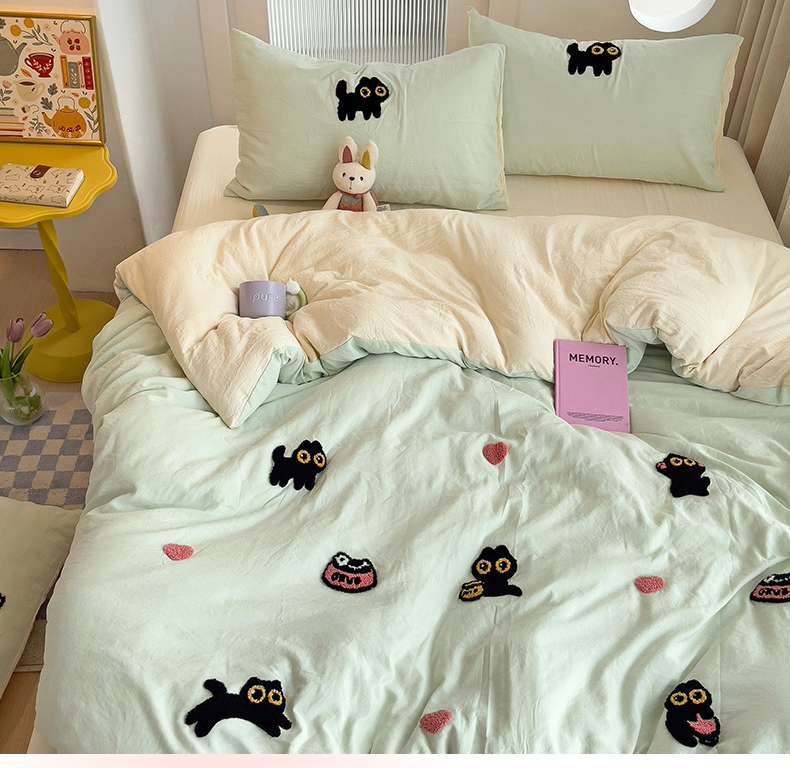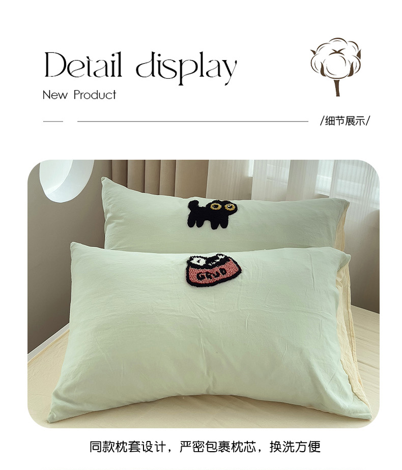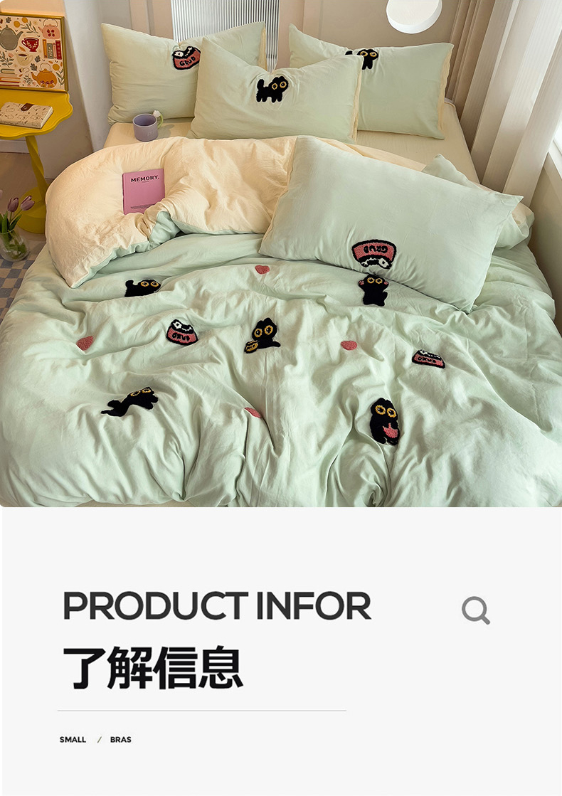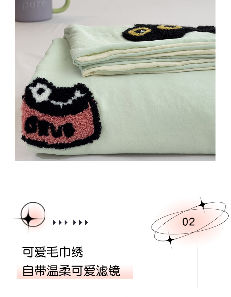 商品名称:韩巢家纺 2024新款四季通用超柔水洗棉毛巾绣单件被套-幸运猫系列(提供卖家秀 ) 幸运猫浅绿黄