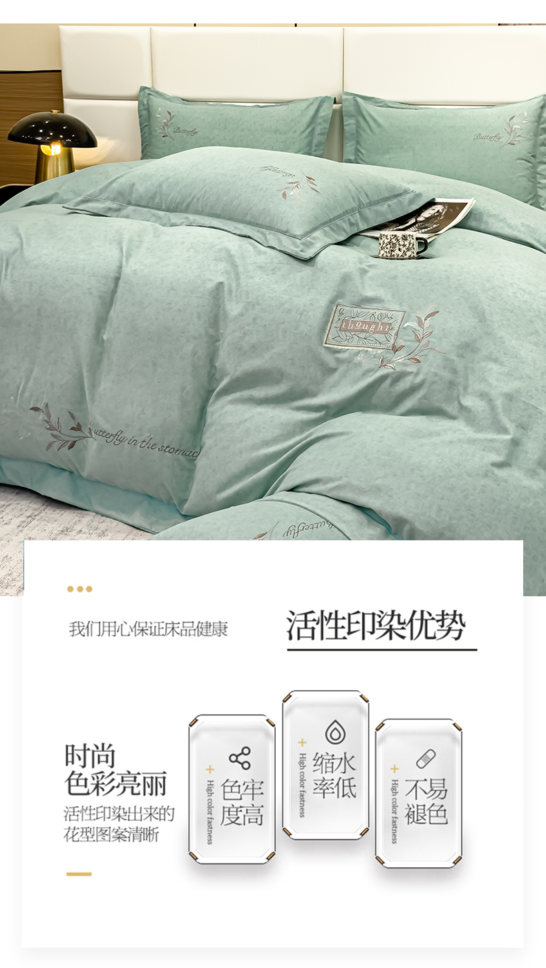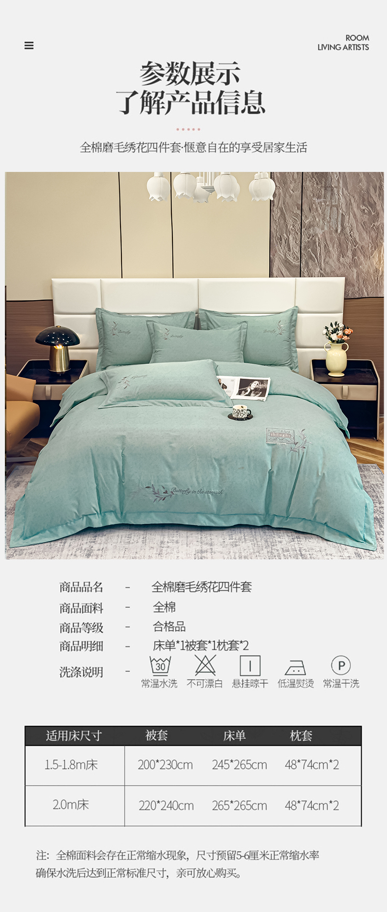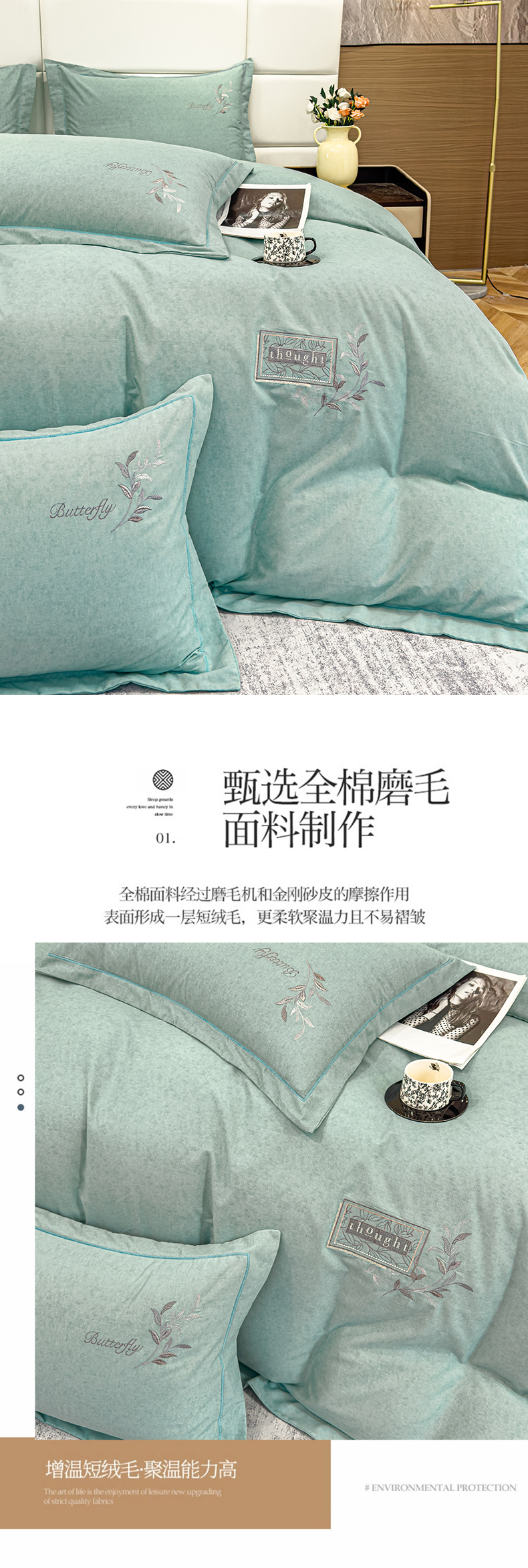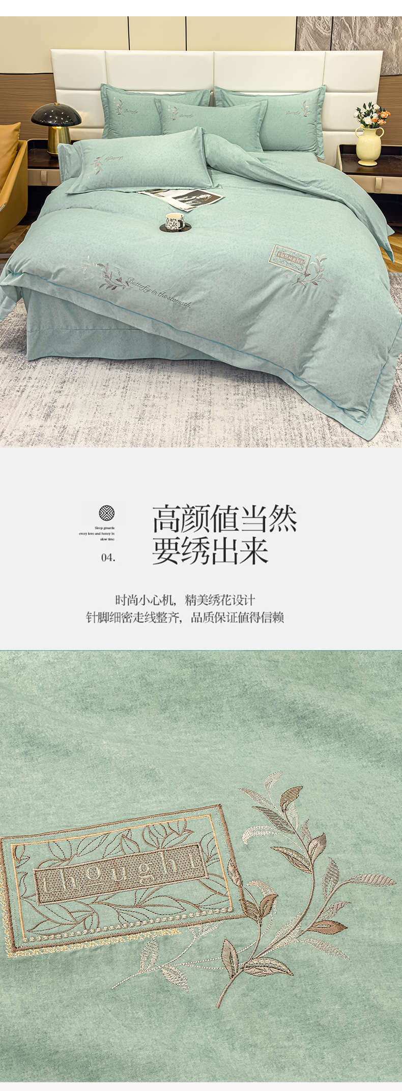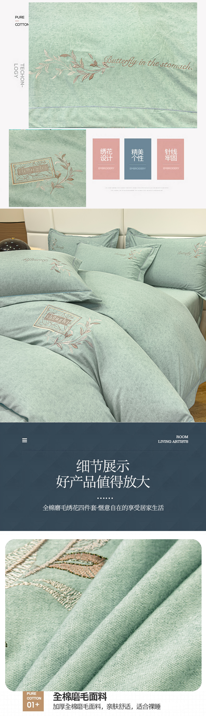 当前位置: 91家纺网 > 商品网购 > 床品套件 > 四件套 > 普通磨毛四件套 > U品汇 2024新品生态加厚长绒棉纯棉绣花全棉磨毛刺绣四件套宽边款直播 一叶知秋-浅绿