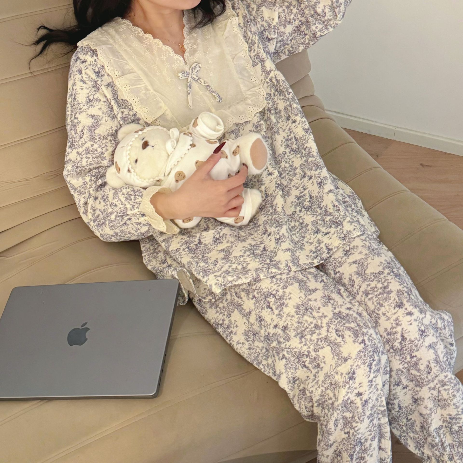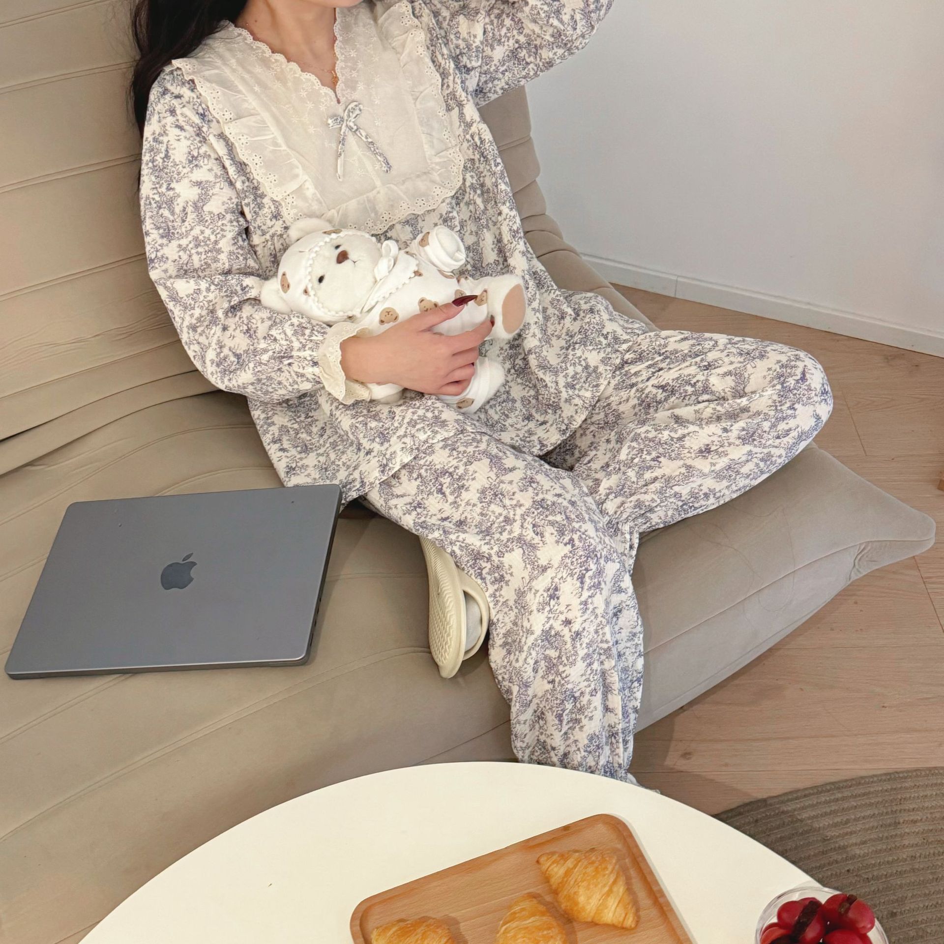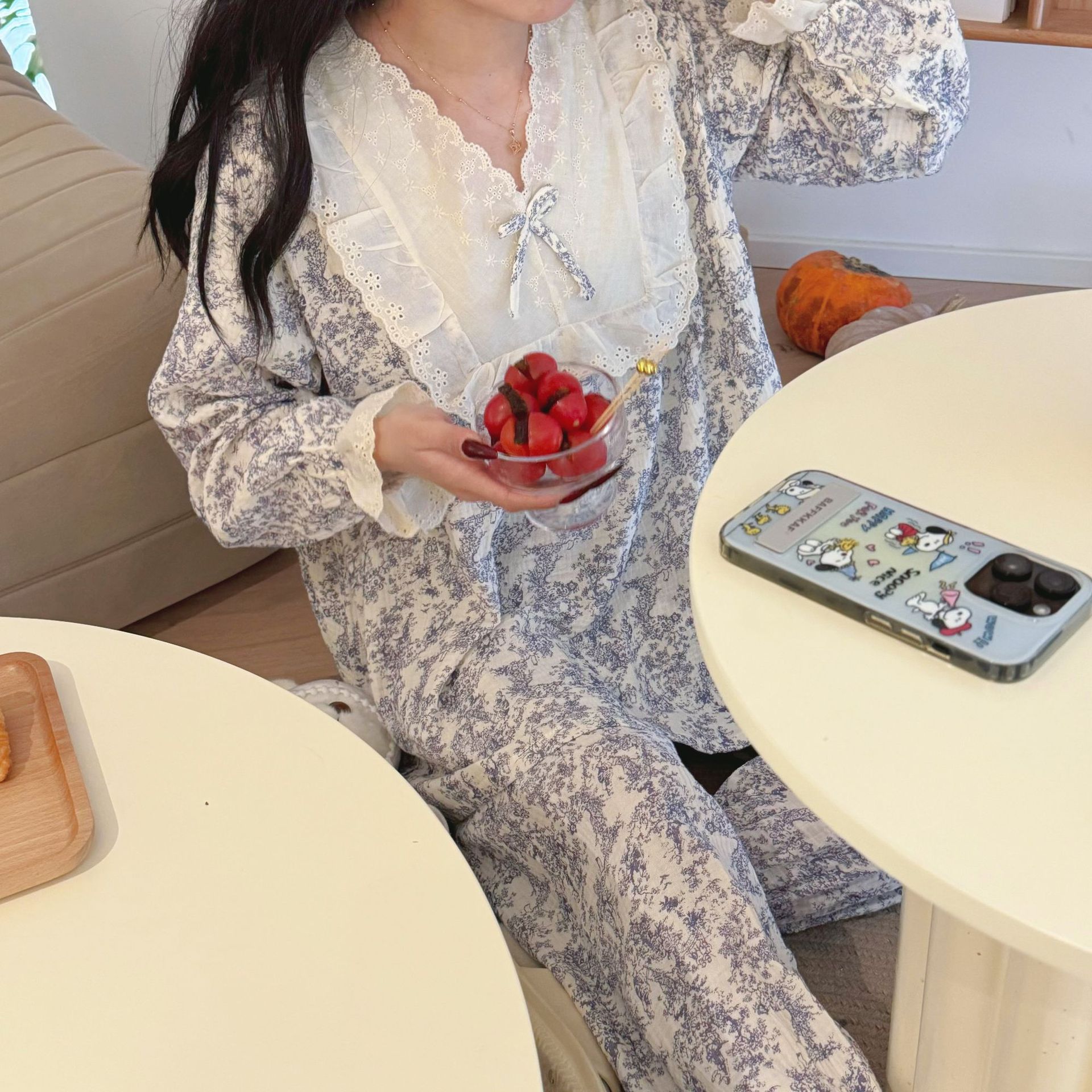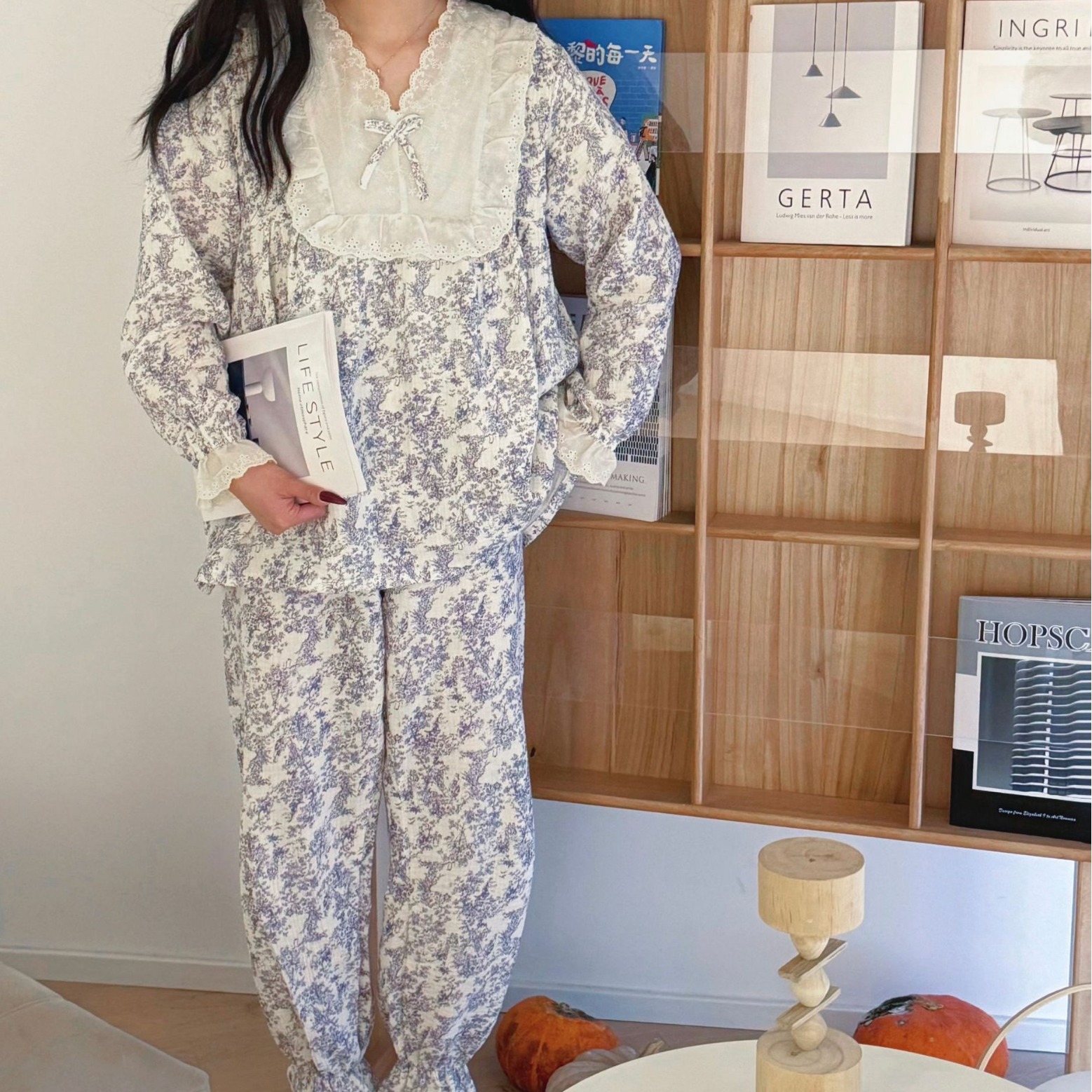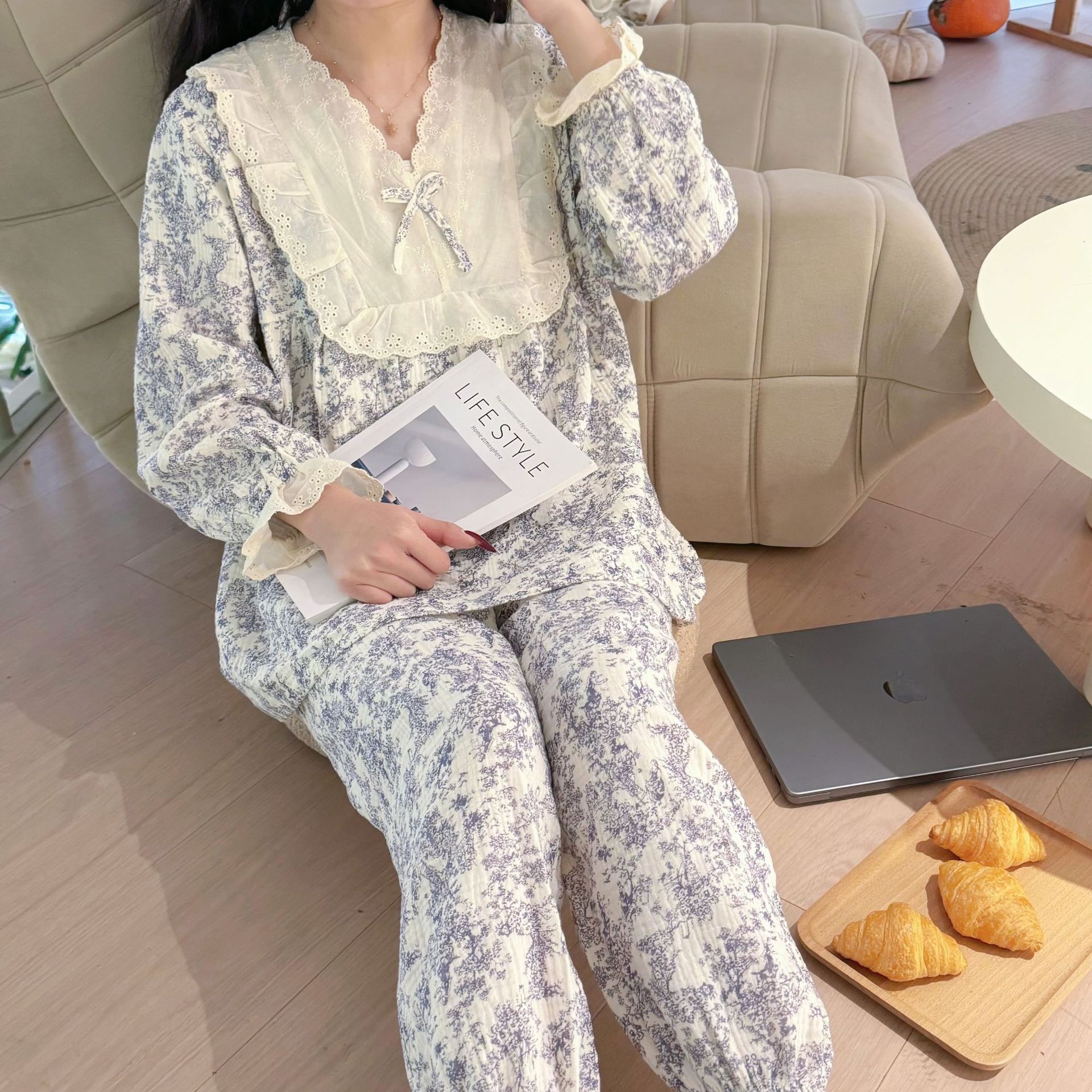 洛兰沙家居馆【只代发】【只代发】 2024新款棉纱绉布睡衣女春夏季甜美蕾丝印花韩版花边长袖套头家居服四季款 浅灰