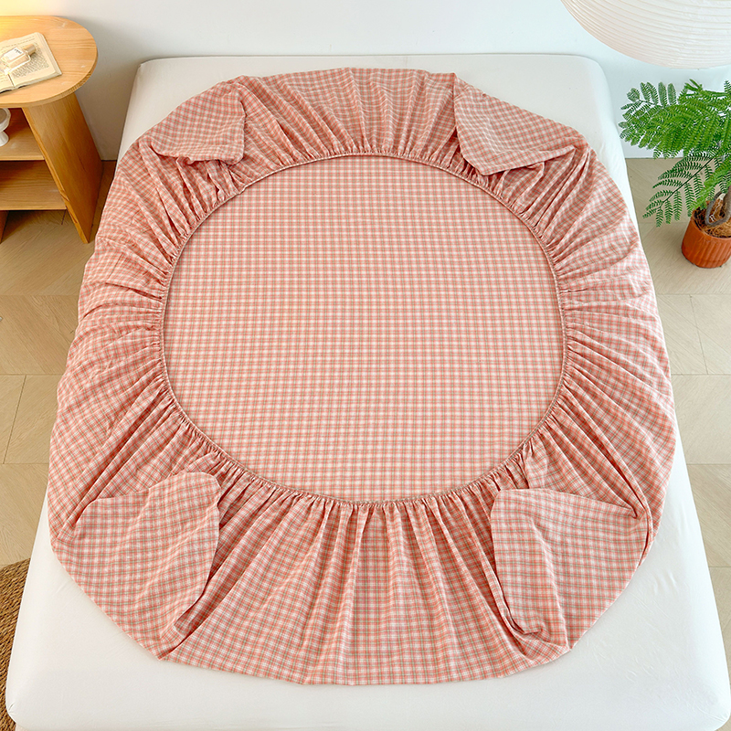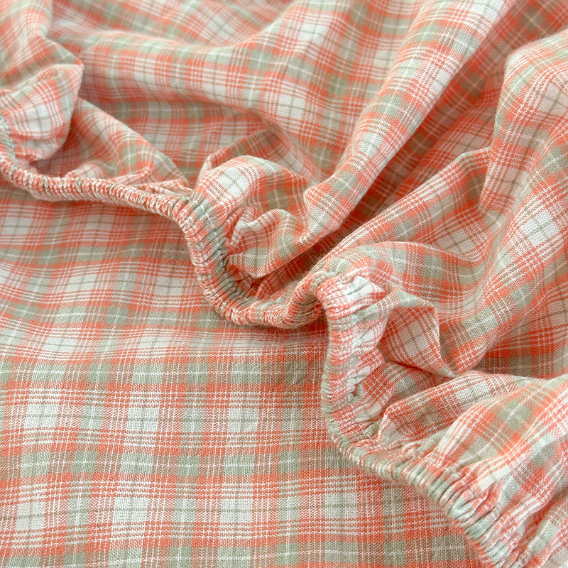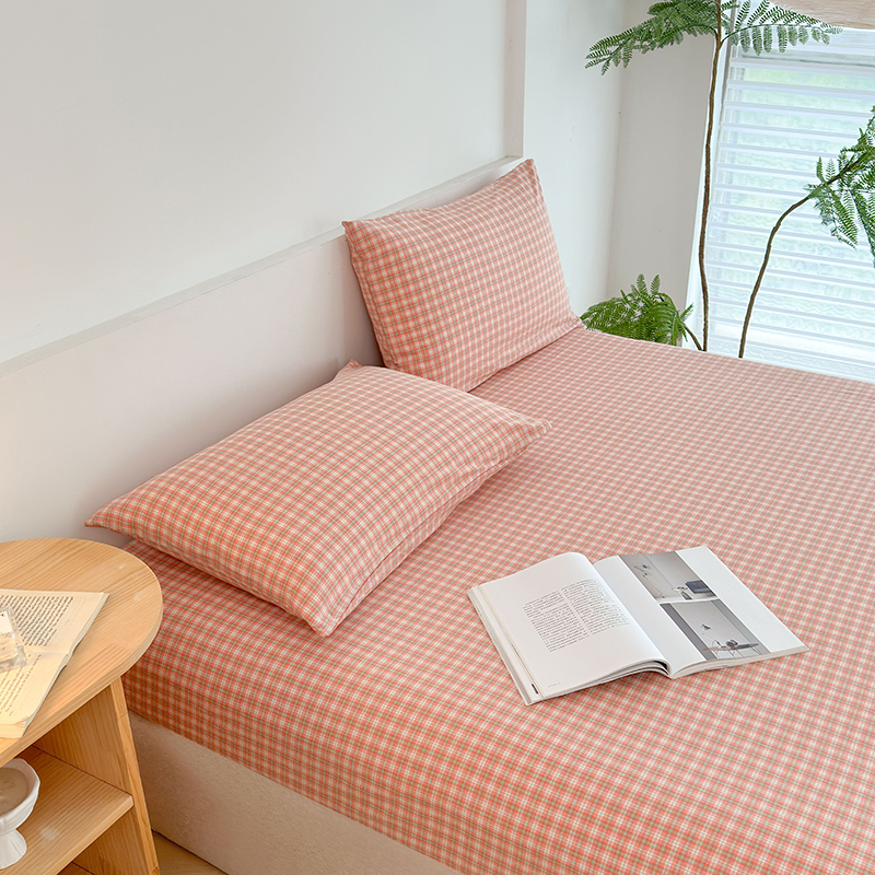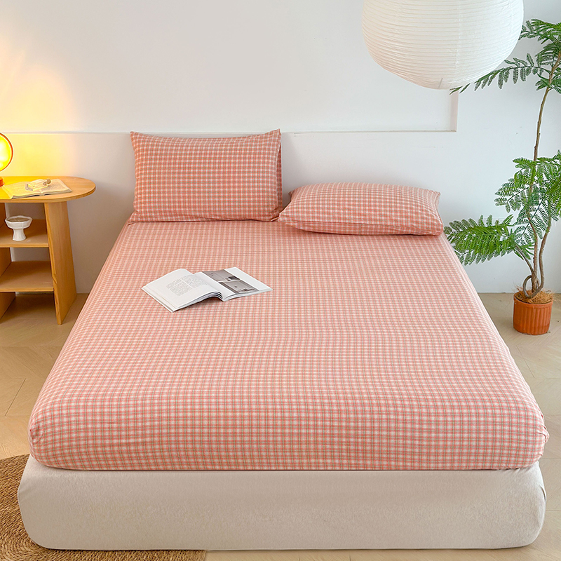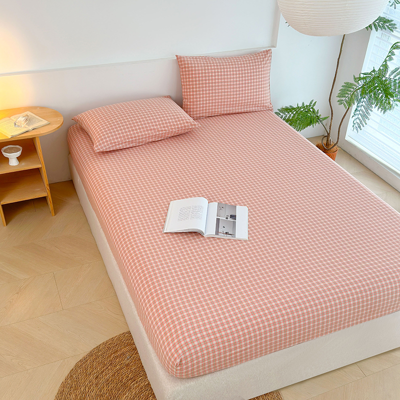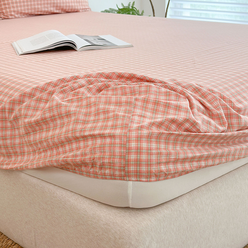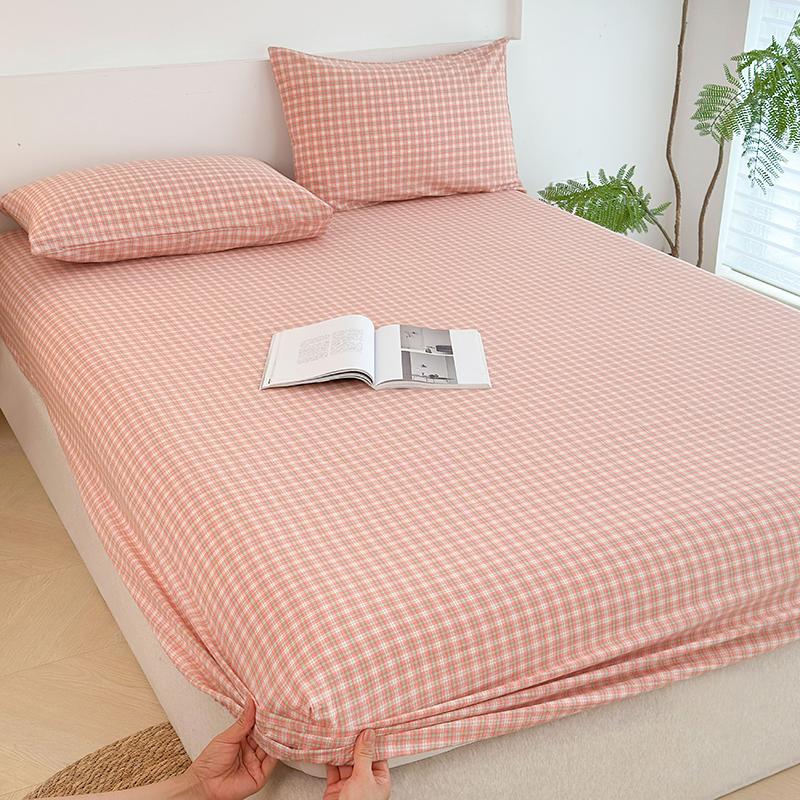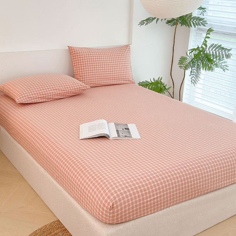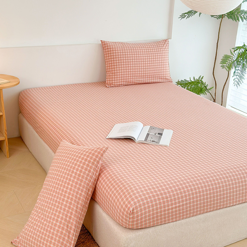 慕莎家纺 2024新款亲肤水洗色织床笠三件套 绿粉小格