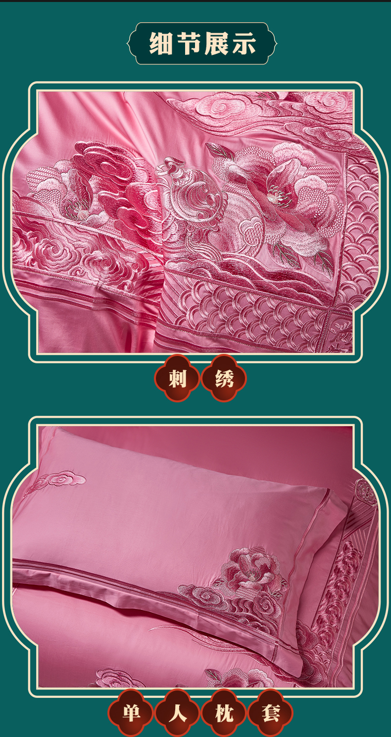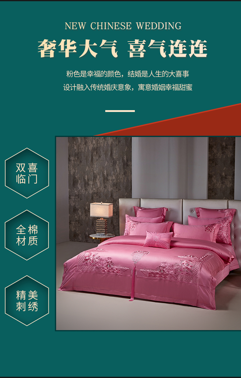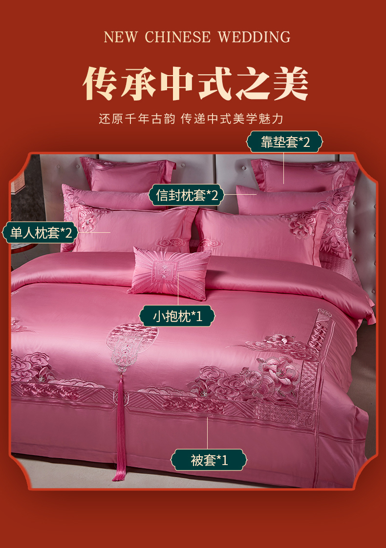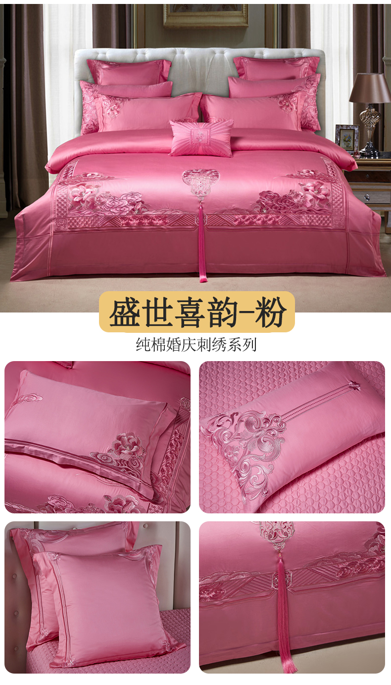 当前位置: 91家纺网 > 商品网购 > 床品套件 > 四件套 > 婚庆四件套 > 宏羽纺家纺 2024新款高支高密纯棉提花婚庆套件系列(控价680)盛世喜韵-粉