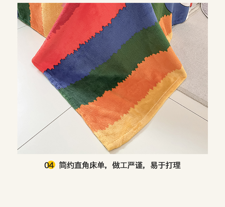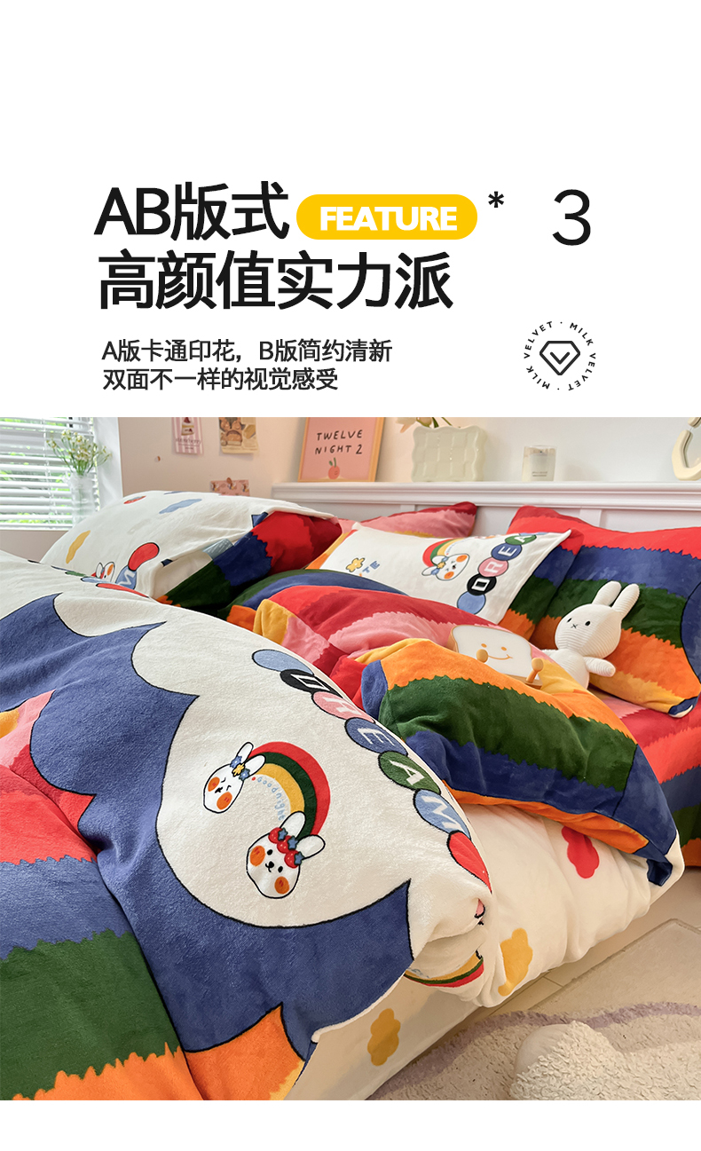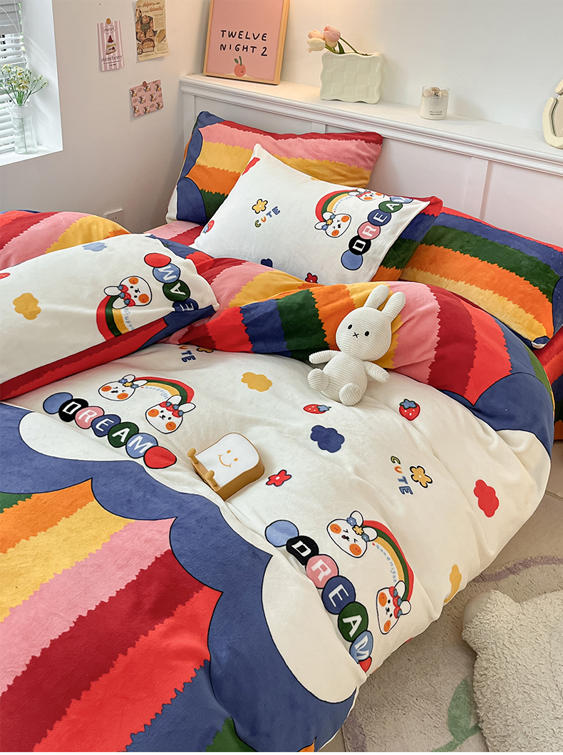 商品名称:桃子家居 2024新款小清新卡通加厚牛奶绒全工艺200克印花牛奶绒系列四件套 绒-彩虹兔