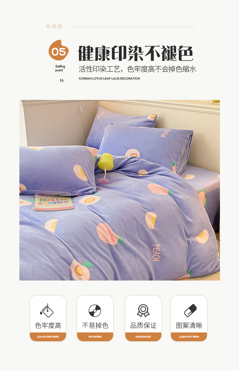 商品名称:桃子家居 2024新款小清新卡通加厚牛奶绒全工艺200克印花牛奶绒系列四件套 绒-紫色桃子