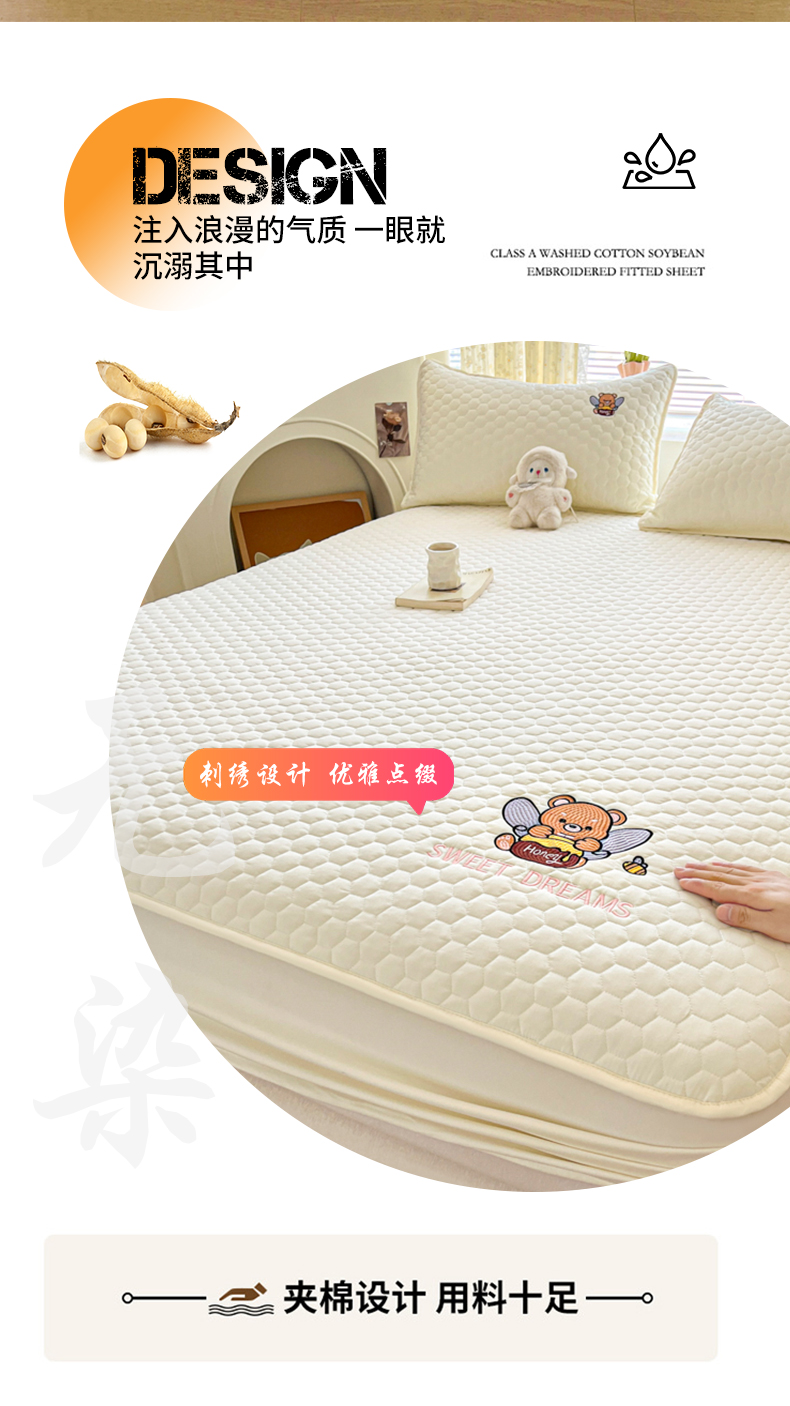 九亭家纺 2024新款A类水洗刺绣夹棉防水床笠床罩 防水MINMIN-米白