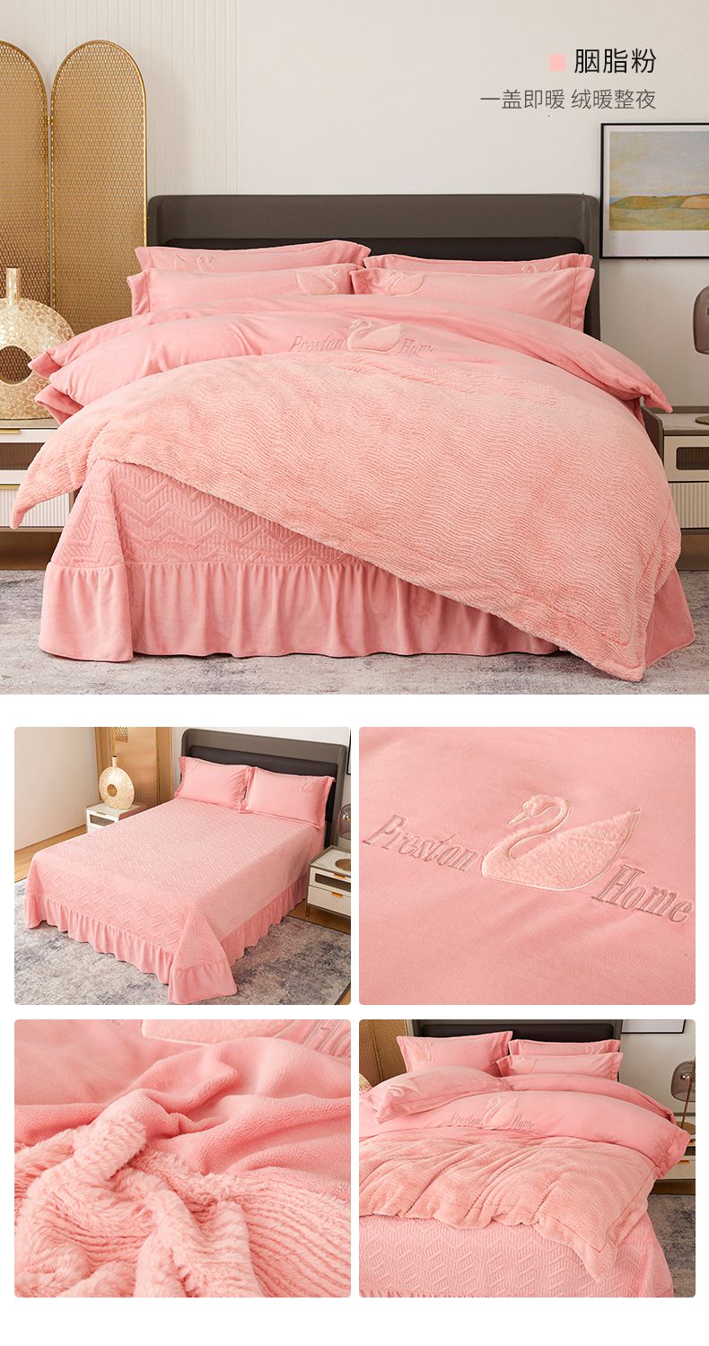 商品名称:新月家纺(锦威郎) 2024新款高克重牛奶绒全消光绗缝床盖床单四件套 胭脂粉