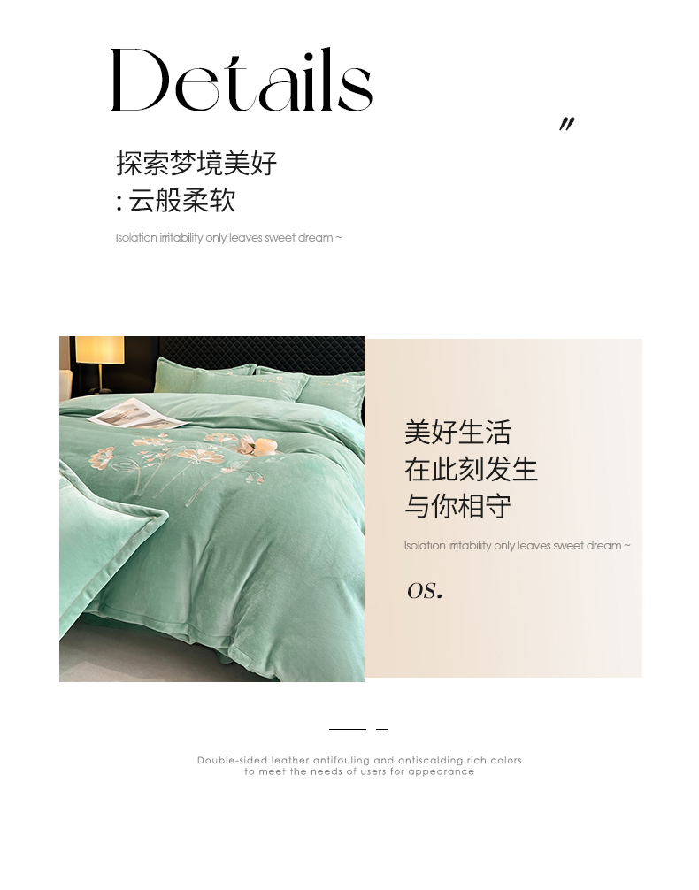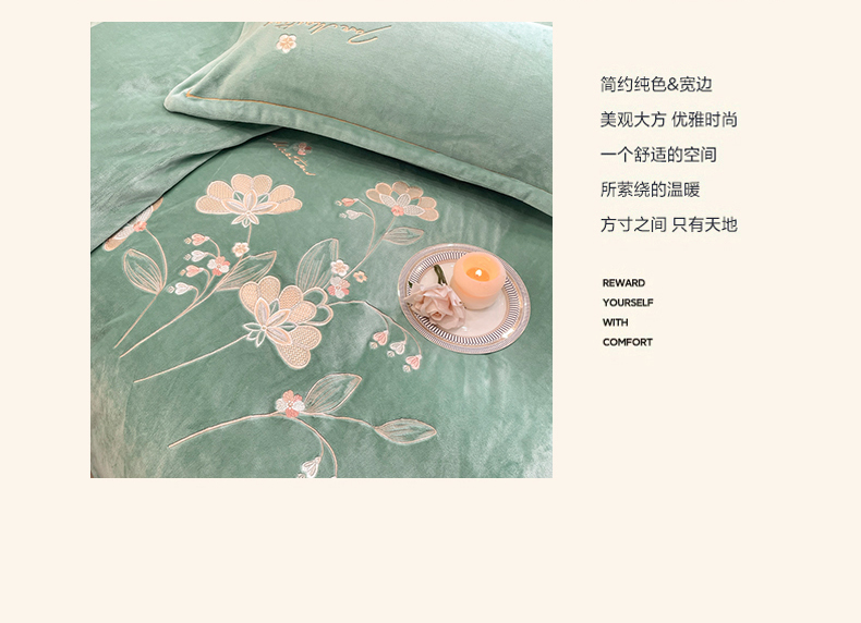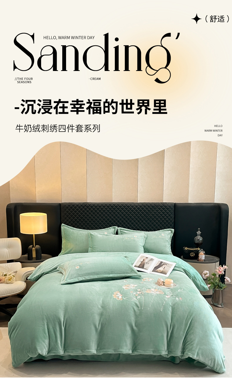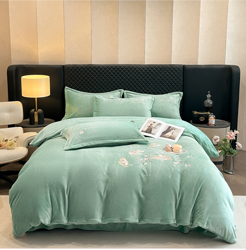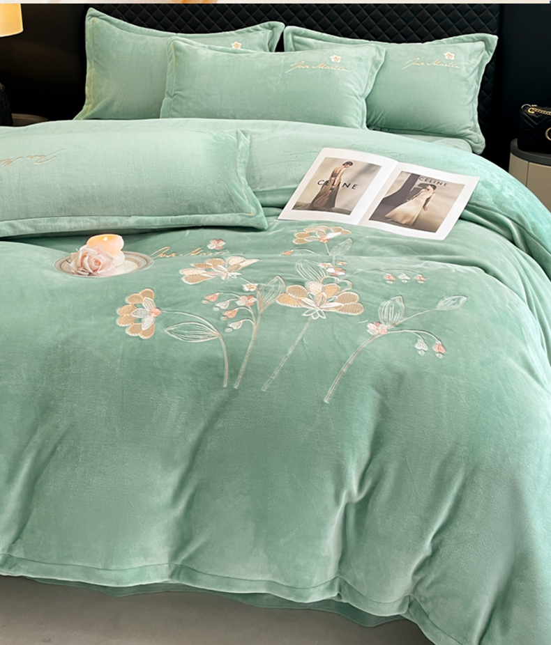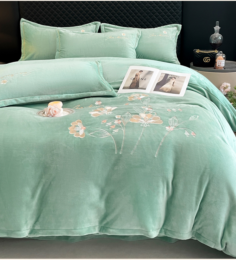 商品名称:畅畅家纺 2024秋冬新款牛奶绒绣花四件套 芳华-伊莉莎系列 伊莉莎-湖兰