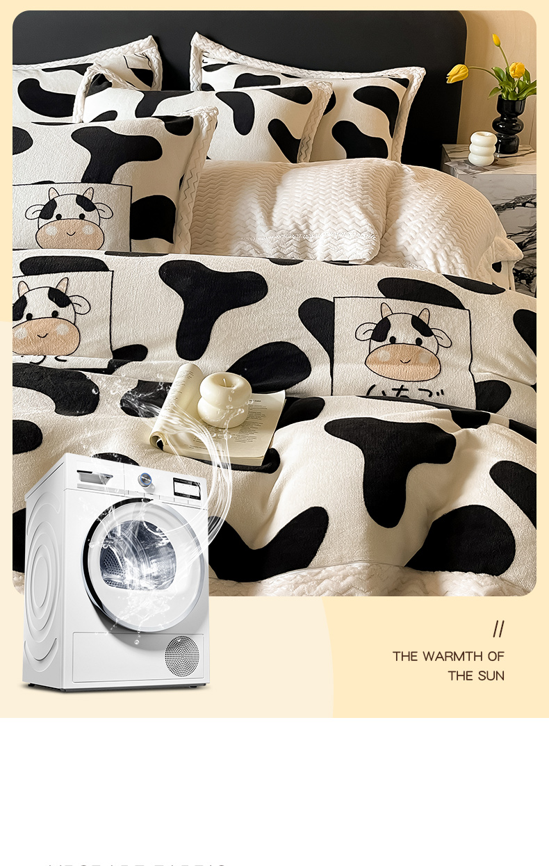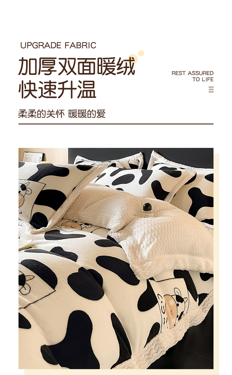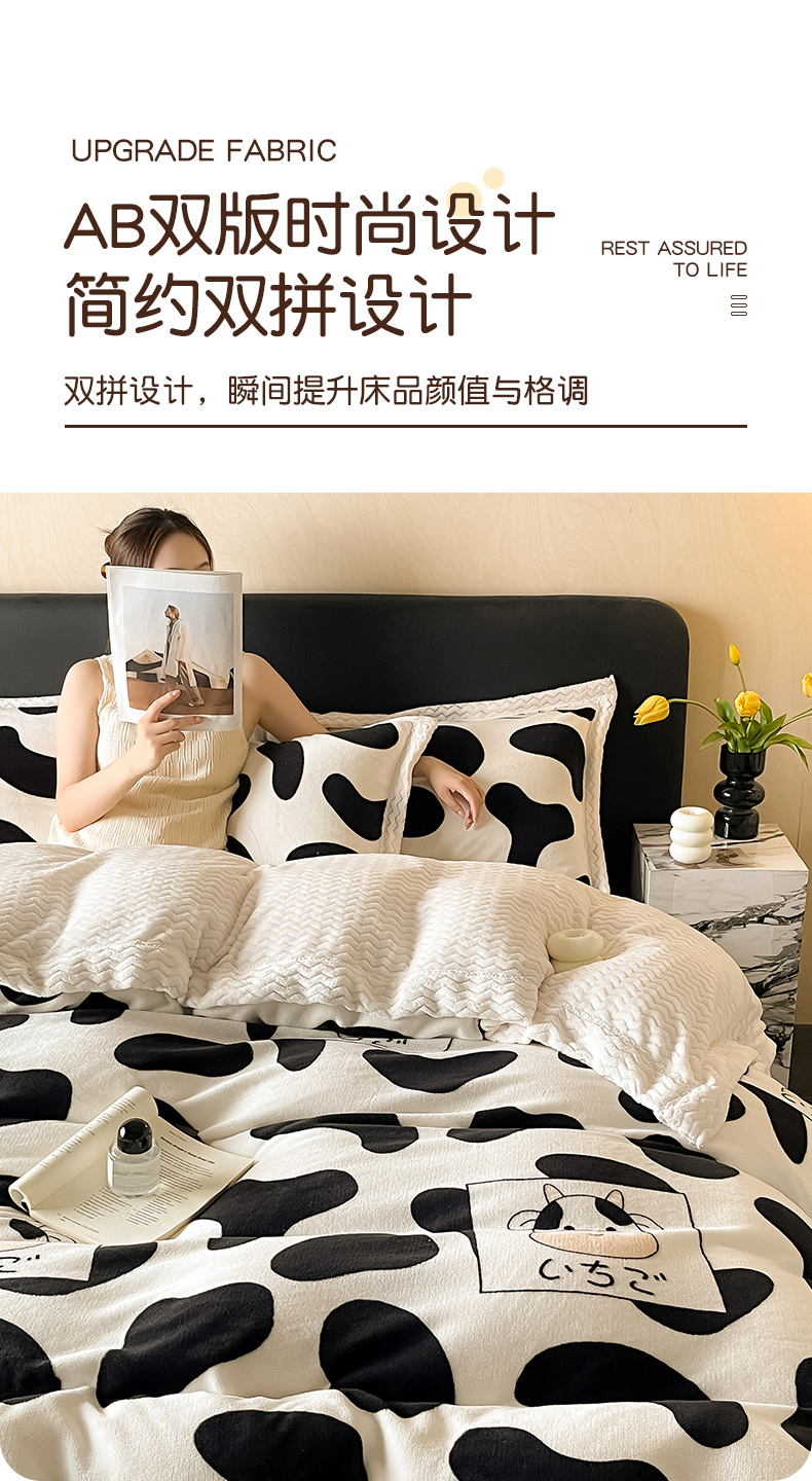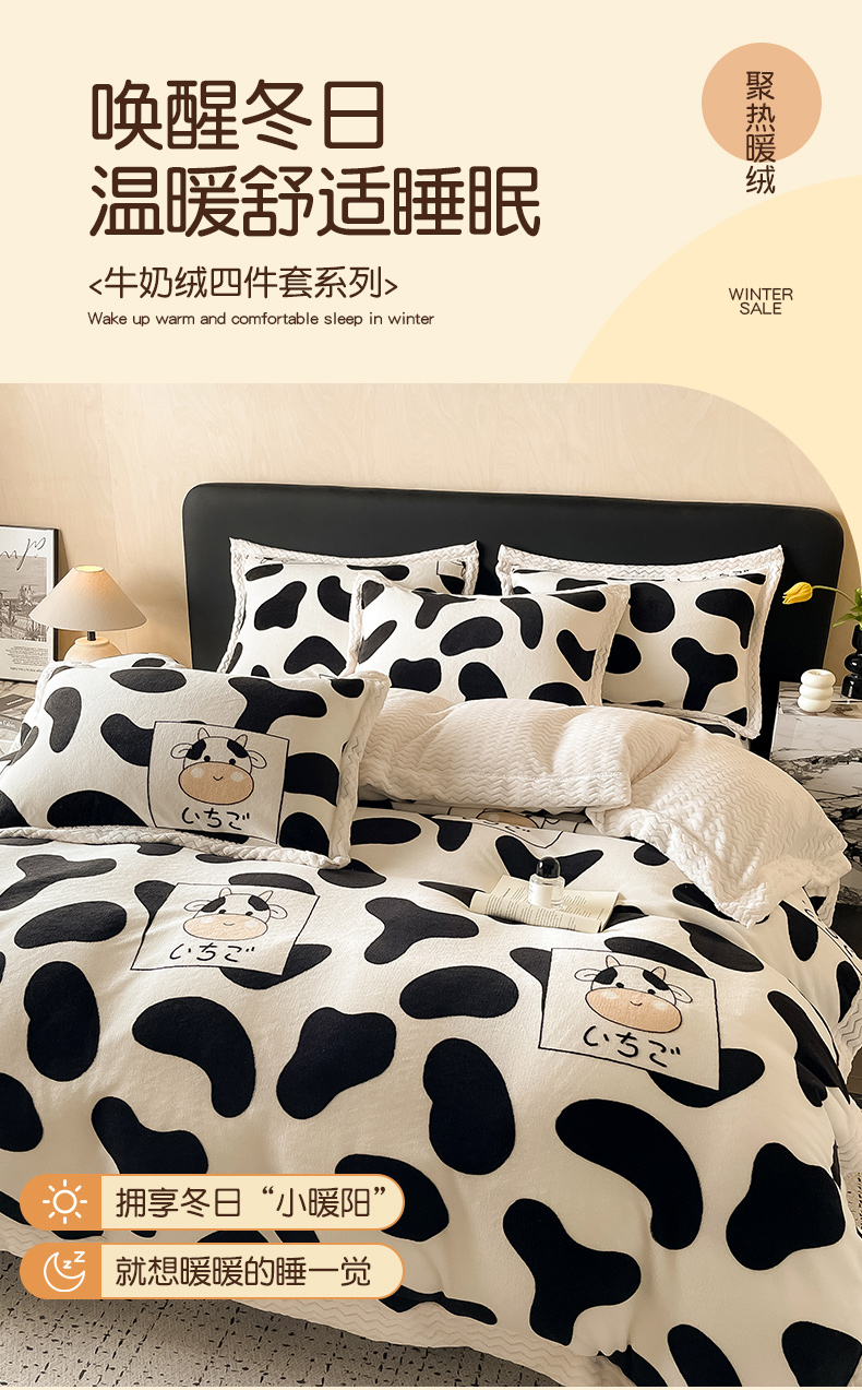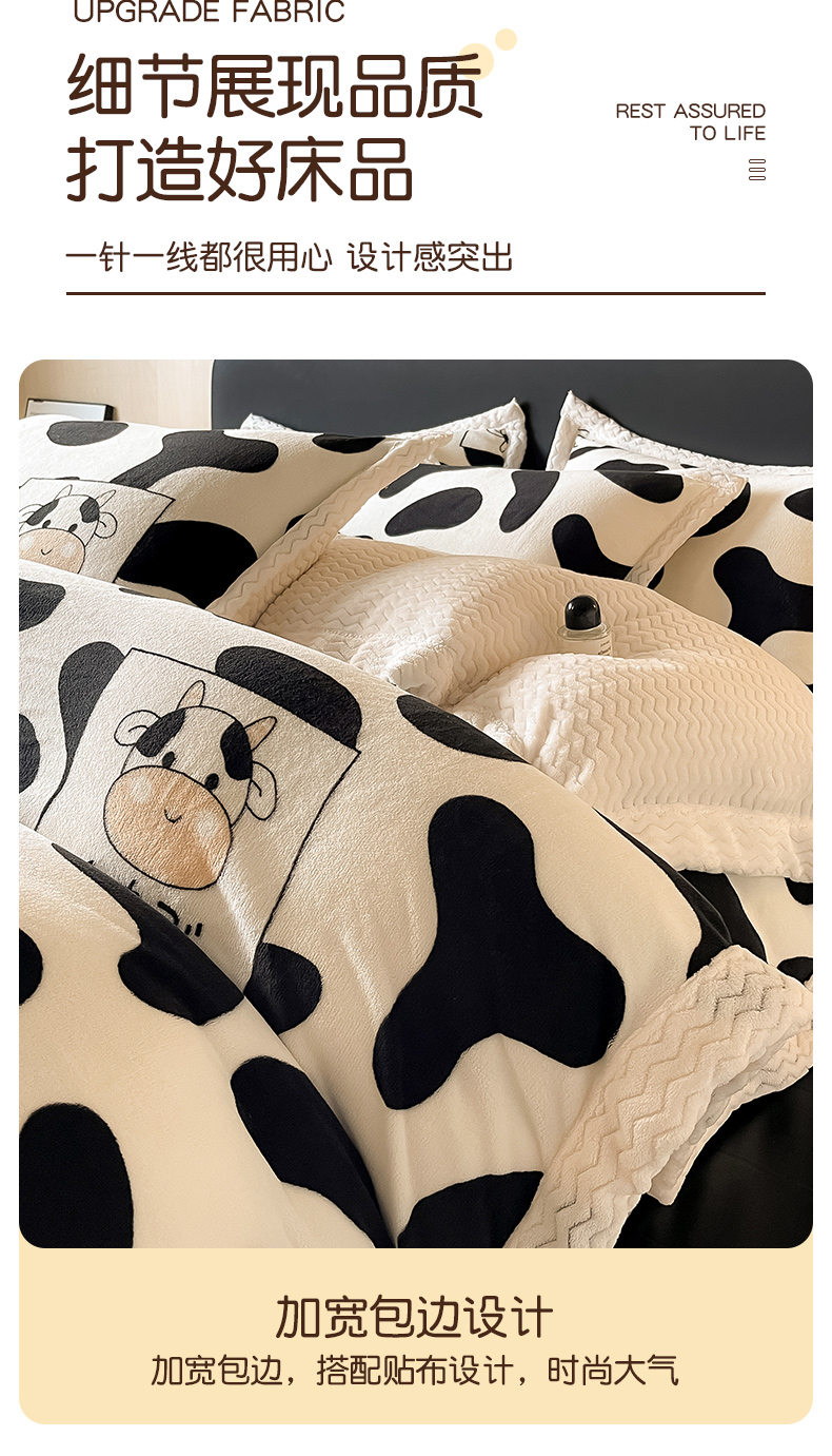 当前位置: 91家纺网 > 商品网购 > 床品套件 > 四件套 > 牛奶绒四件套 > 全季家居 2024新款A类纯色印花波浪大包边牛奶绒贝贝绒加厚保暖四件套 小奶牛