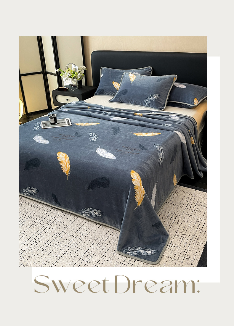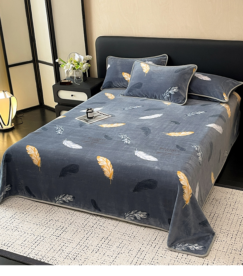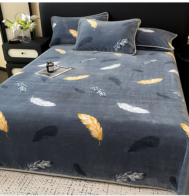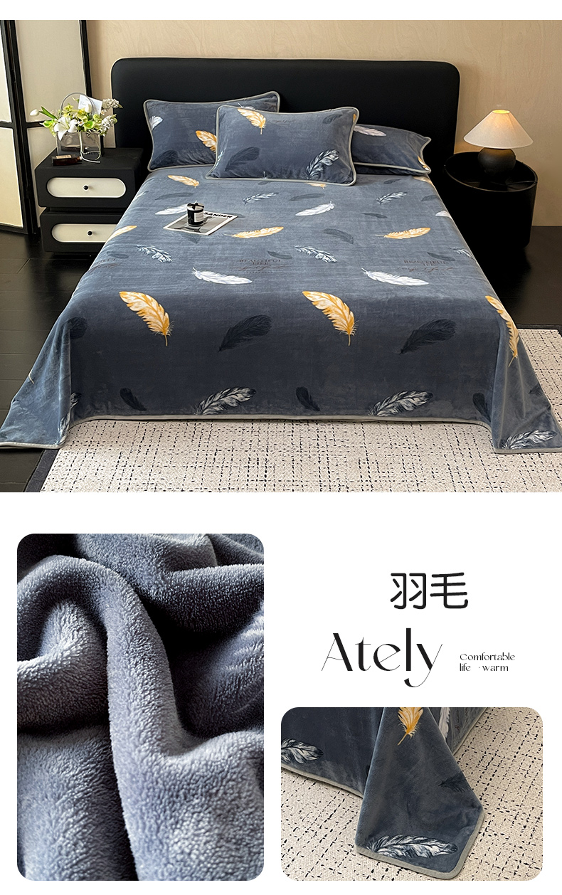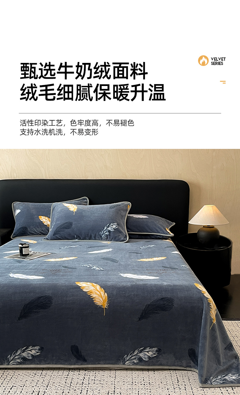 商品名称:全季家居 2024新款A类纯色印花高克重加厚保暖包边牛奶绒床单单件 羽毛