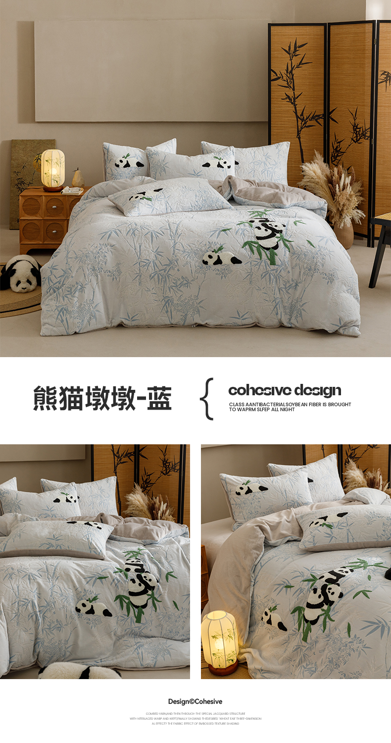 商品名称:蜜柚 2024新款230克全消光色烂牛奶绒毛巾绣四件套 熊猫墩墩-蓝
