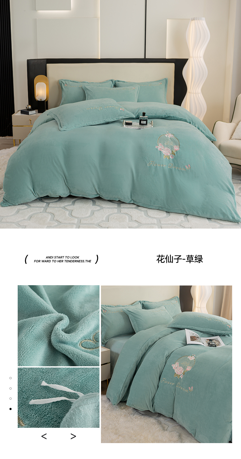 商品名称:晶缦家纺 2024新款高克重牛奶绒刺绣花四件套 花仙子-草绿