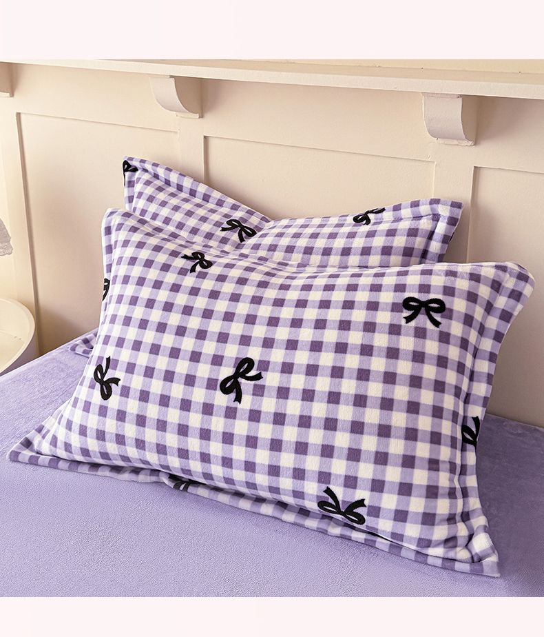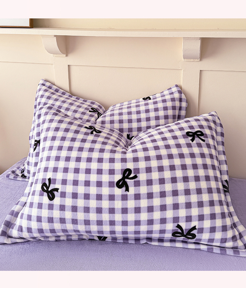 妖妖家纺 2024新款200克牛奶绒单枕套 格子蝴蝶结-紫