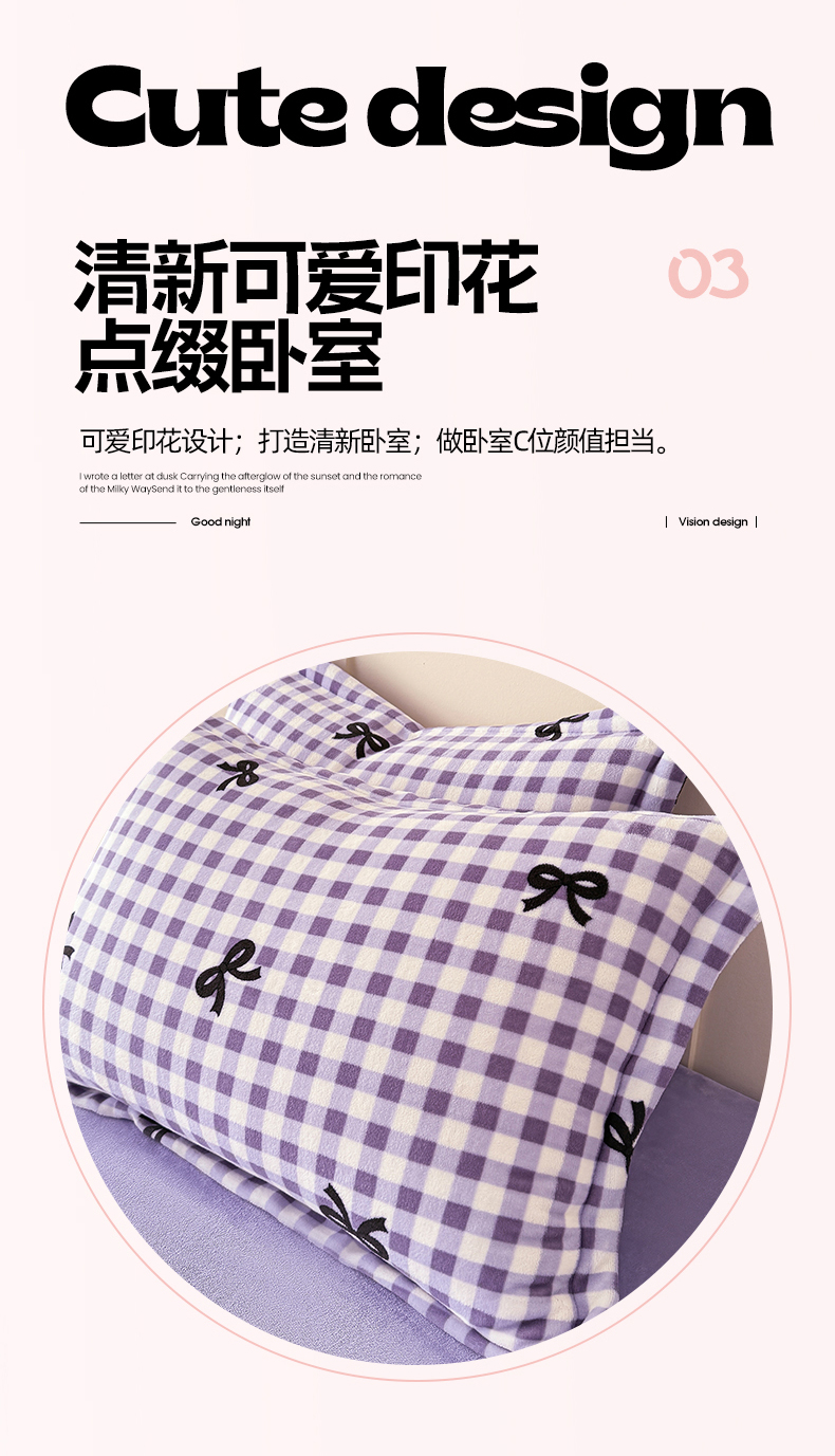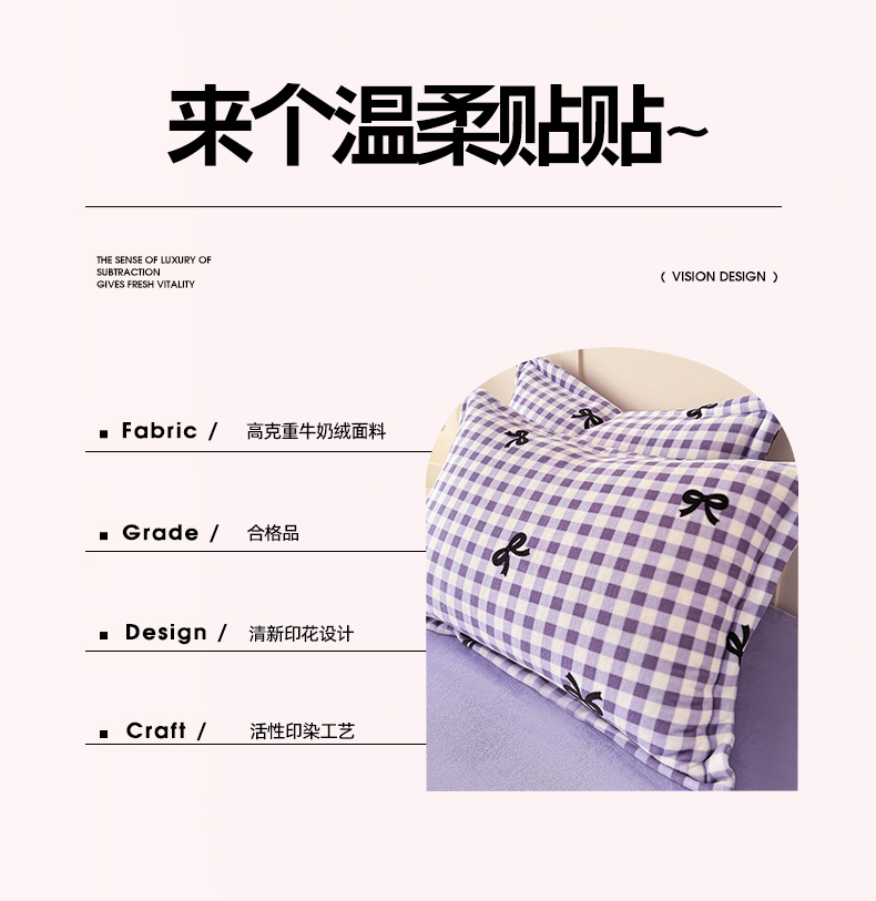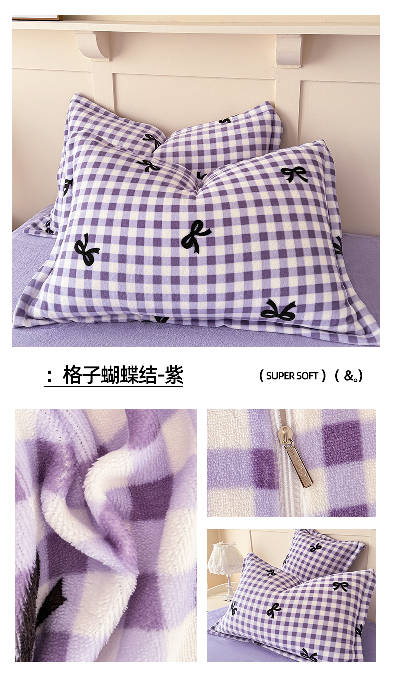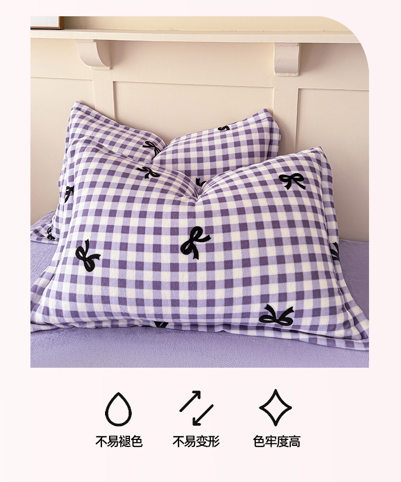 商品名称:妖妖家纺 2024新款200克牛奶绒单枕套 格子蝴蝶结-紫