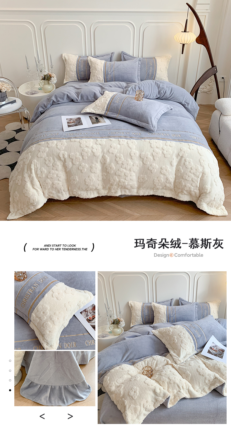 芯贝儿 2024款牛奶绒雕花绒绣花拼接四件套-玛奇朵 玛奇朵--慕斯灰