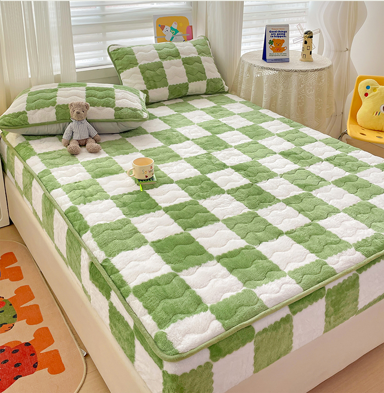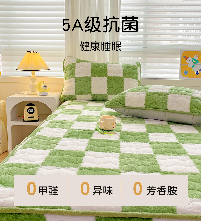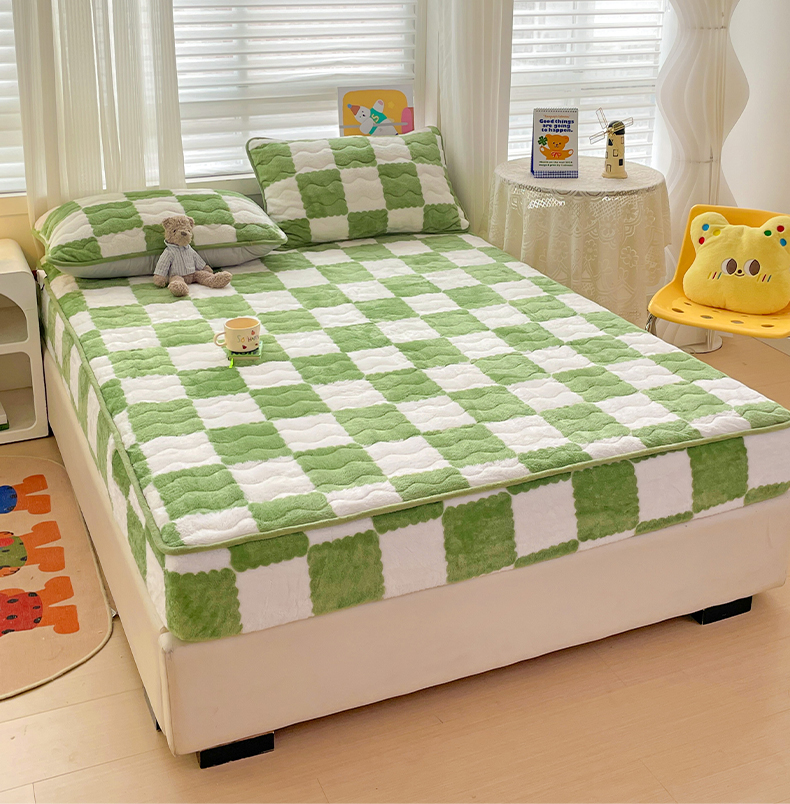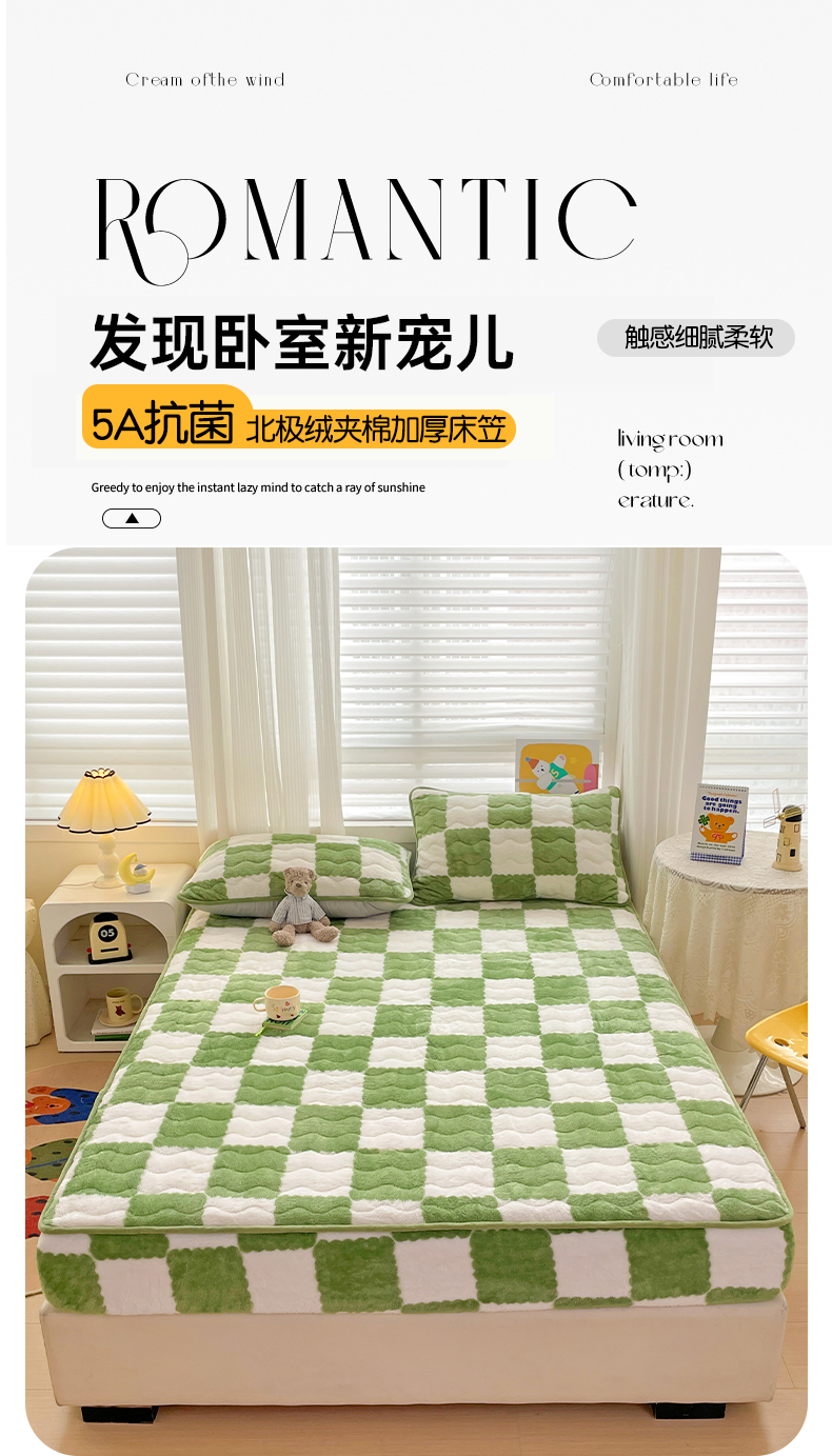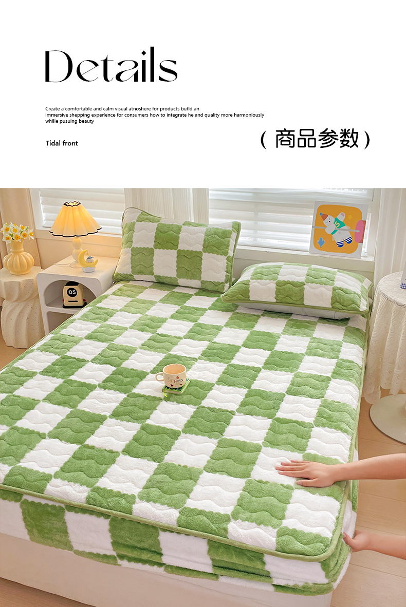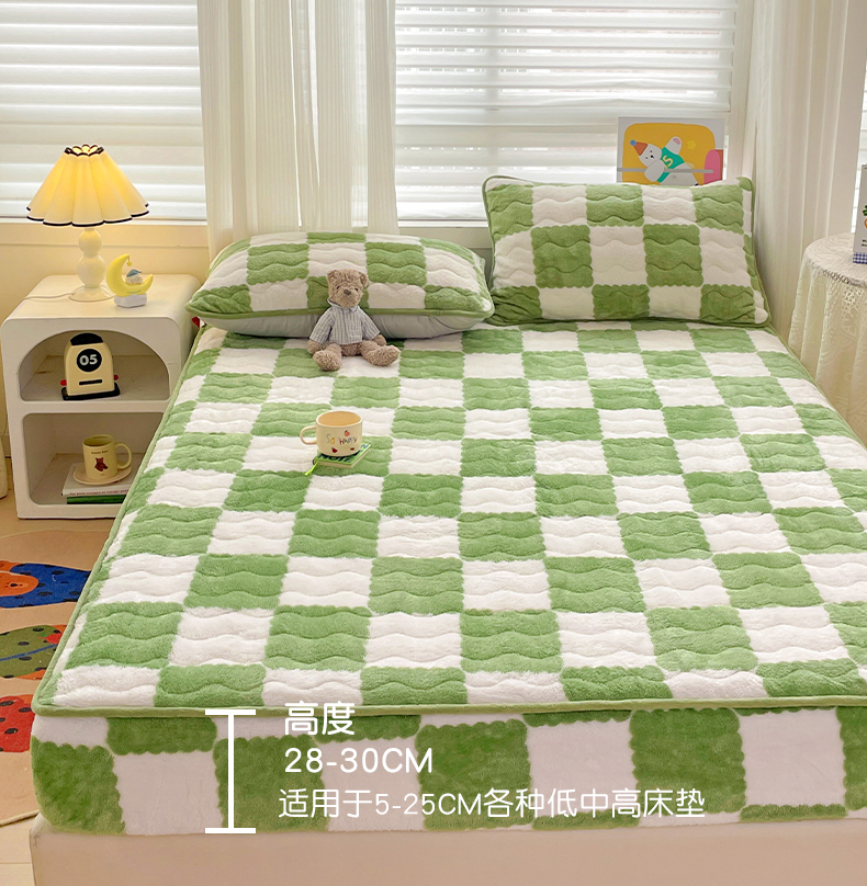 • 91家纺网 家纺一手货源 找家纺 叠派家纺 2024款秋冬北极绒加厚夹棉床笠三件套印花泰迪绒床垫保护罩-格子系列 绿