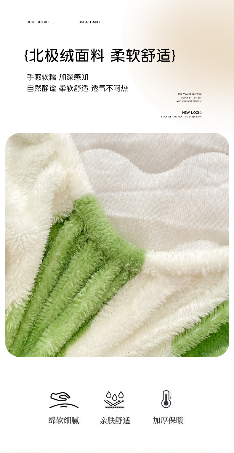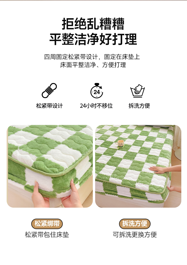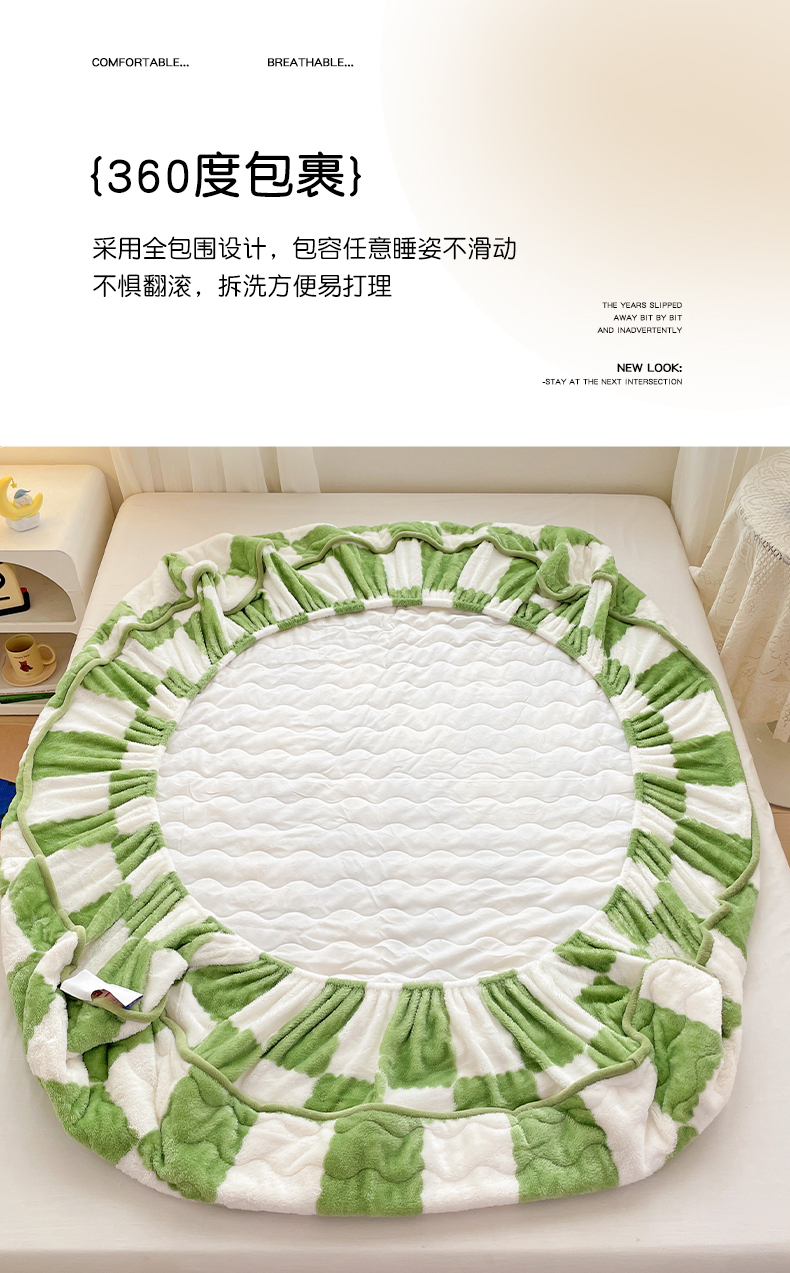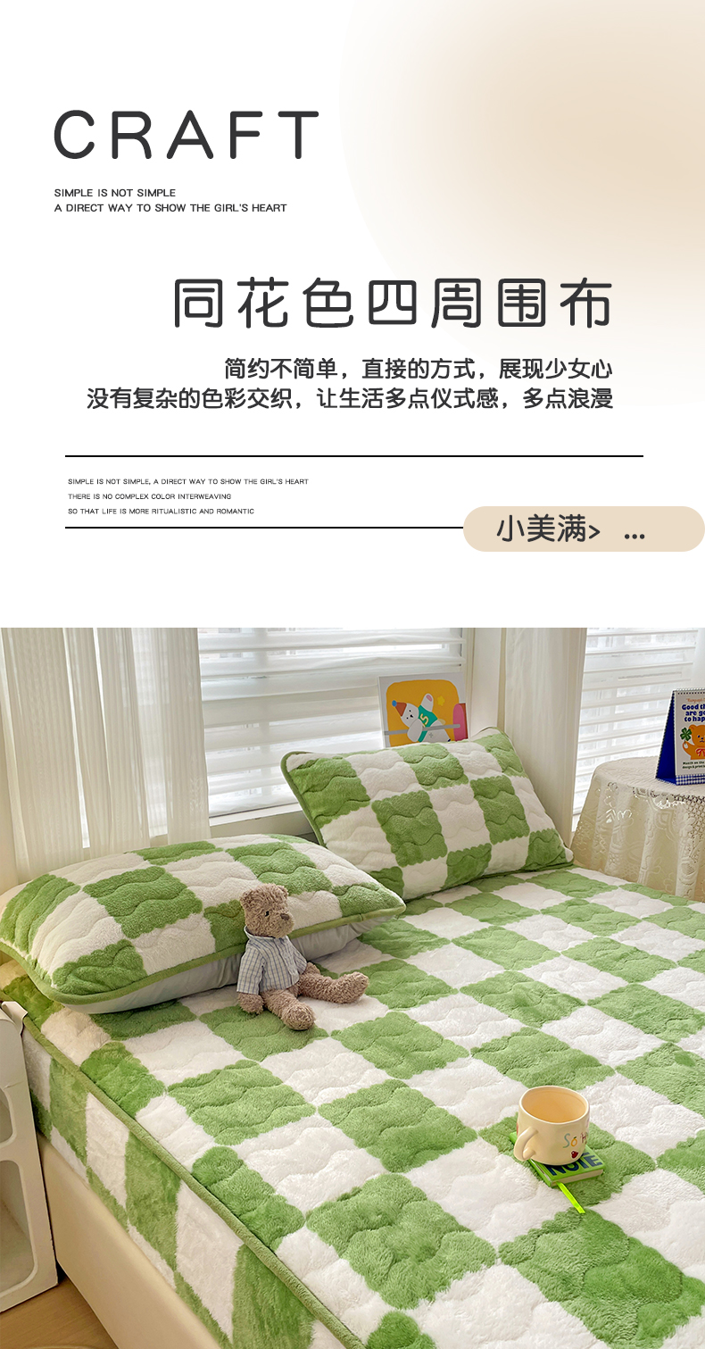 • 91家纺网 家纺一手货源 找家纺 叠派家纺 2024款秋冬北极绒加厚夹棉床笠三件套印花泰迪绒床垫保护罩-格子系列 绿