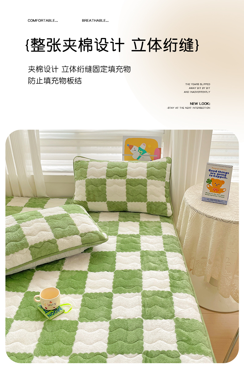 叠派家纺 2024款秋冬北极绒加厚夹棉床笠三件套印花泰迪绒床垫保护罩-格子系列 绿