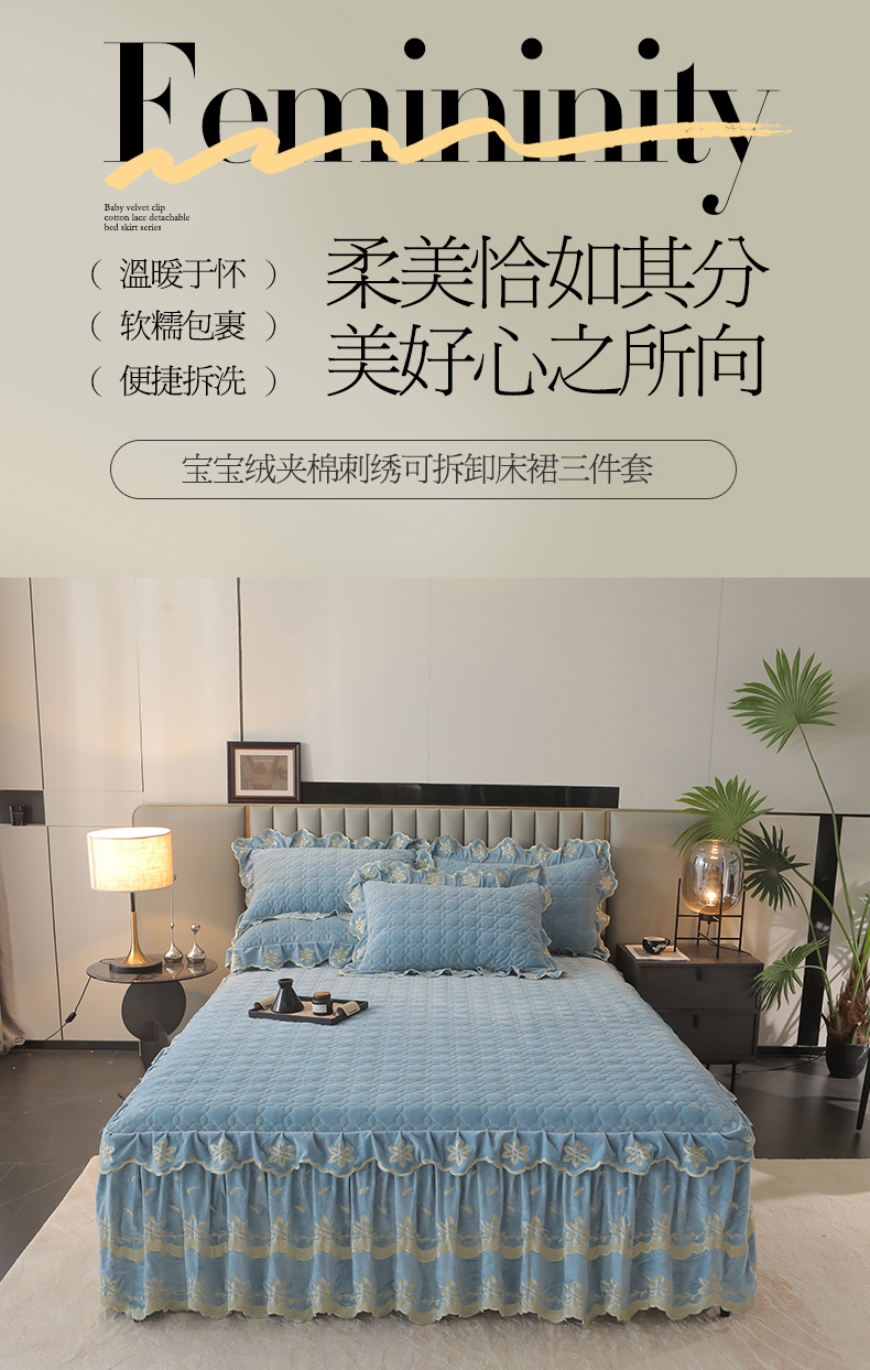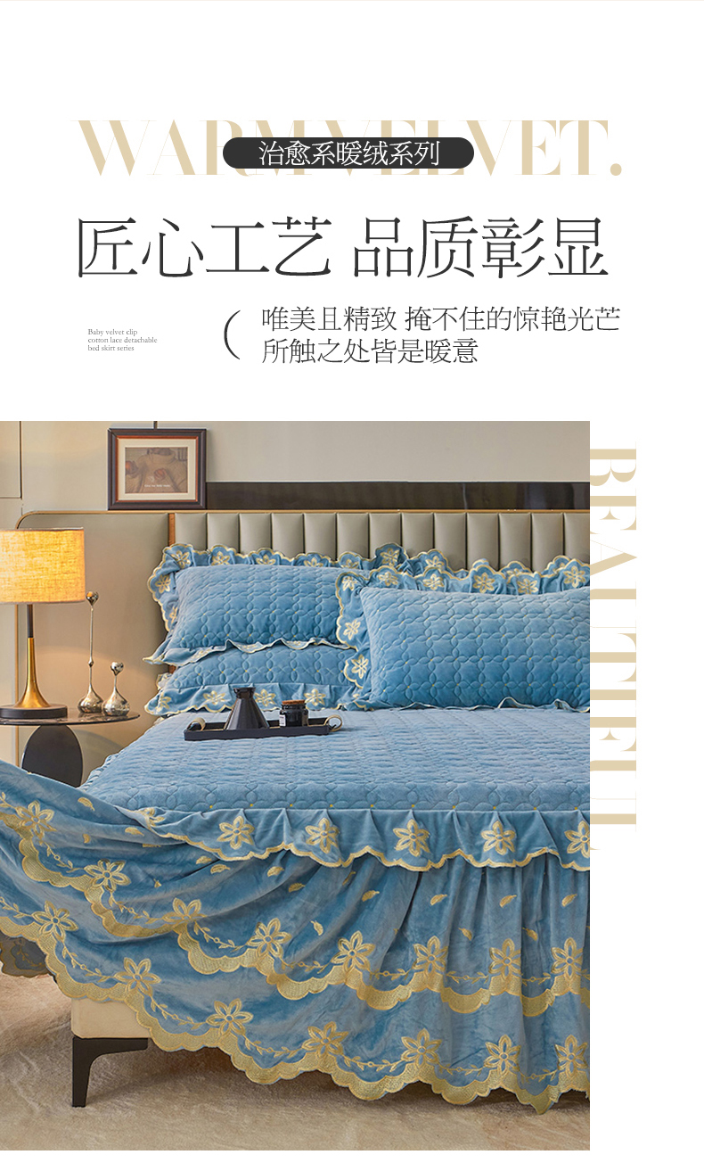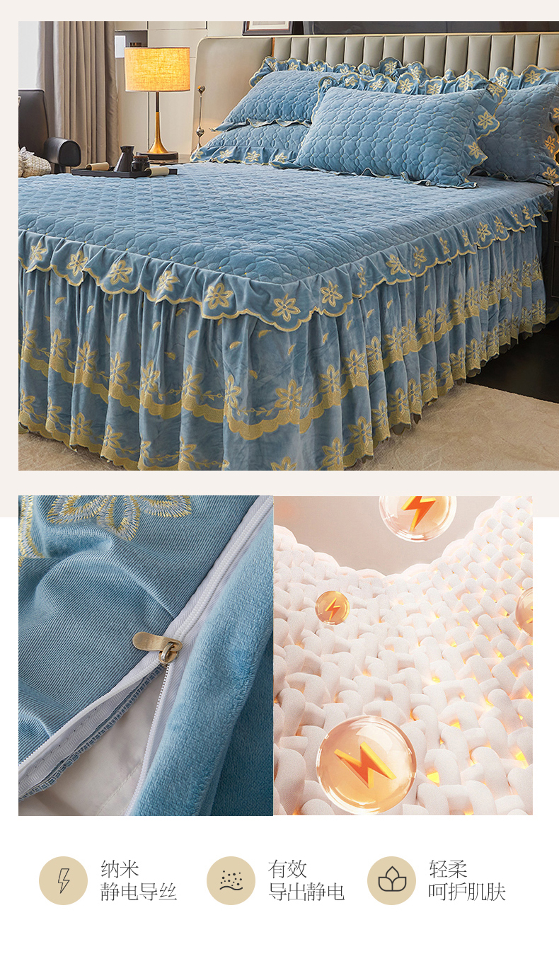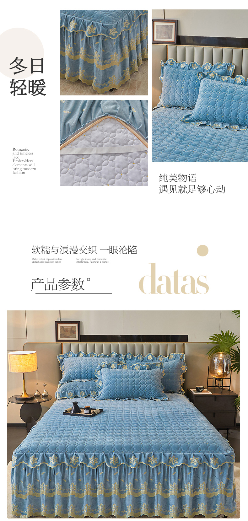 • 91家纺网 家纺一手货源 找家纺 虹星家纺 2024新款可拆卸宝宝绒夹棉床裙三件套-盛世芳华 盛世芳华 天蓝