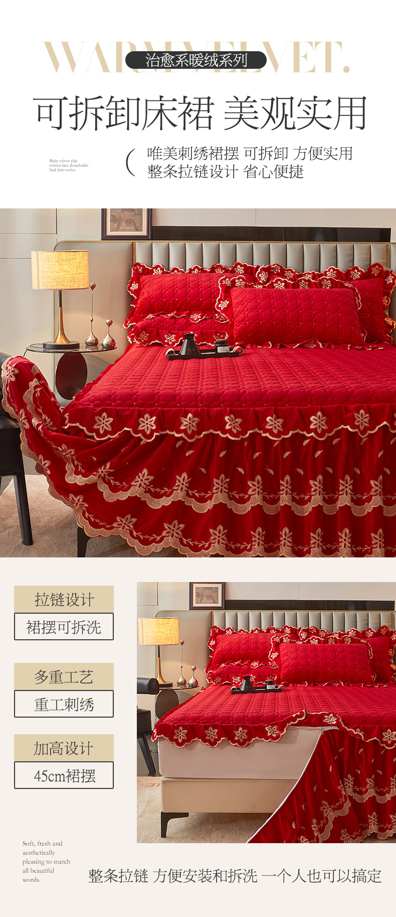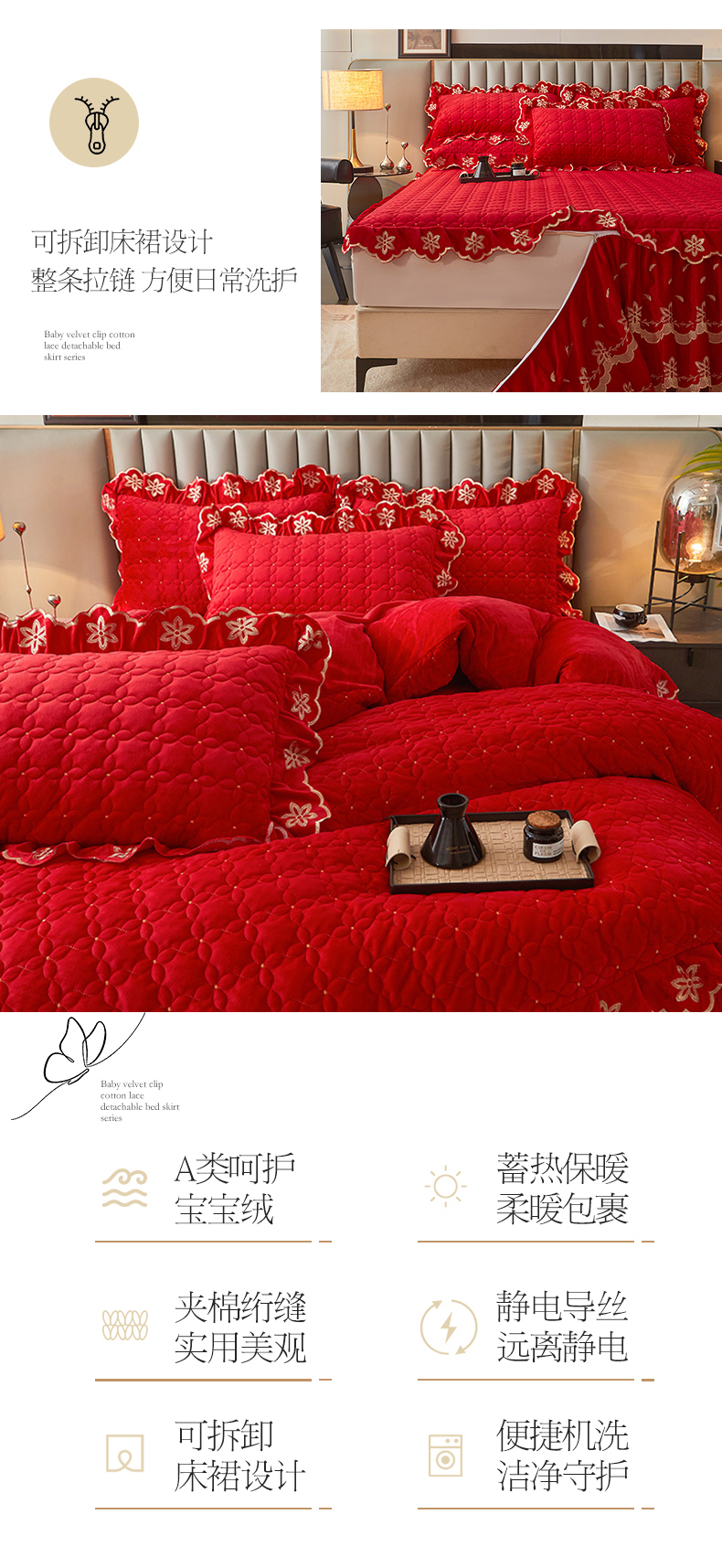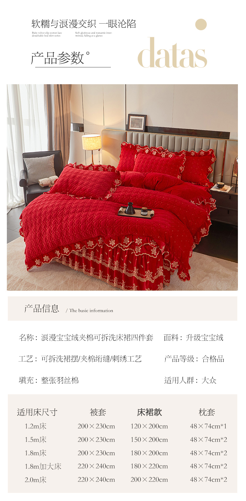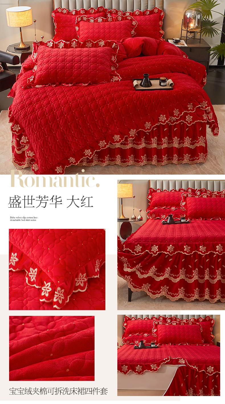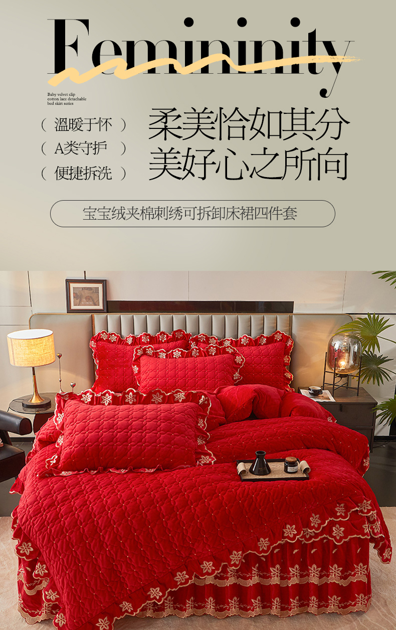当前位置: 91家纺网 > 商品网购 > 床品套件 > 四件套 > 其它四件套 > 虹星家纺 2024新款可拆卸宝宝绒夹棉床裙三四件套-盛世芳华 盛世芳华 大红