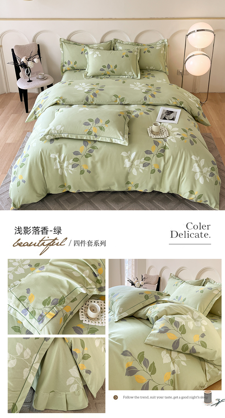 当前位置: 91家纺网 > 商品网购 > 床品套件 > 四件套 > 普通磨毛四件套 > 铭成 2024新款全棉生态喷气加厚磨毛四件套浅影落香-绿