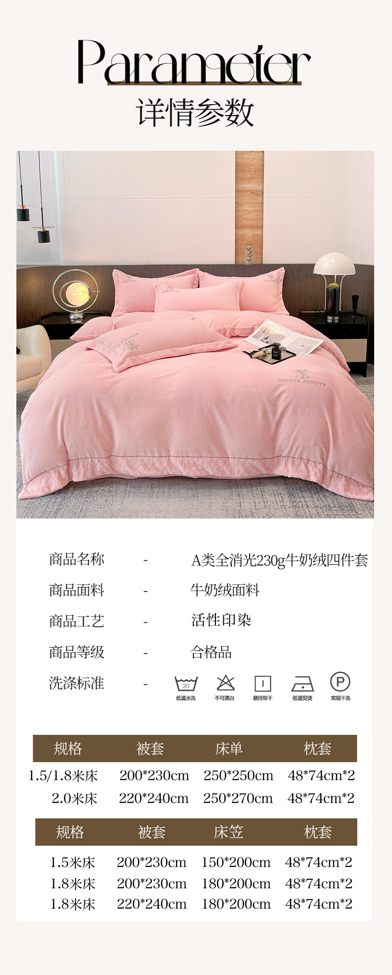 商品名称:星尚家纺 2024新款全消光A类230g牛奶绒四件套-维也纳 樱花粉