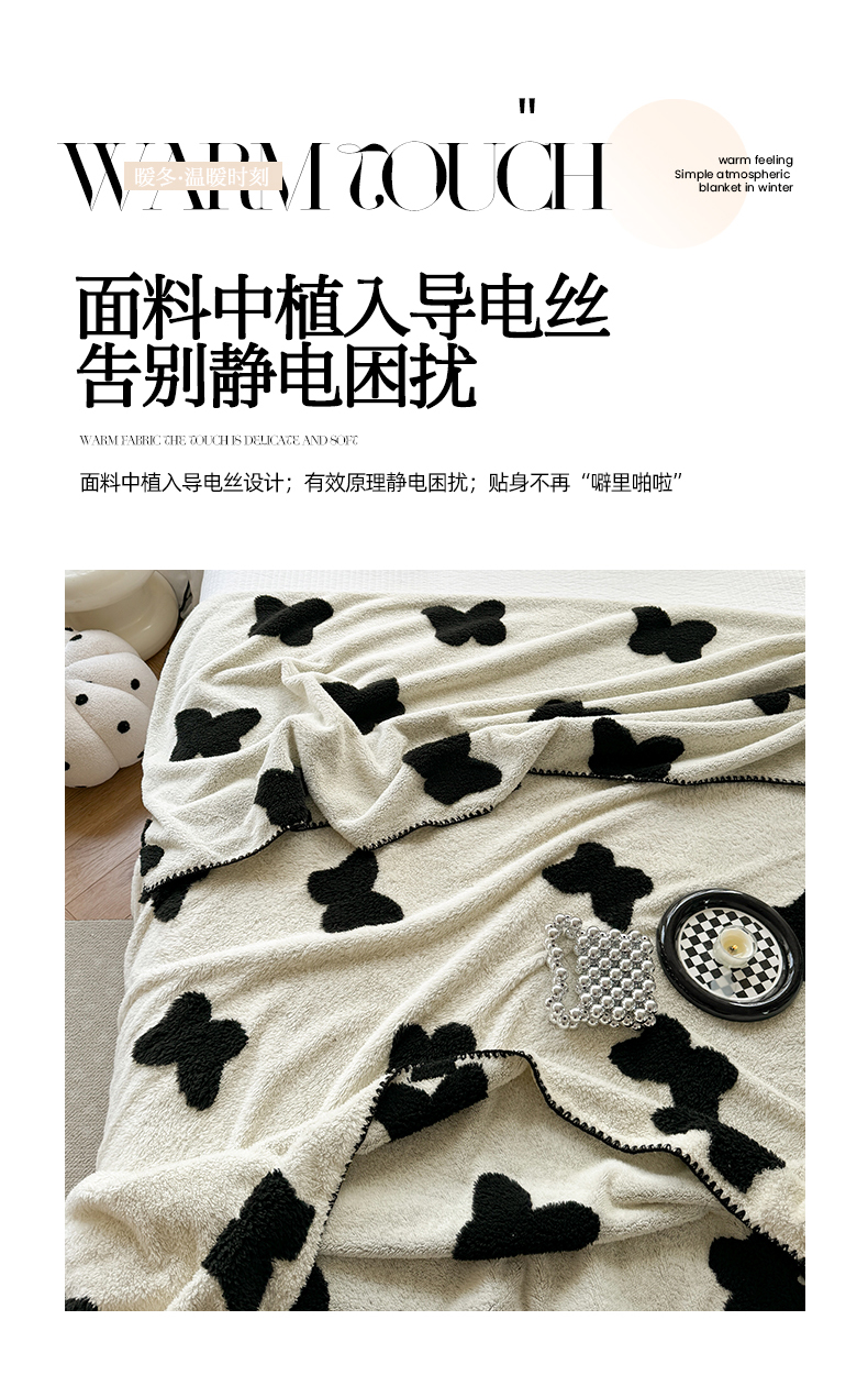 商品名称:吉象家纺 2024新款A类高克重棉舒绒贝壳包边毛毯 黑蝴蝶