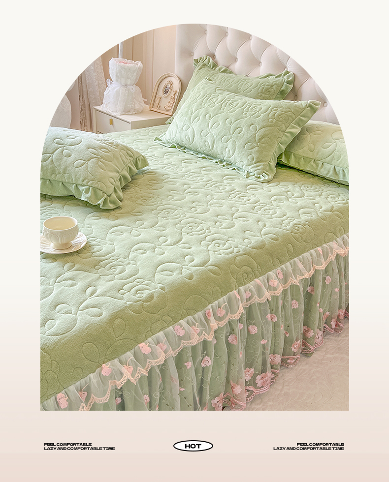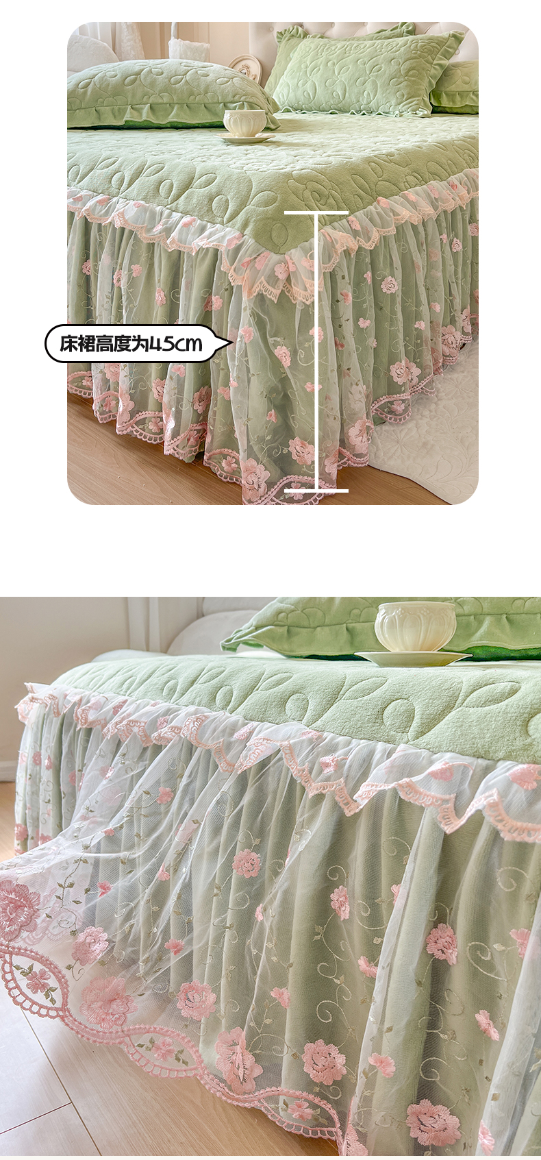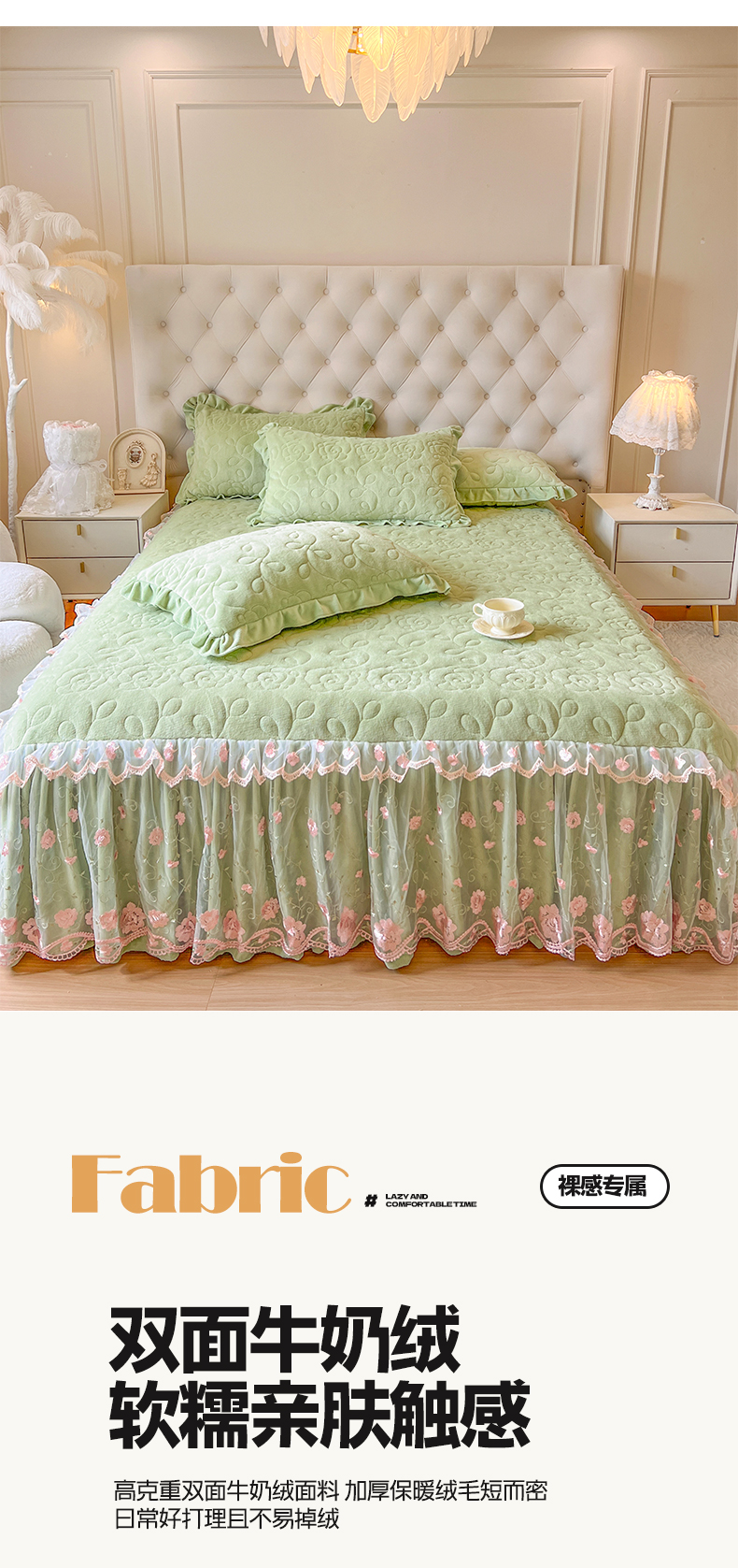 2024新款牛奶绒夹棉床裙三件套--繁花系列 繁花-香草绿