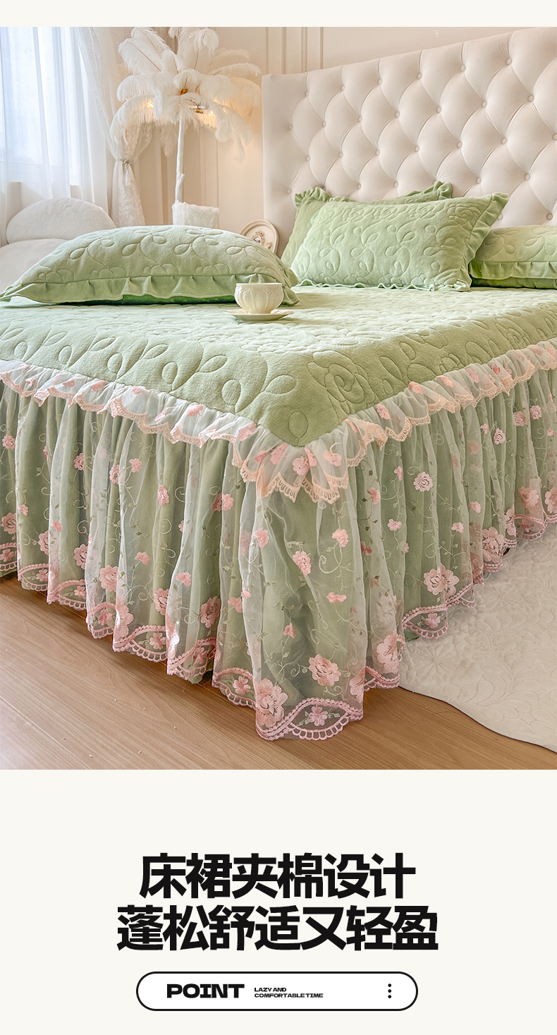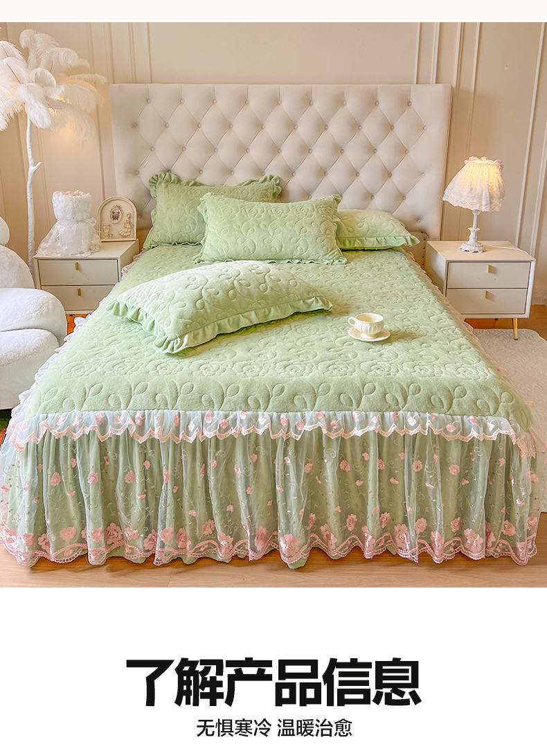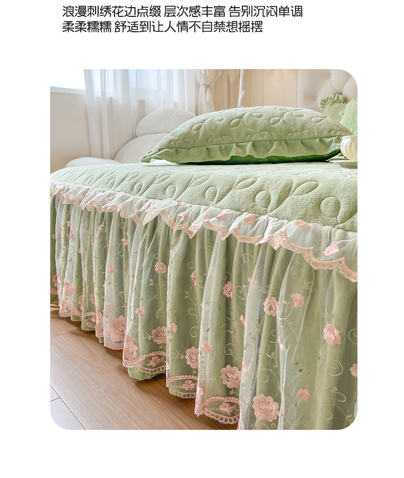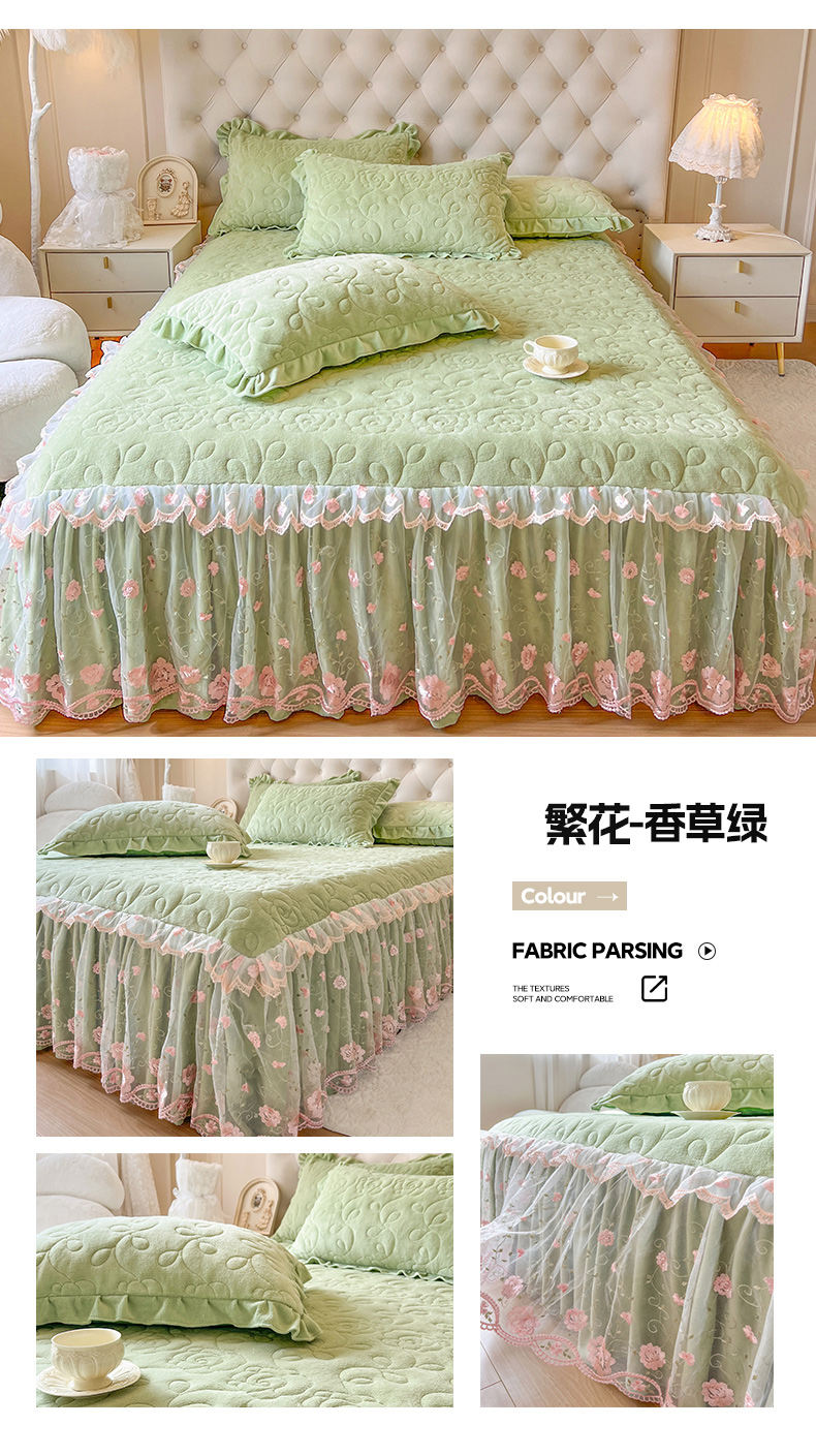商品名称:2024新款牛奶绒夹棉床裙三件套--繁花系列 繁花-香草绿