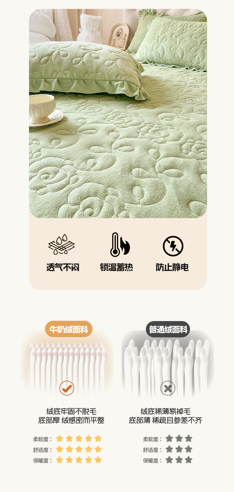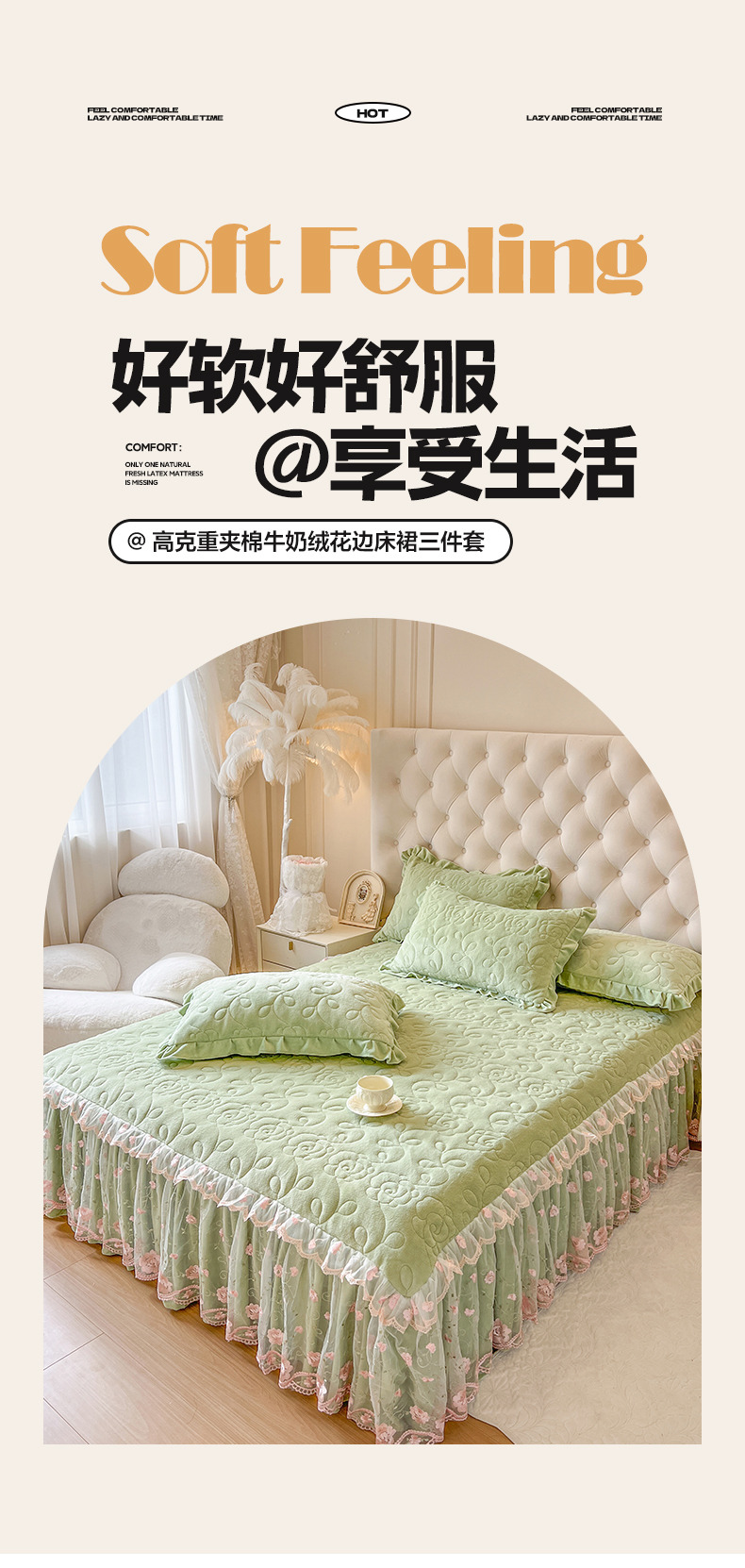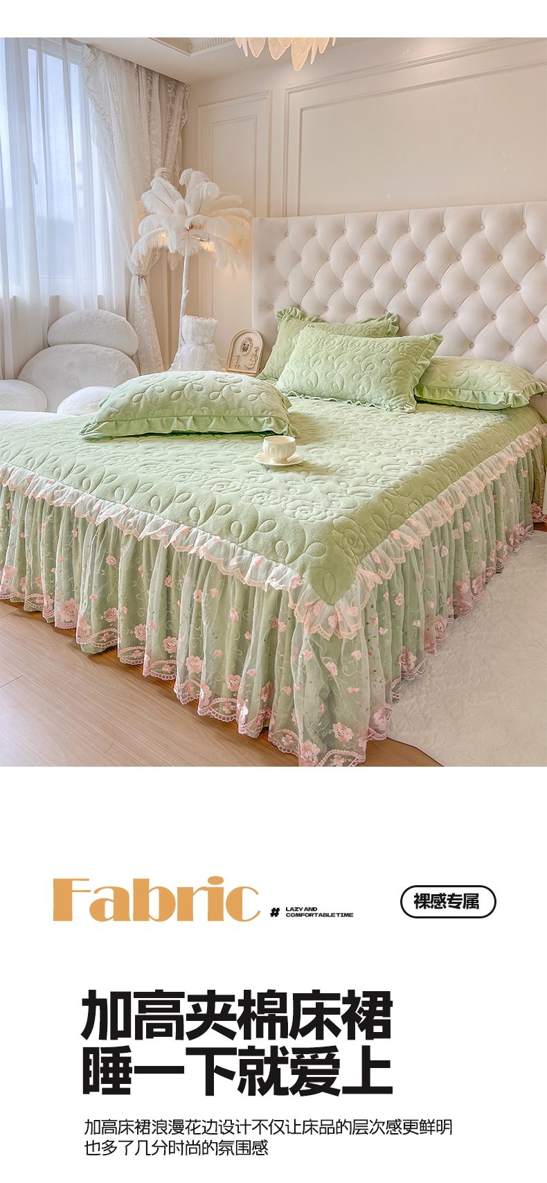 商品名称:2024新款牛奶绒夹棉床裙三件套--繁花系列 繁花-香草绿