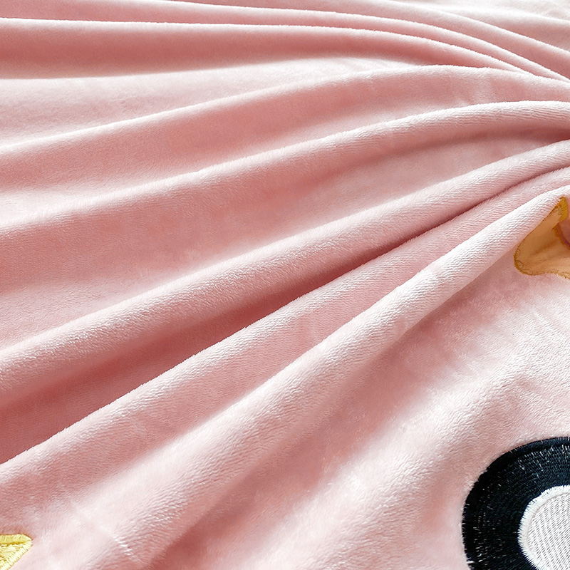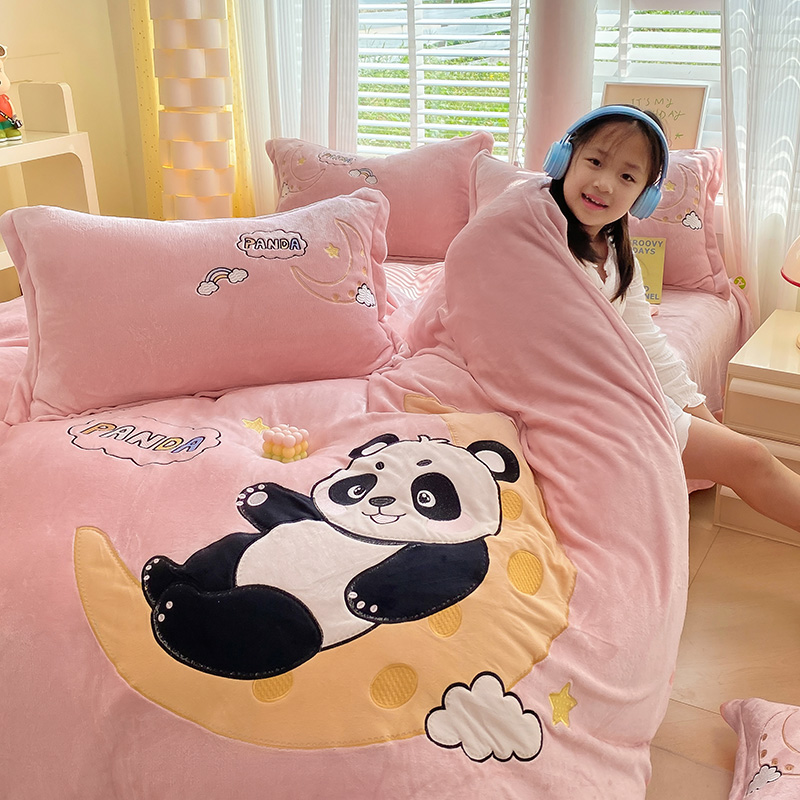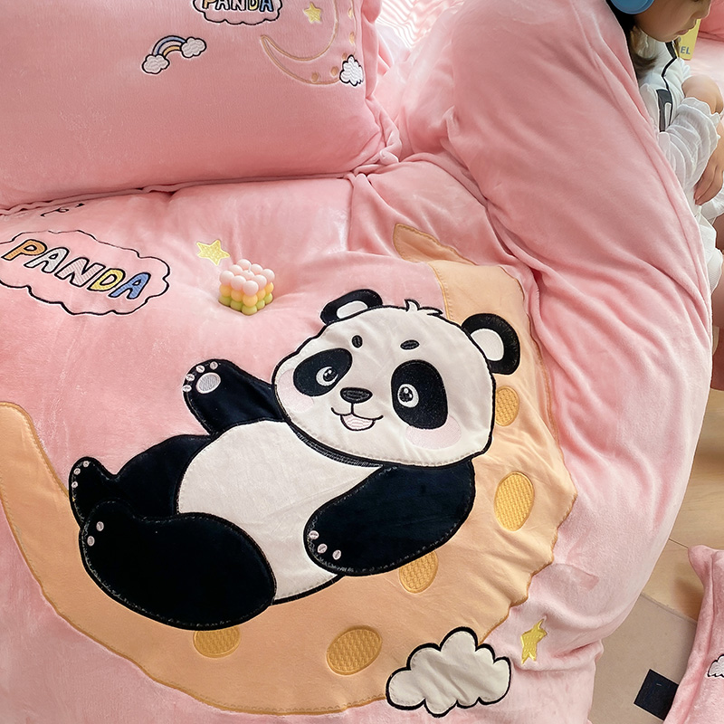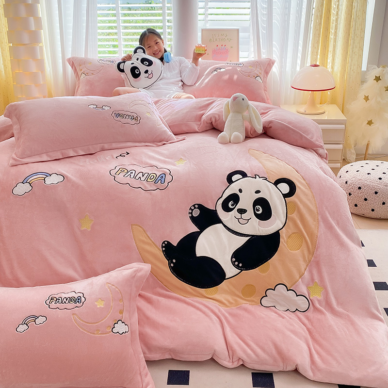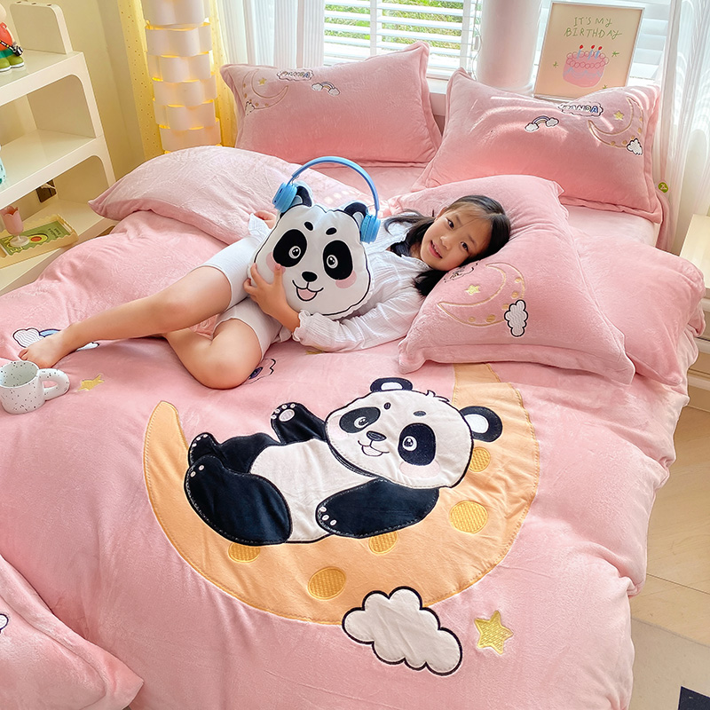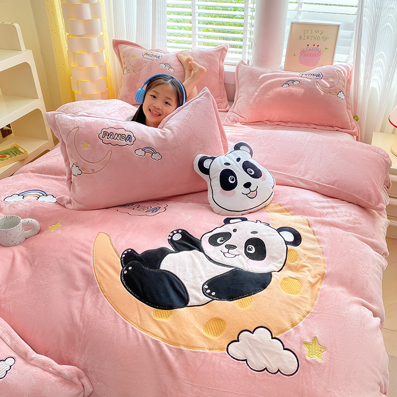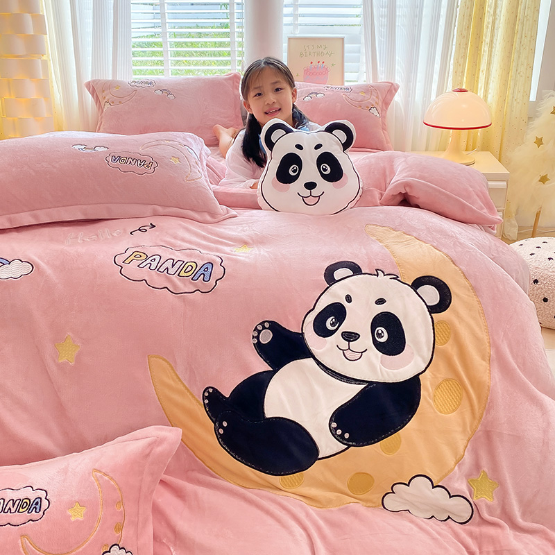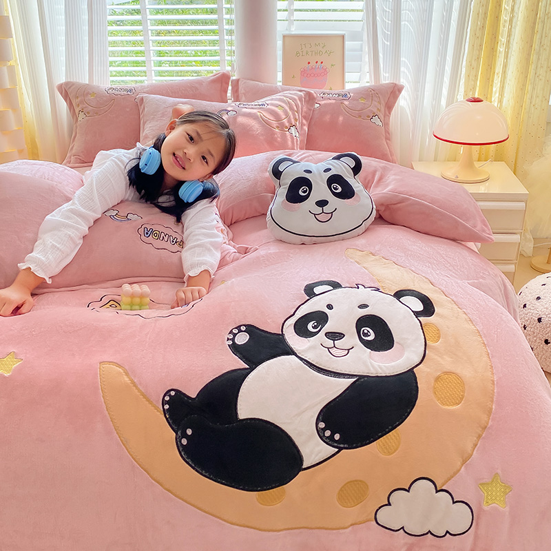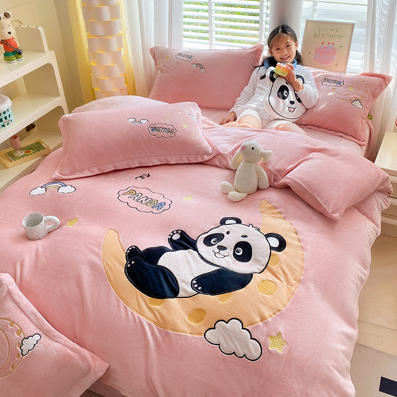 航途席业 2025新款加厚牛奶绒贴布绣五件套卡通宝宝绒四件套兔毛绒套件-熊猫宝贝樱花粉