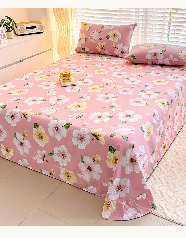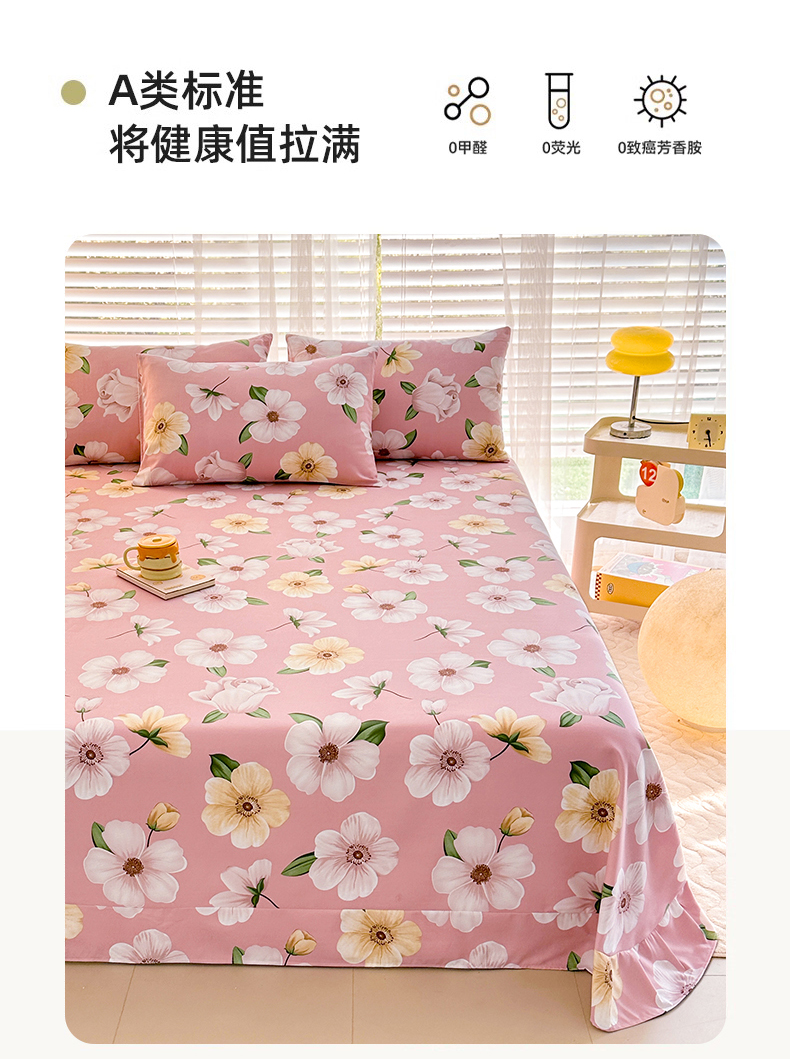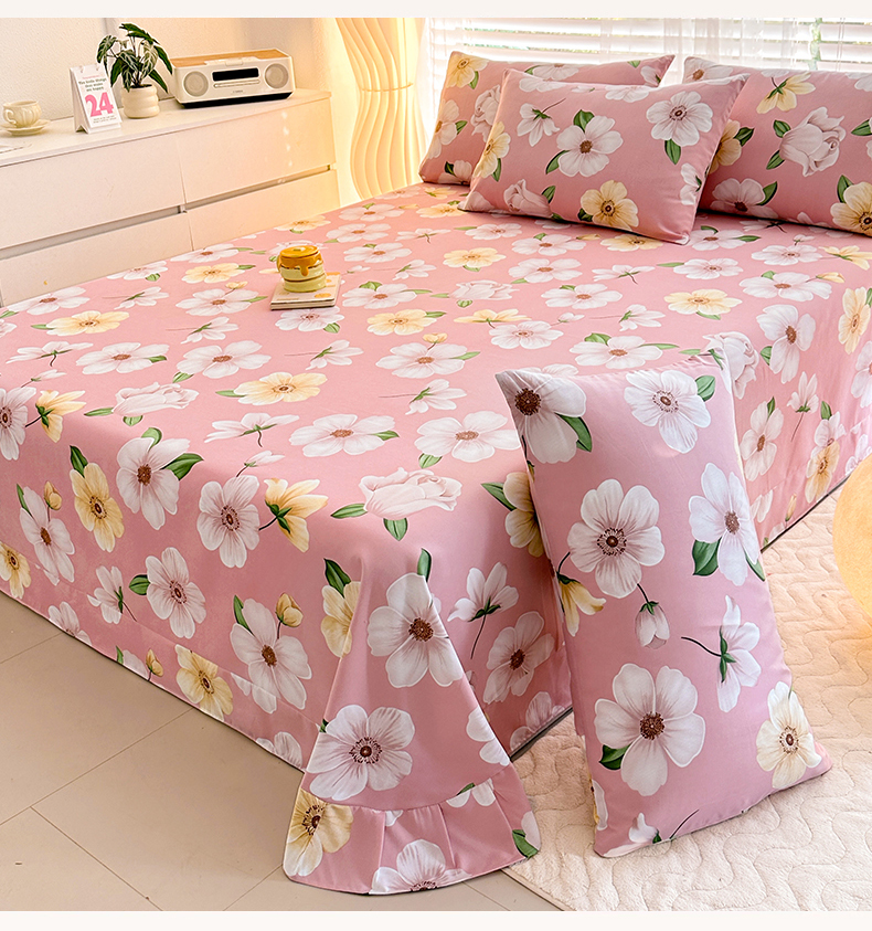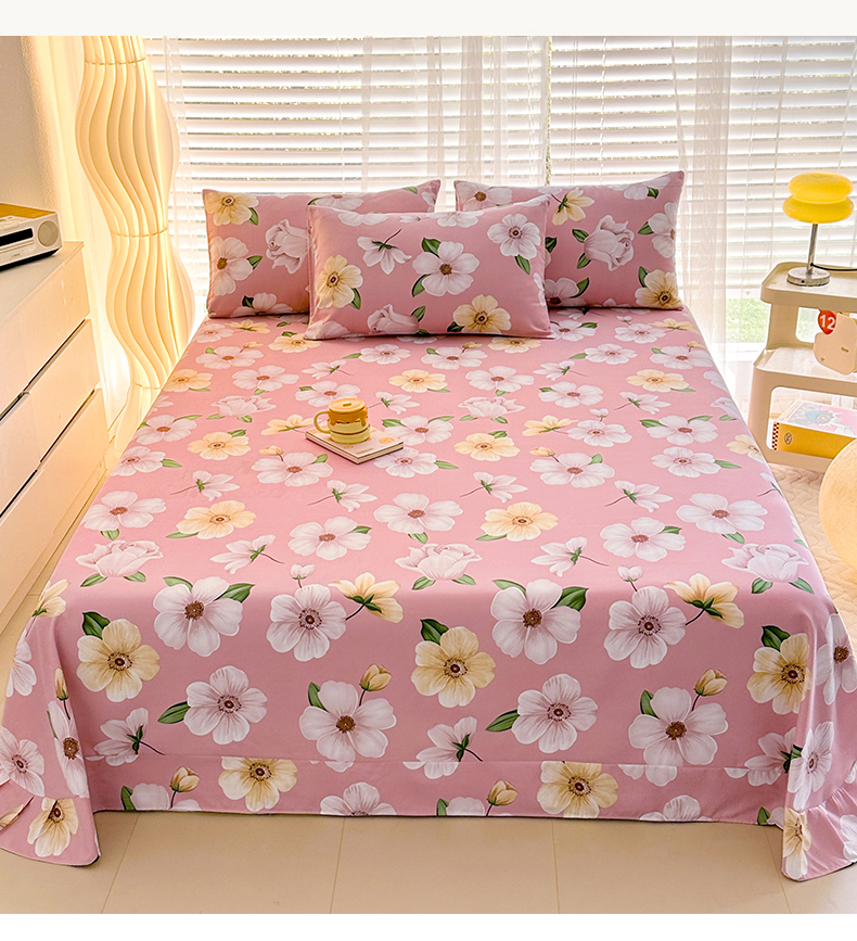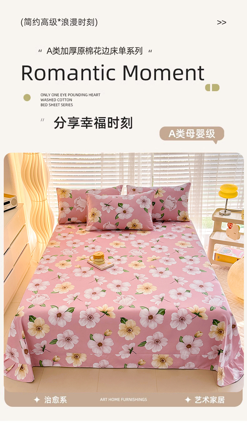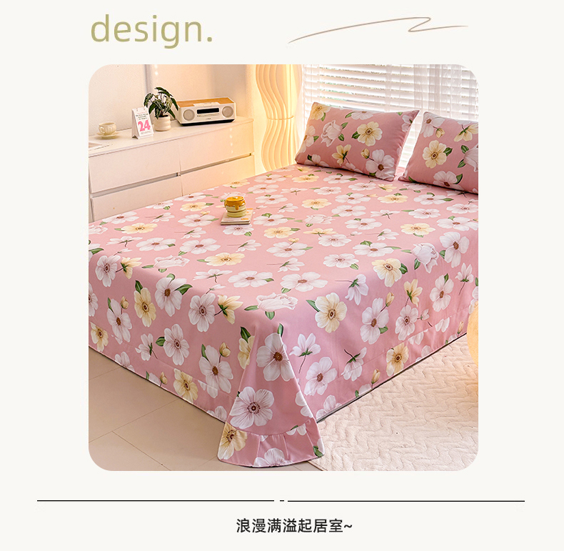 • 91家纺网 家纺一手货源 找家纺 家贝爱 2024新款加厚原棉磨毛花边床单 粉朵花颂