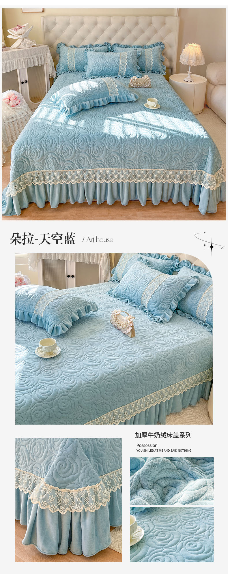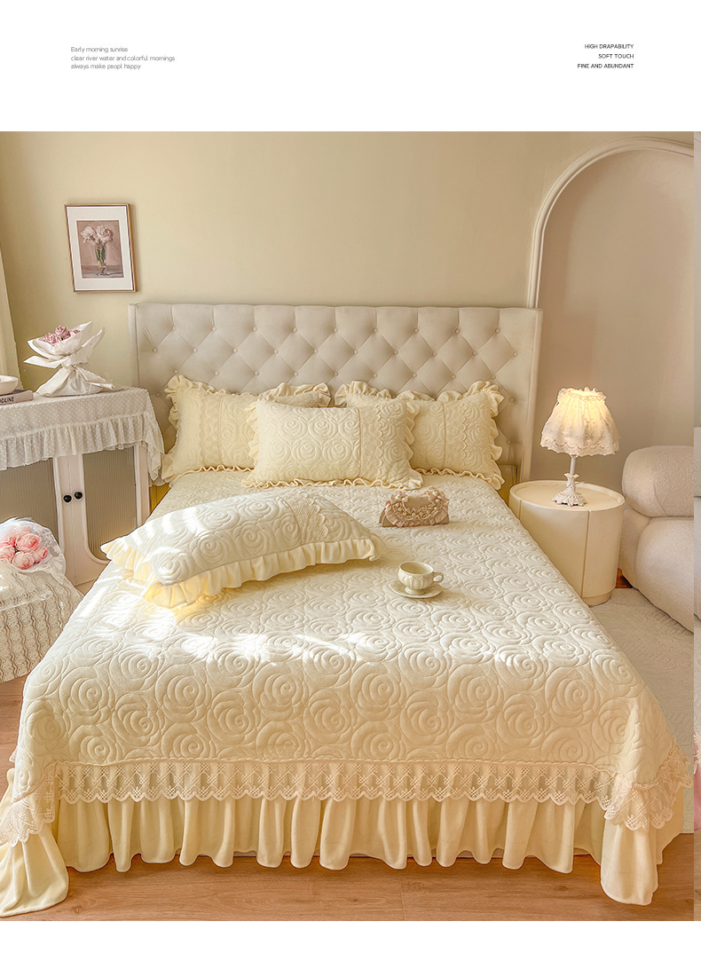 恋尚 2024新款高克重牛奶绒夹棉蕾丝花边单床盖--朵拉 朵拉-奶黄