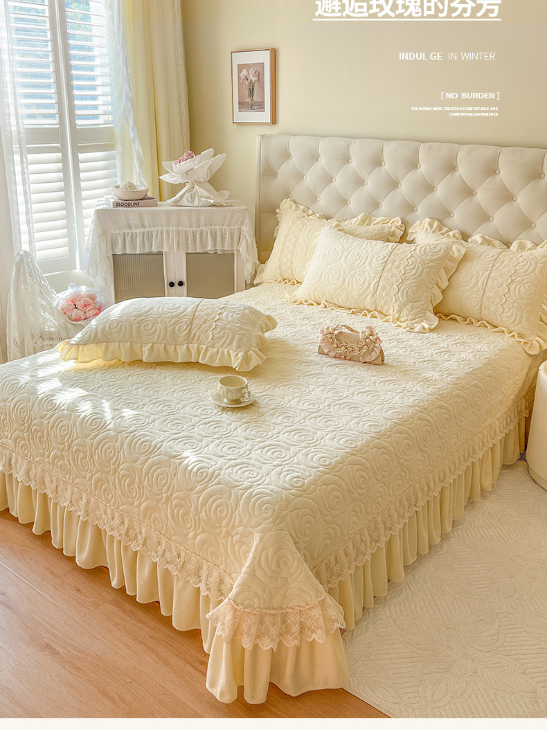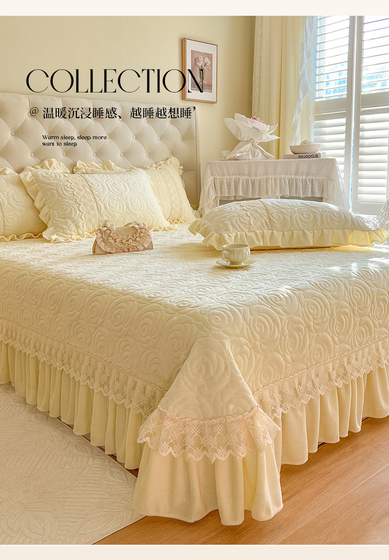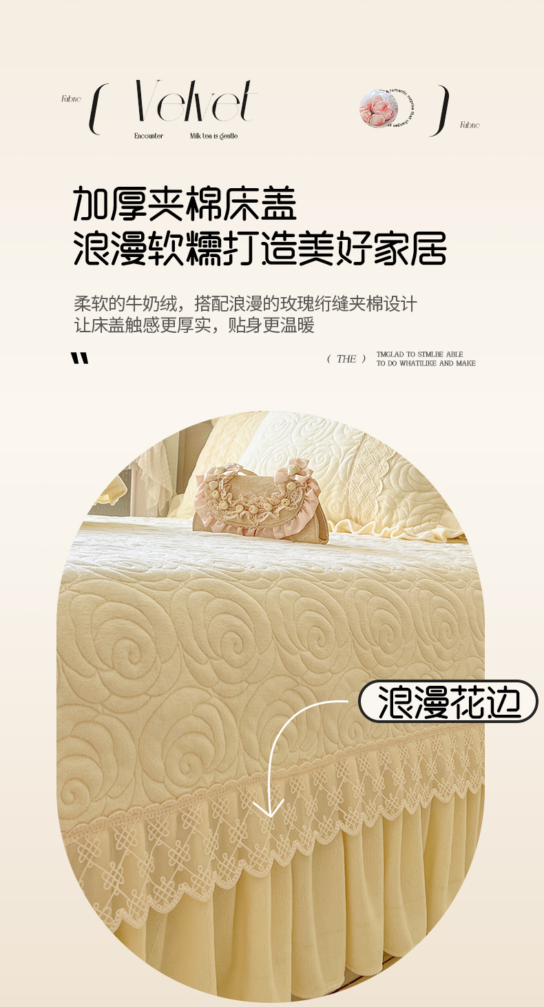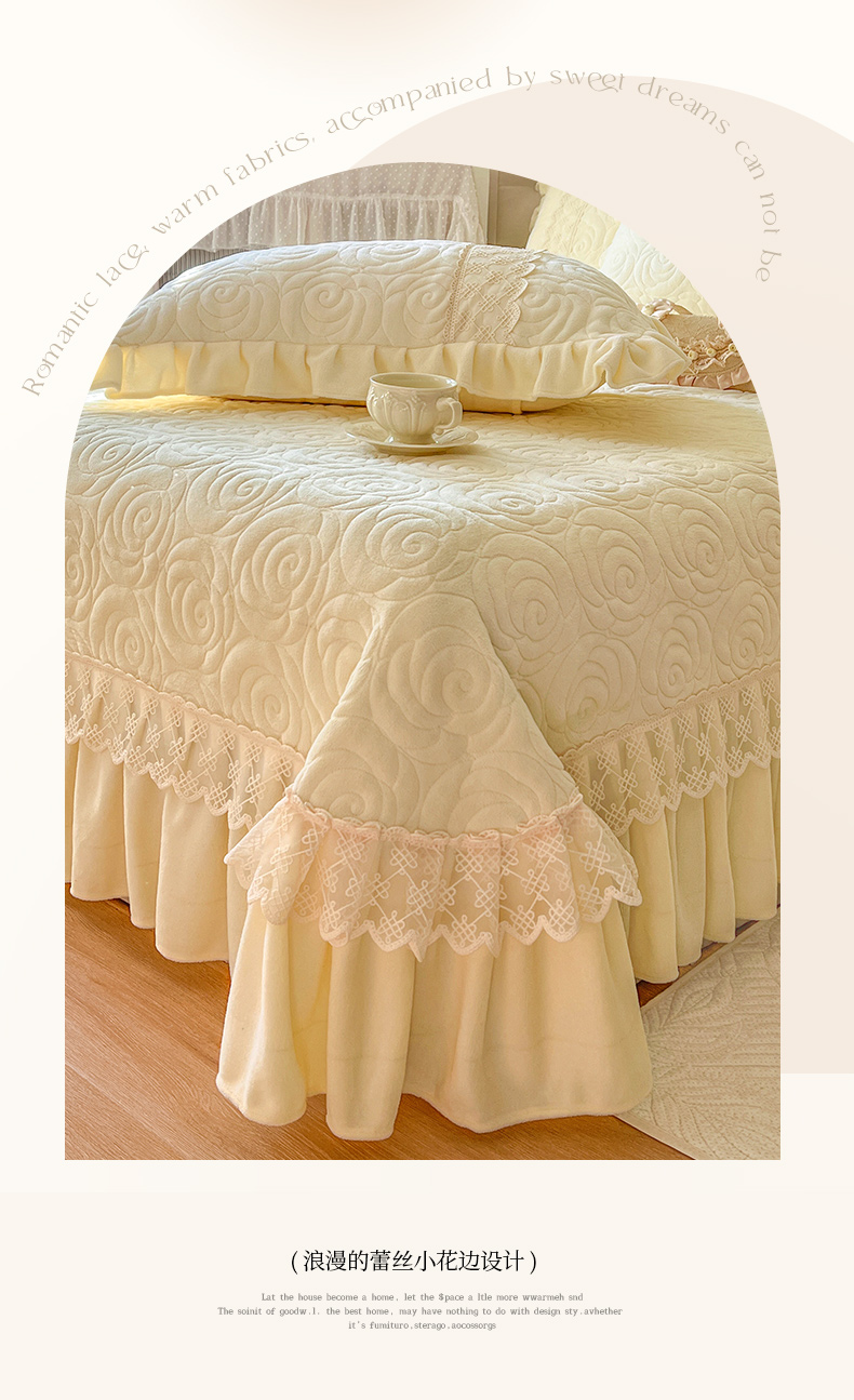 商品名称:恋尚 2024新款高克重牛奶绒夹棉蕾丝花边单床盖--朵拉 朵拉-奶黄