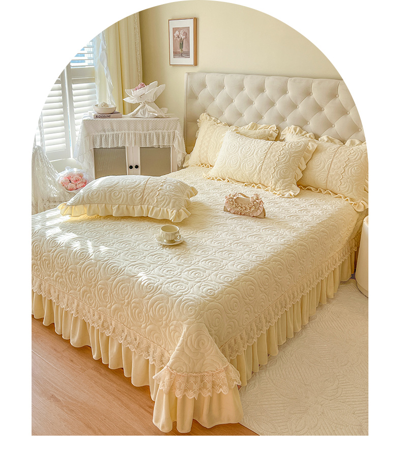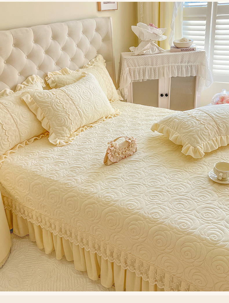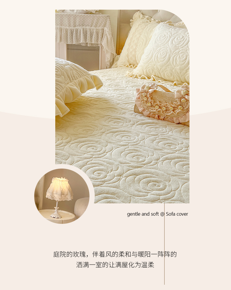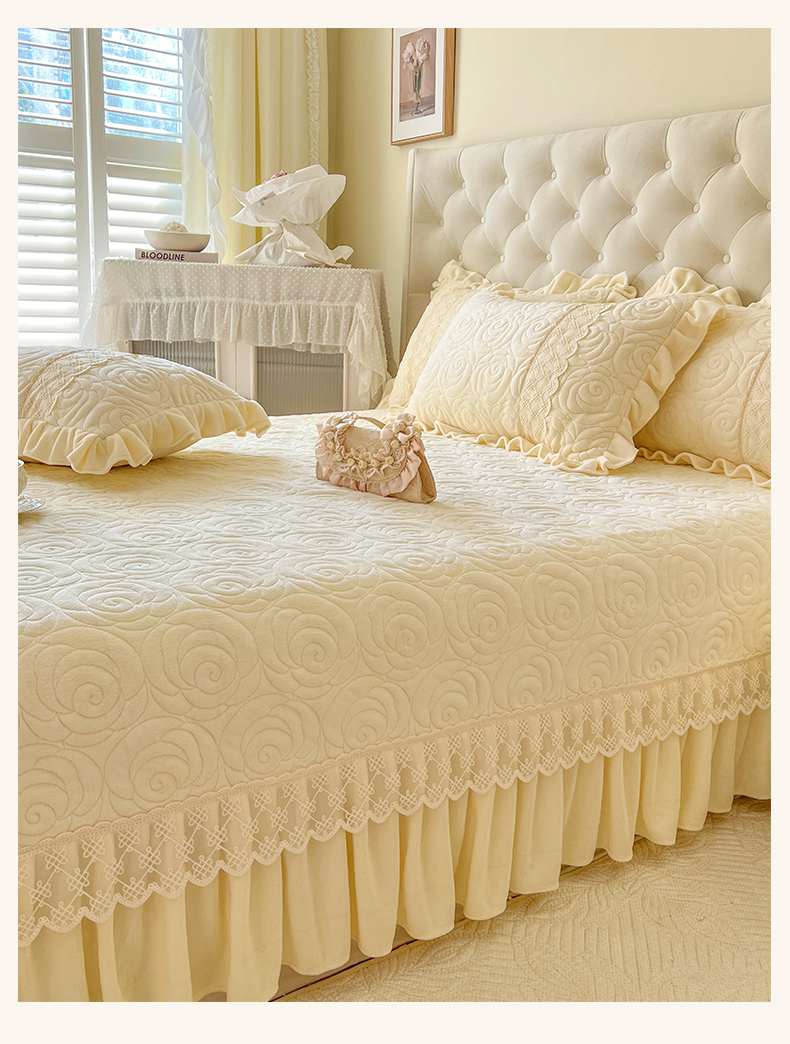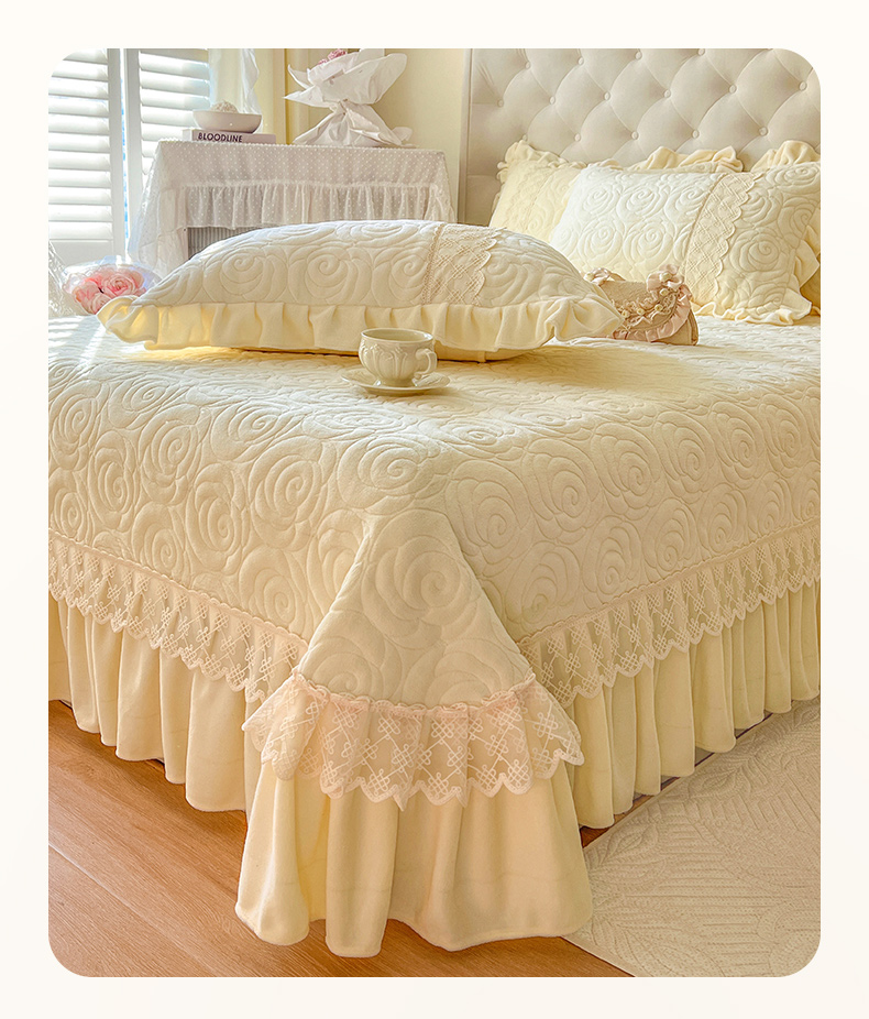 商品名称:恋尚 2024新款高克重牛奶绒夹棉蕾丝花边单床盖--朵拉 朵拉-奶黄