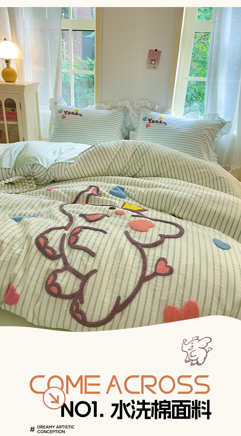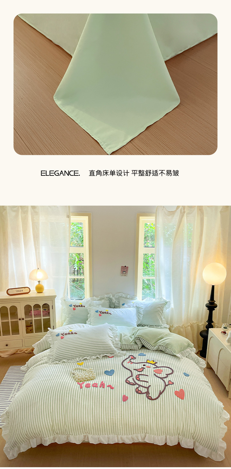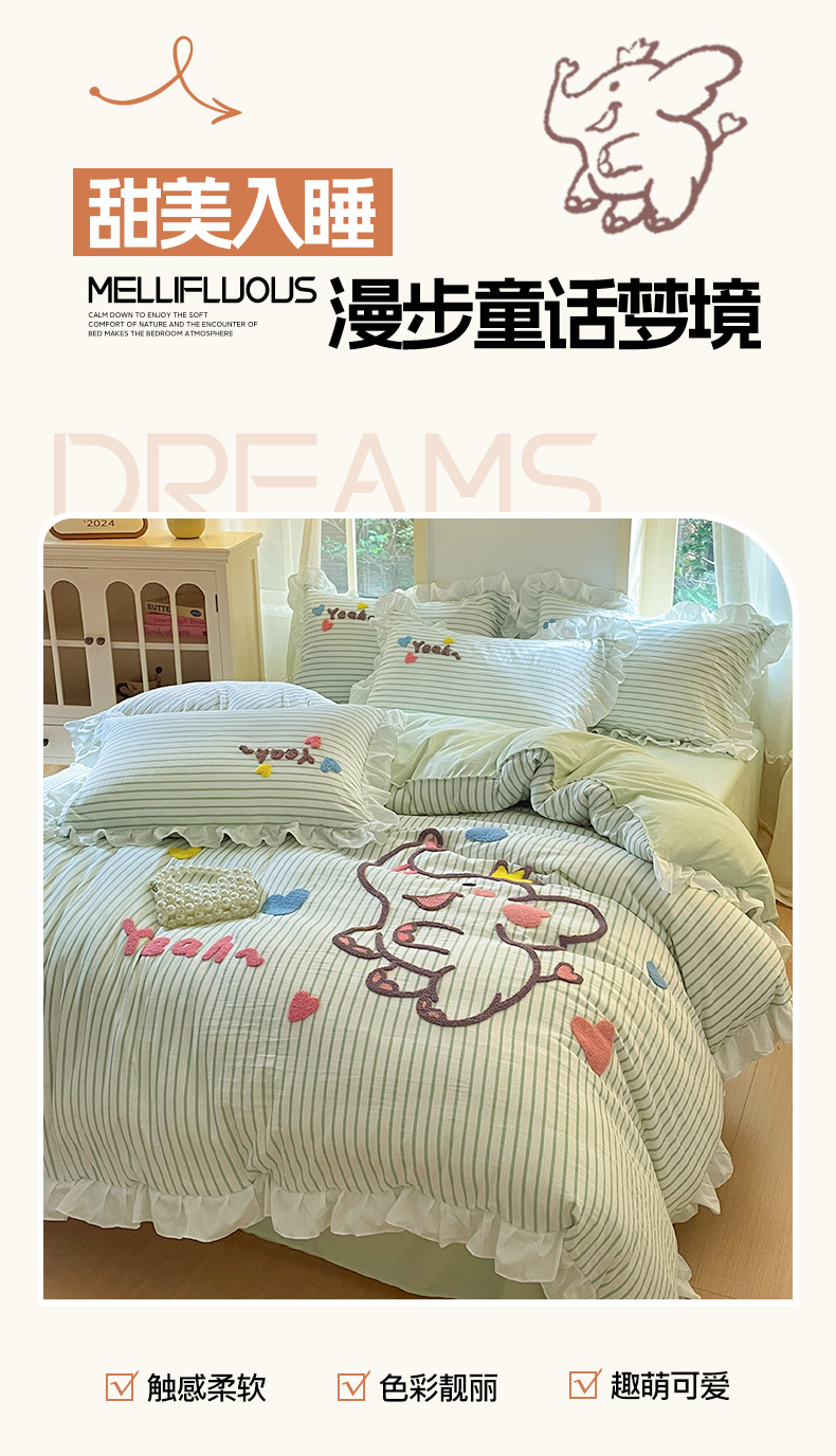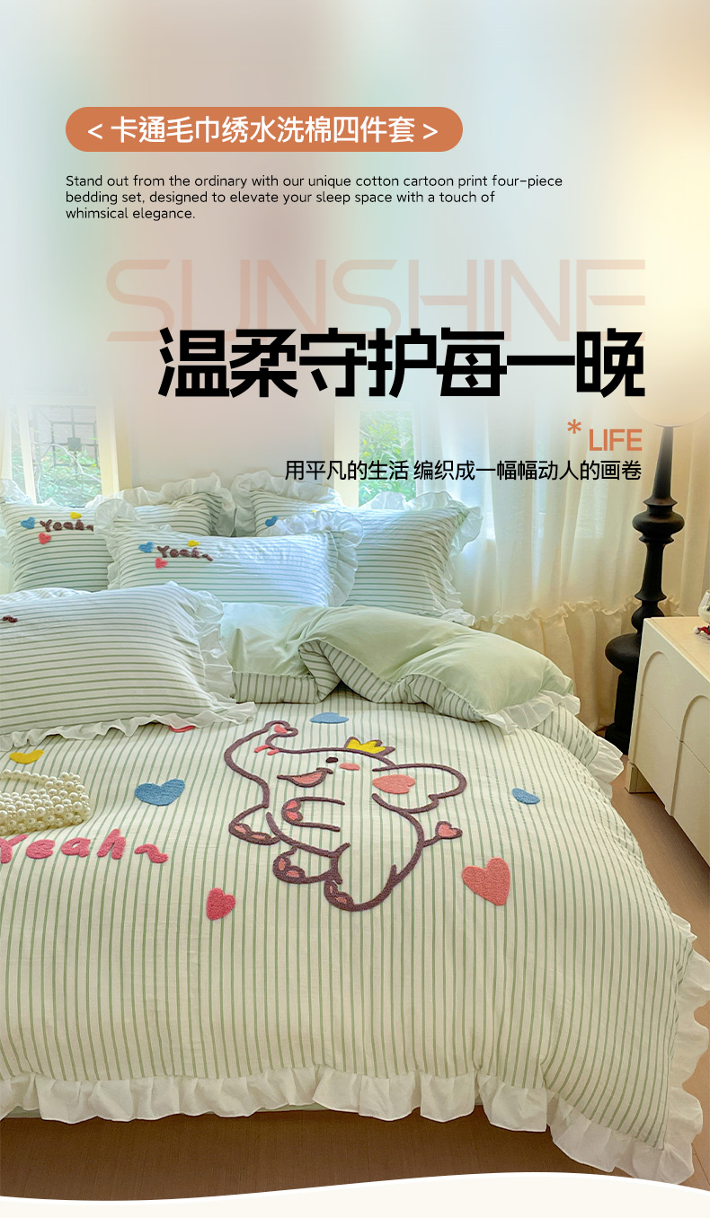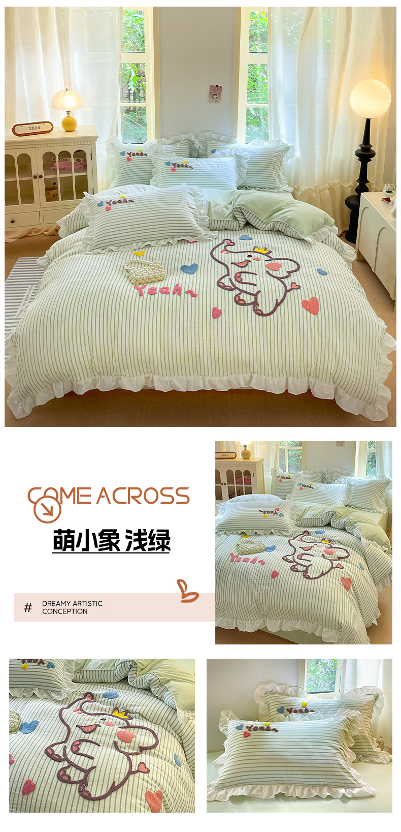 当前位置: 91家纺网 > 商品网购 > 床品套件 > 四件套 > 毛巾绣四件套 > 泉欣家纺 2025新品韩系网红水洗棉卡通毛巾绣花小象考拉系列四件套(专版花型) 萌小象浅绿