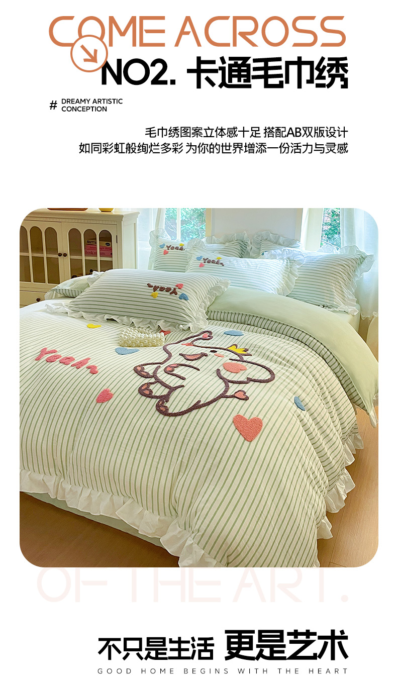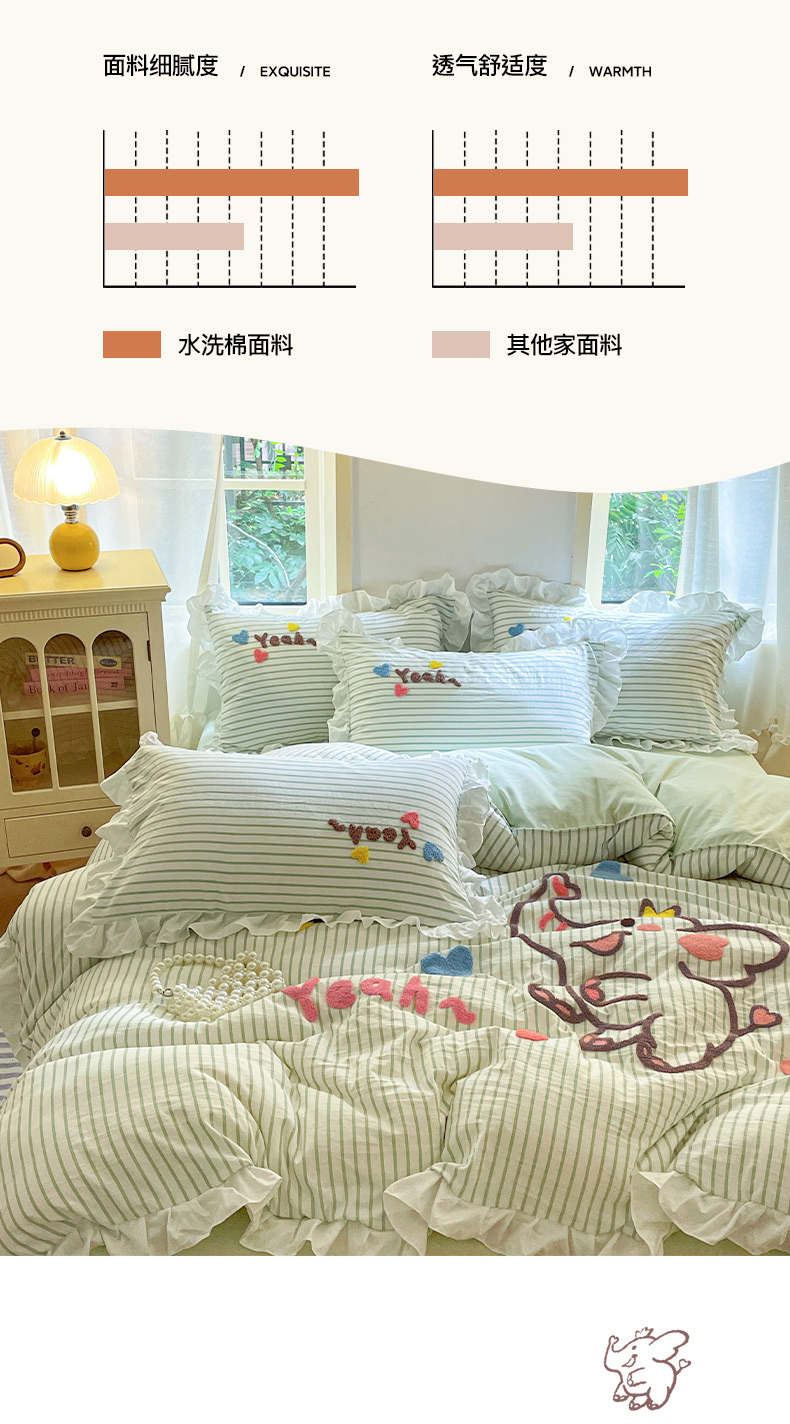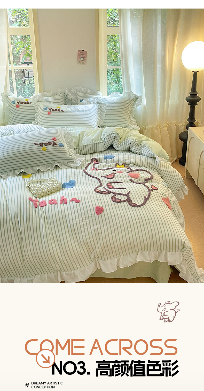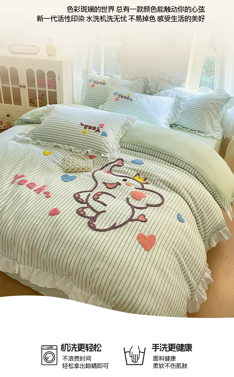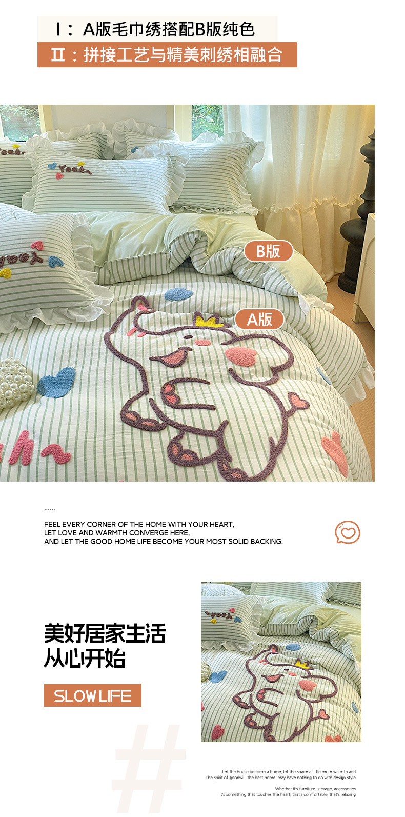 当前位置: 91家纺网 > 商品网购 > 床品套件 > 四件套 > 毛巾绣四件套 > 泉欣家纺 2025新品韩系网红水洗棉卡通毛巾绣花小象考拉系列四件套(专版花型) 萌小象浅绿