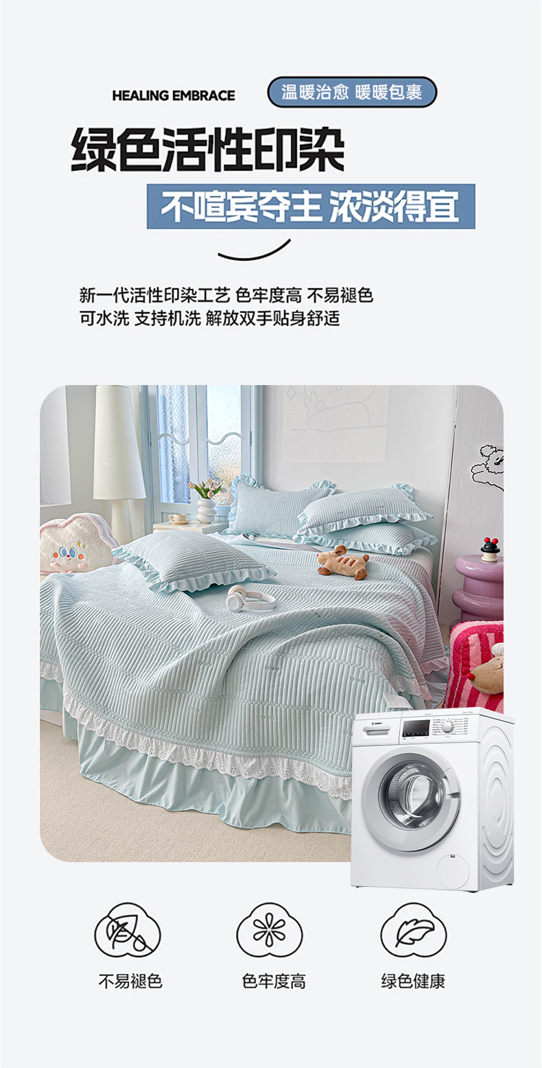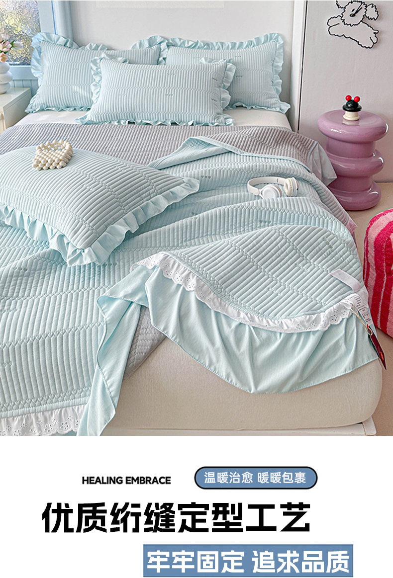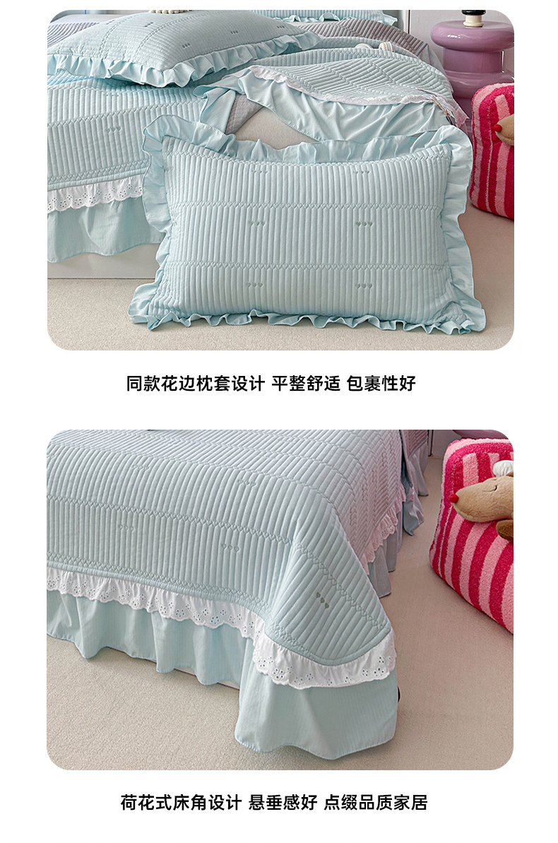 (总)源舜家纺 2025新款色织棉简约韩系花边床盖三件套,简约灰,简约粉,简约绿,简约驼,简约蓝