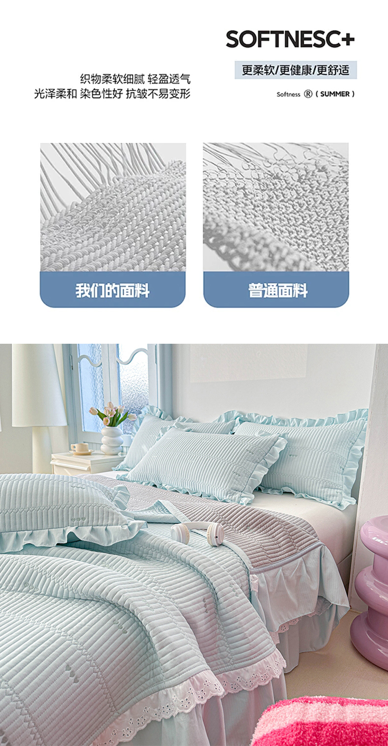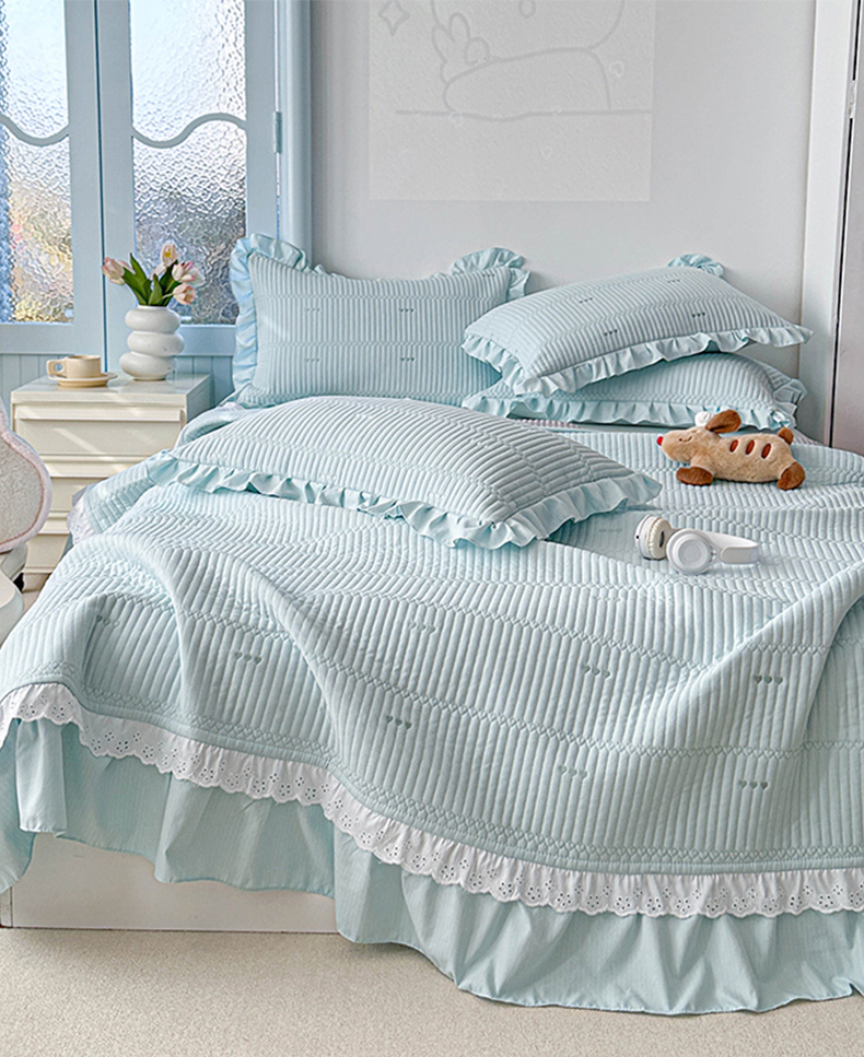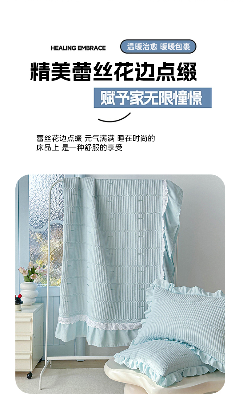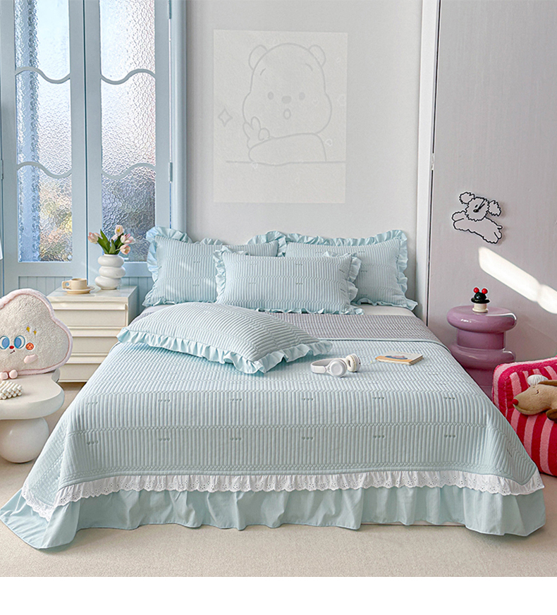 (总)源舜家纺 2025新款色织棉简约韩系花边床盖三件套,简约灰,简约粉,简约绿,简约驼,简约蓝