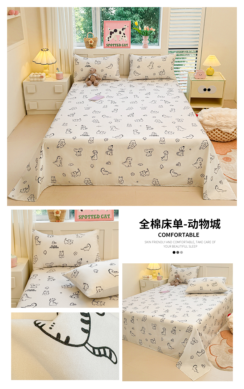 • 91家纺网 家纺一手货源 找家纺 雯豆2025春夏新款全棉床单三件套纯棉床罩小清新印花床单 全棉床单-动物城