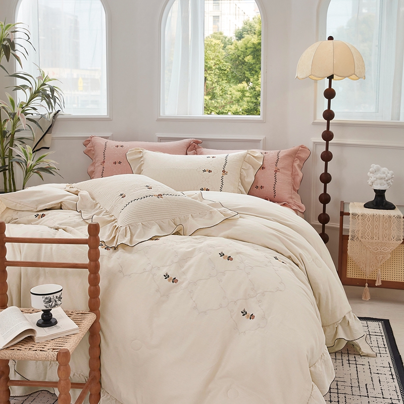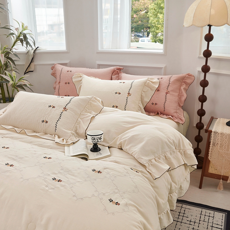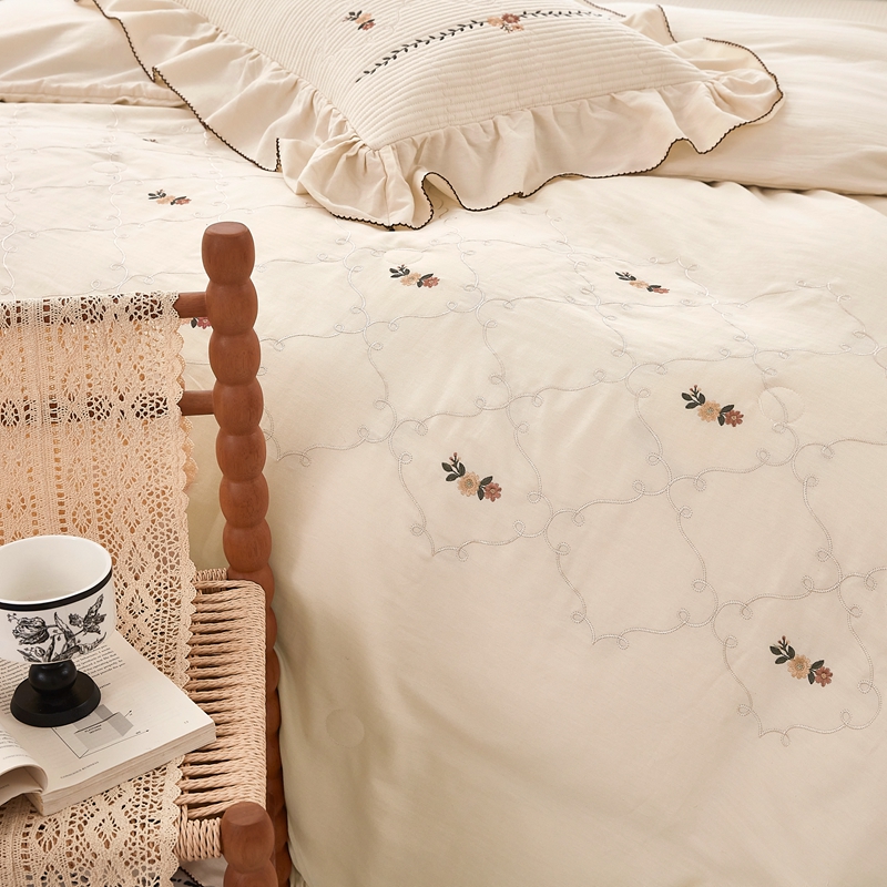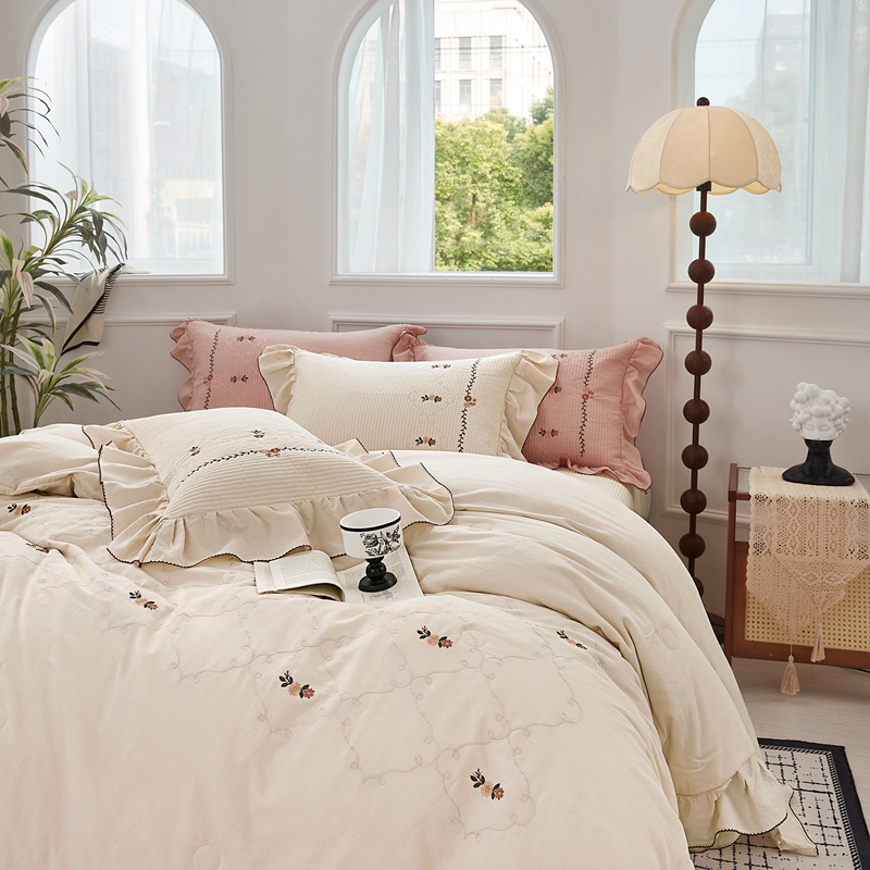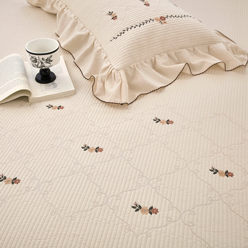 (总)上喜 2026新款棉麻小花刺绣款床盖多功能被子系列,麻本色,麻粉色