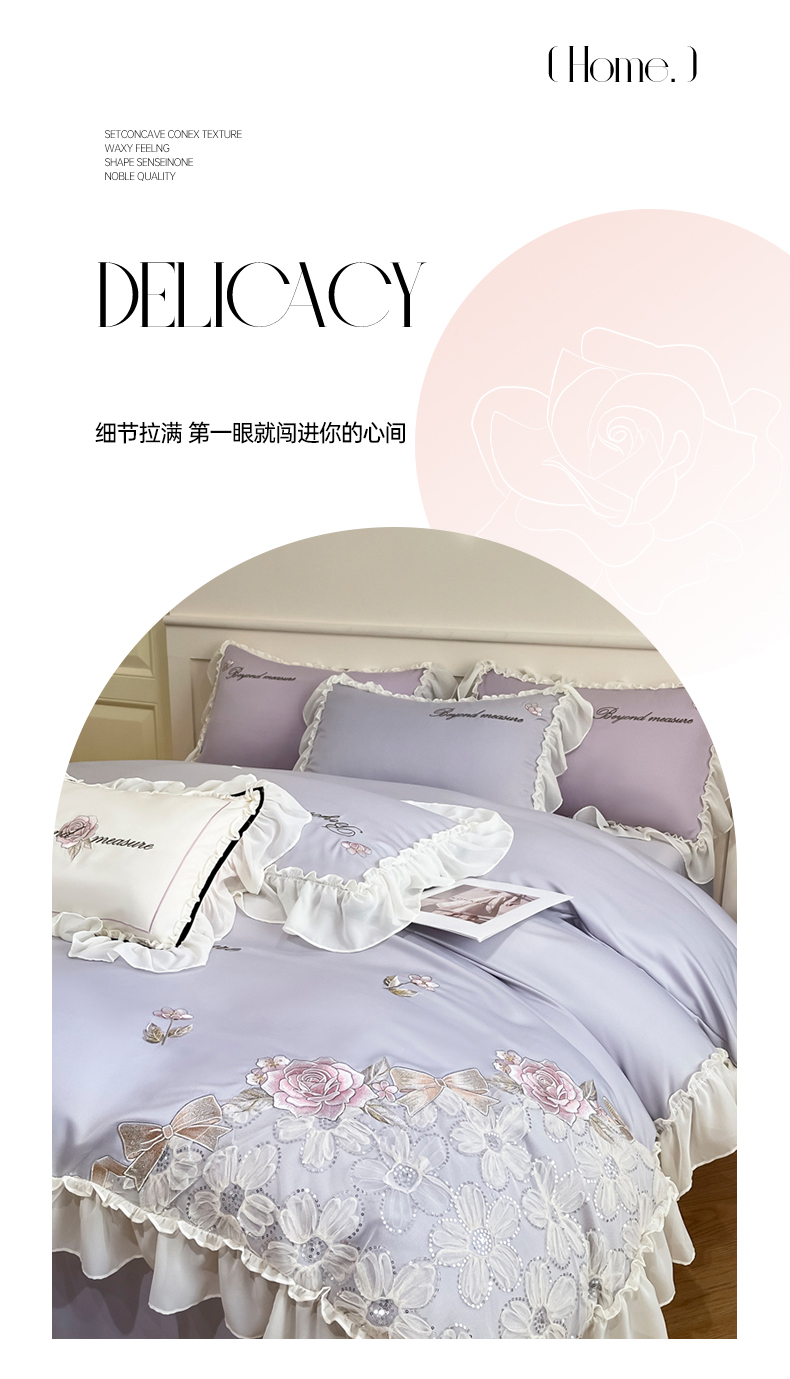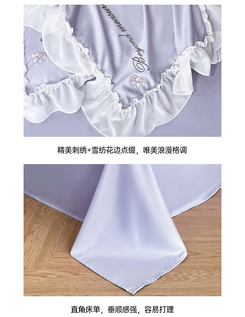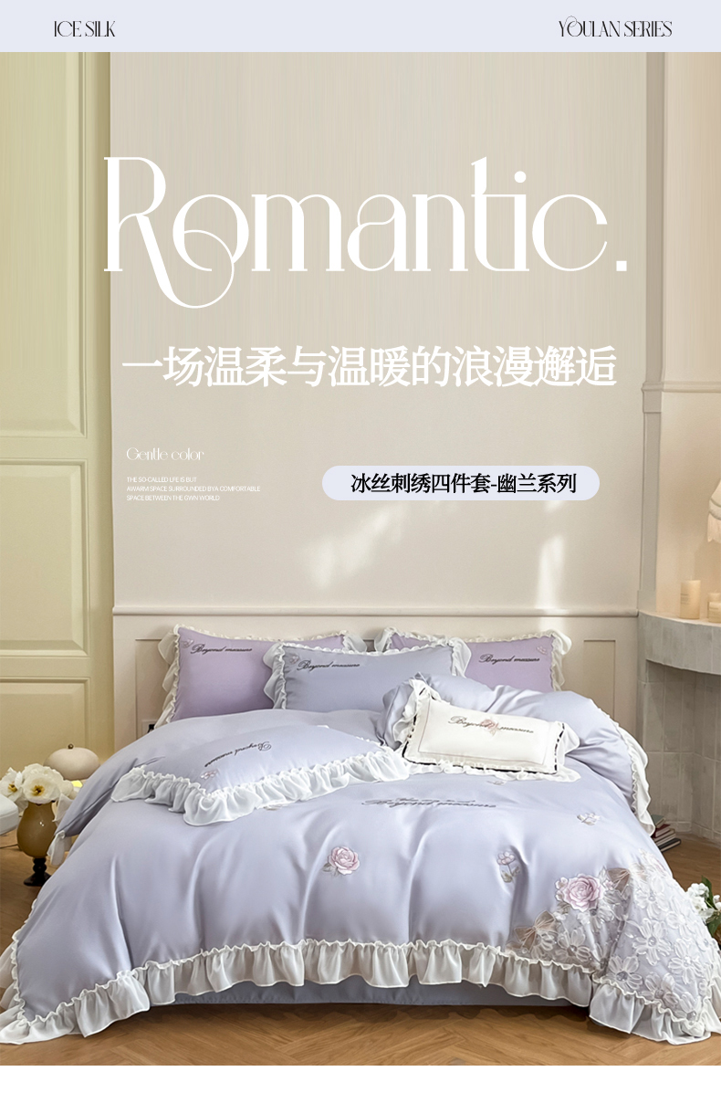 (总)七七家纺 2025新款冰丝刺绣款四件套幽兰系列,幽兰白,幽兰粉,幽兰灰,幽兰蓝,幽兰紫