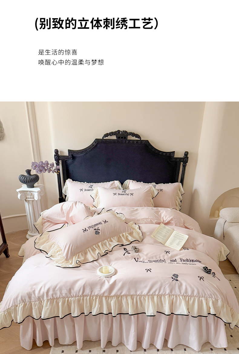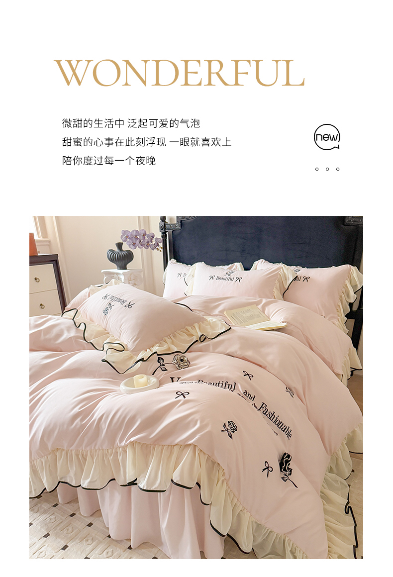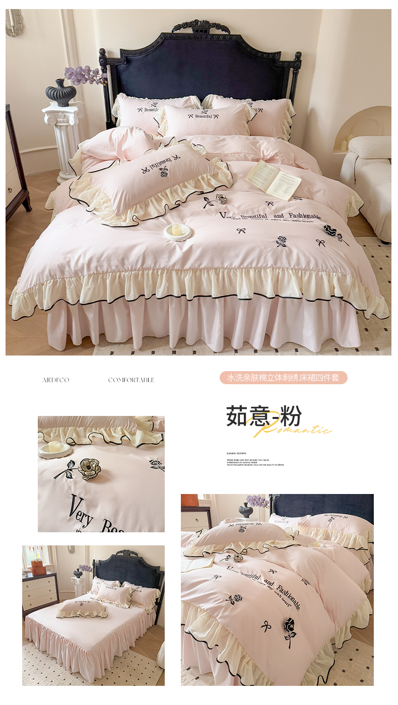 当前位置: 91家纺网 > 商品网购 > 床品套件 > 四件套 > 水洗棉四件套 > 富盛家纺 2025新款水洗亲肤棉刺绣床裙款四件套公主风四件套 茹意—粉