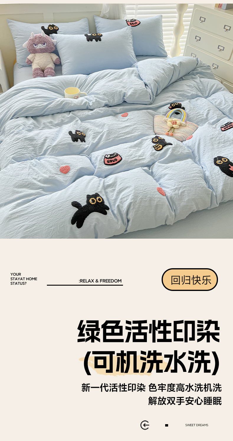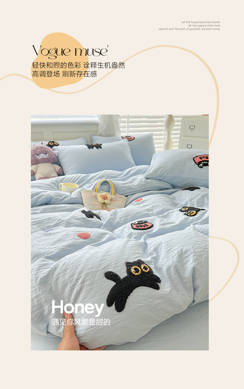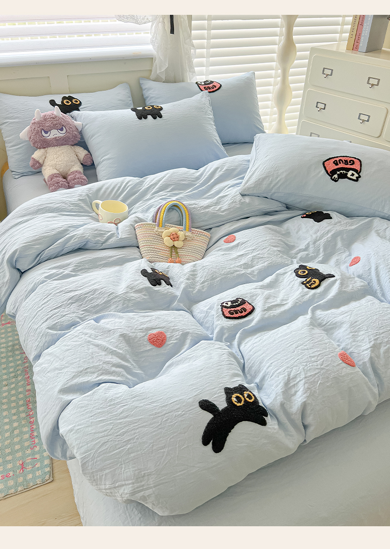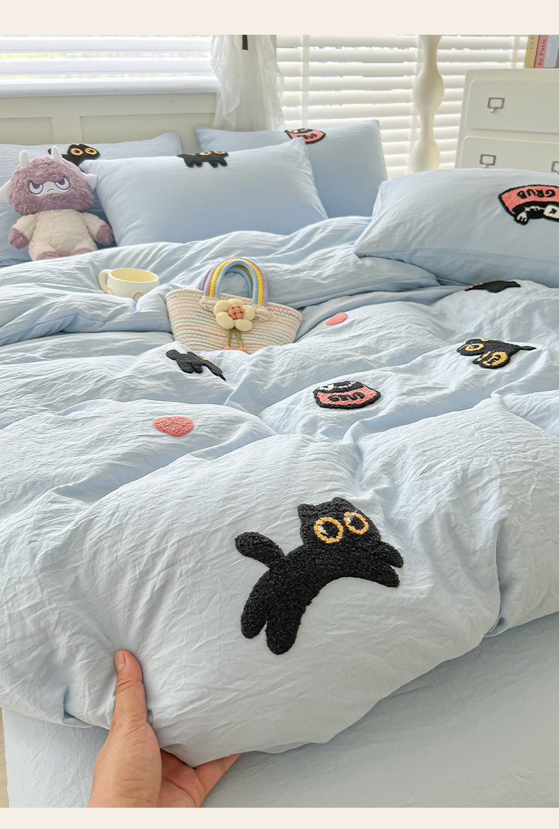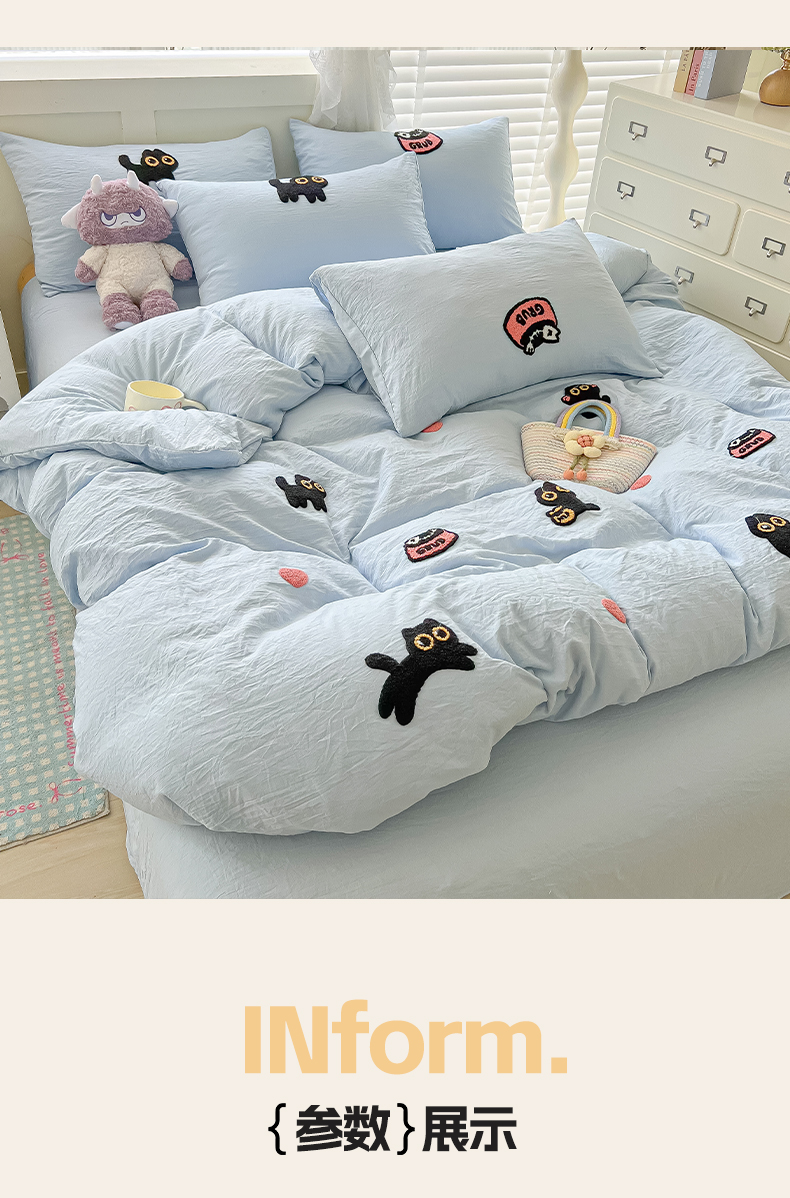当前位置: 91家纺网 > 商品网购 > 床品套件 > 四件套 > 全棉普通四件套 > 韩巢家纺 2025款四季通用超柔水洗棉毛巾绣四件套-幸运猫系列 幸运猫浅蓝