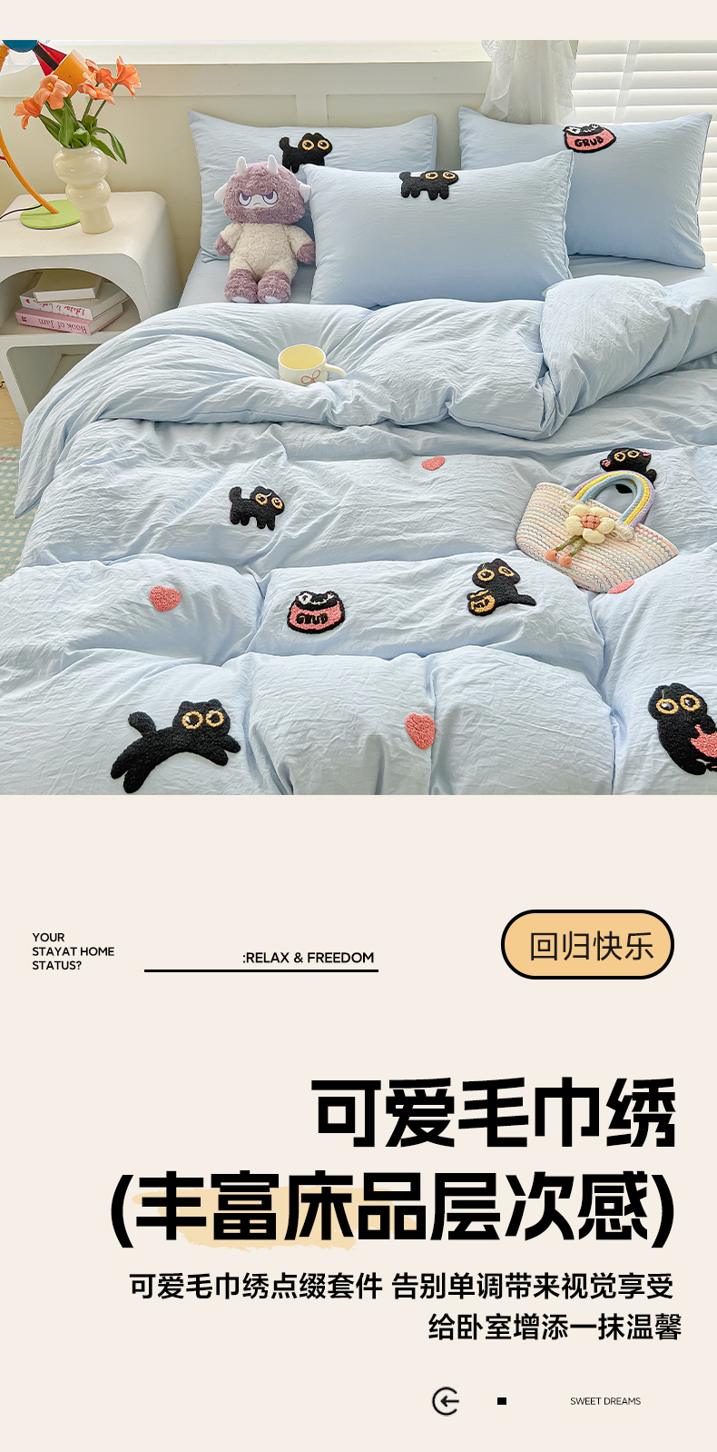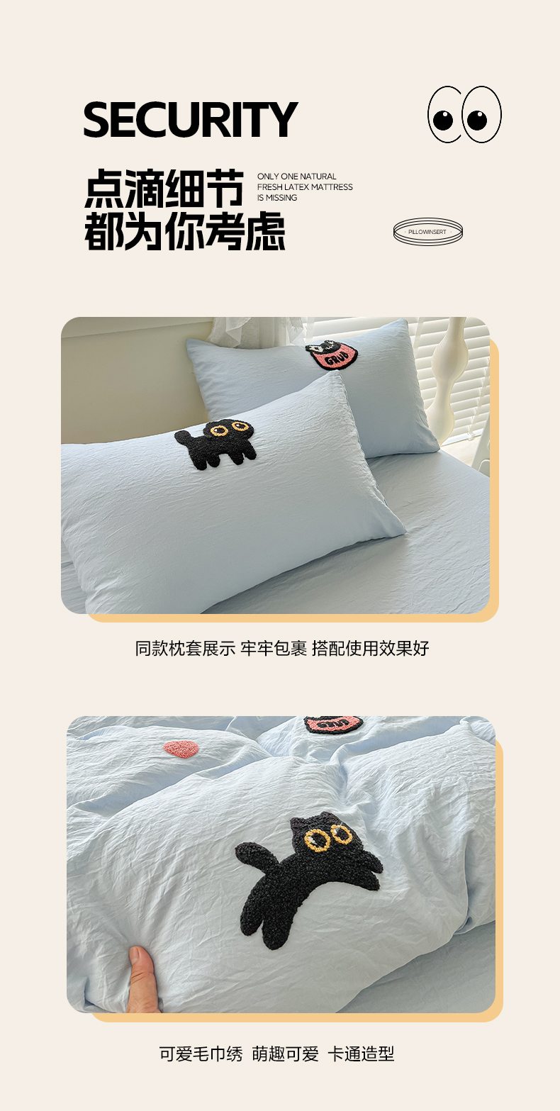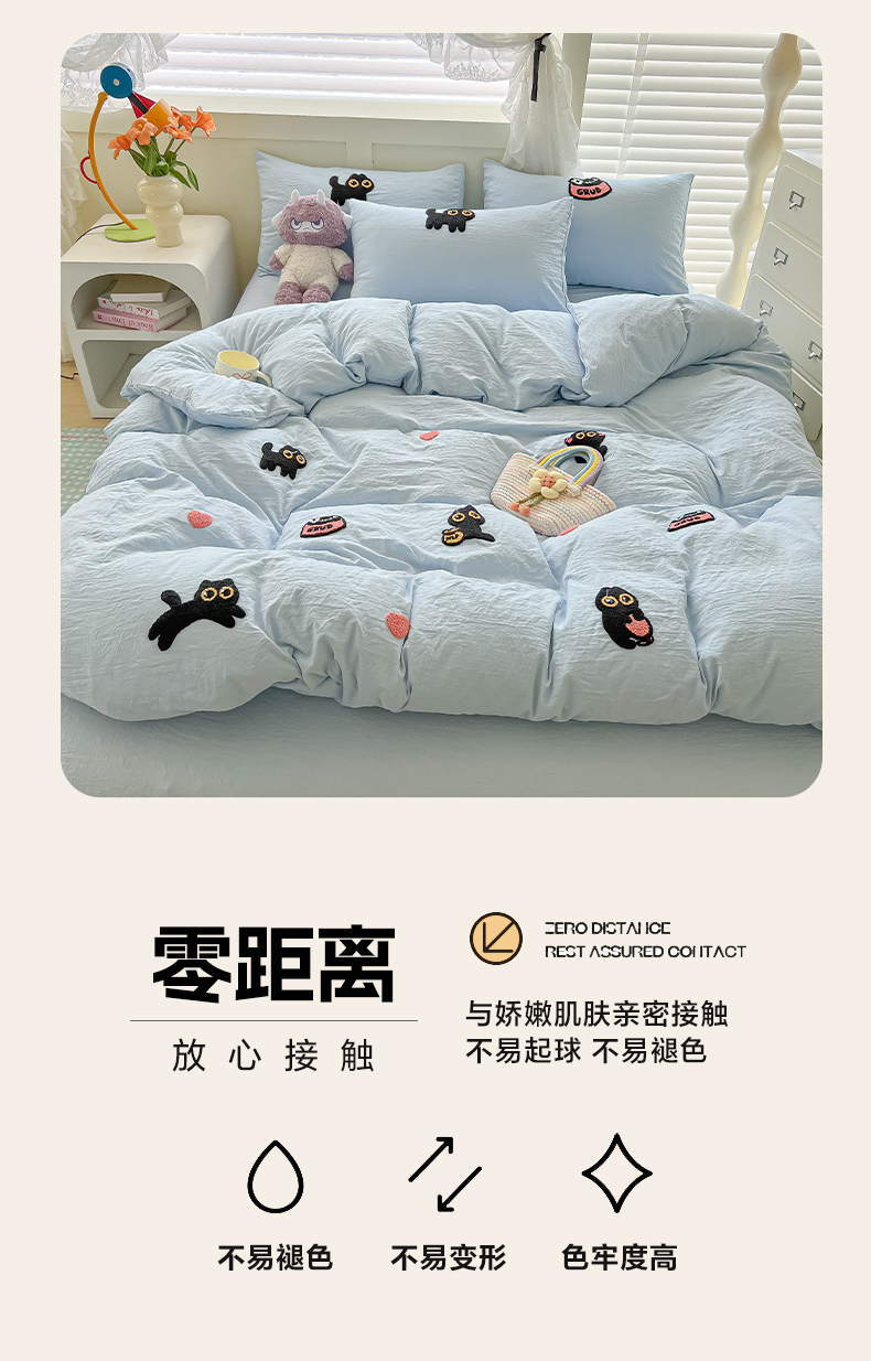 当前位置: 91家纺网 > 商品网购 > 床品套件 > 四件套 > 全棉普通四件套 > 韩巢家纺 2025款四季通用超柔水洗棉毛巾绣四件套-幸运猫系列 幸运猫浅蓝