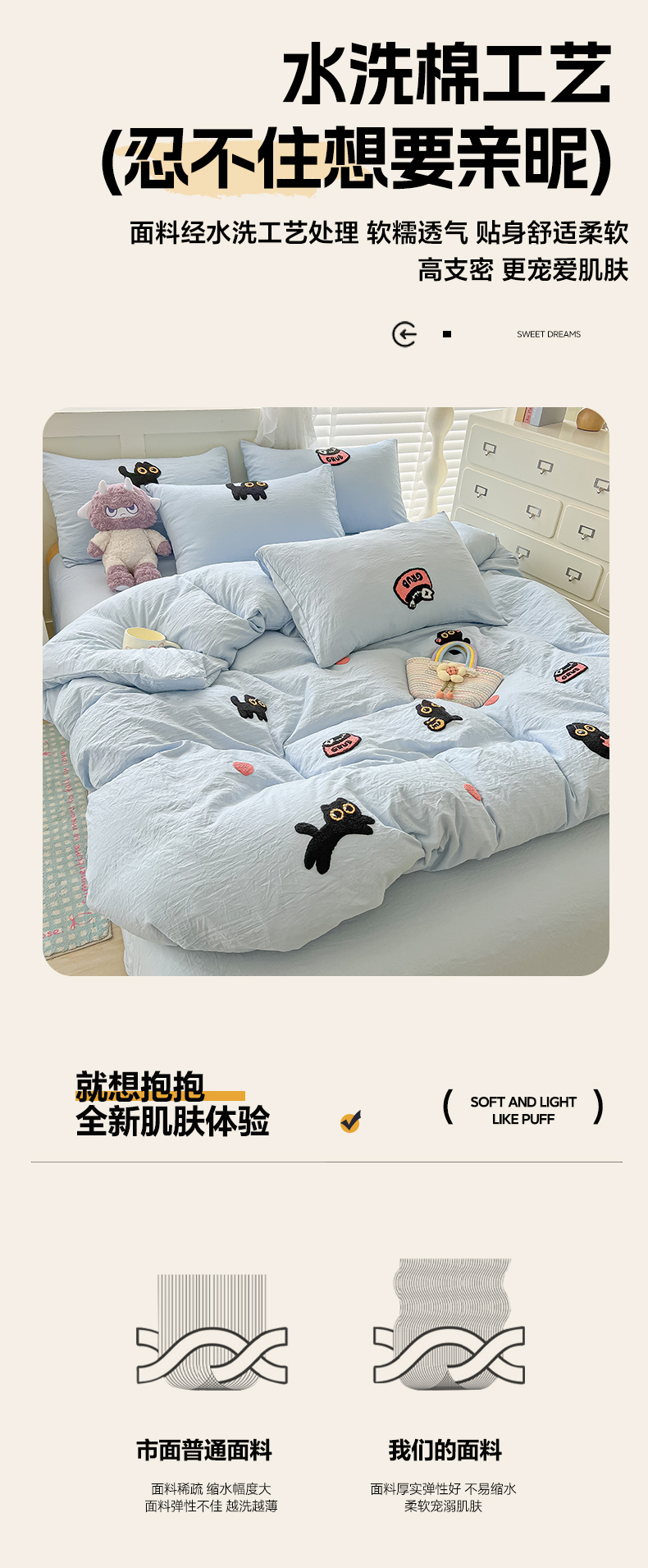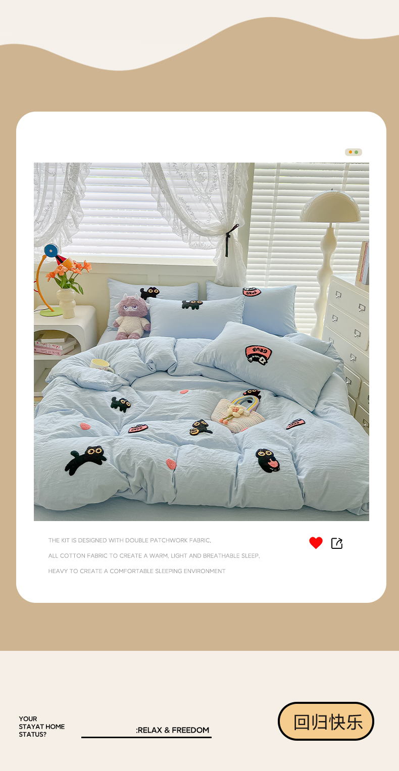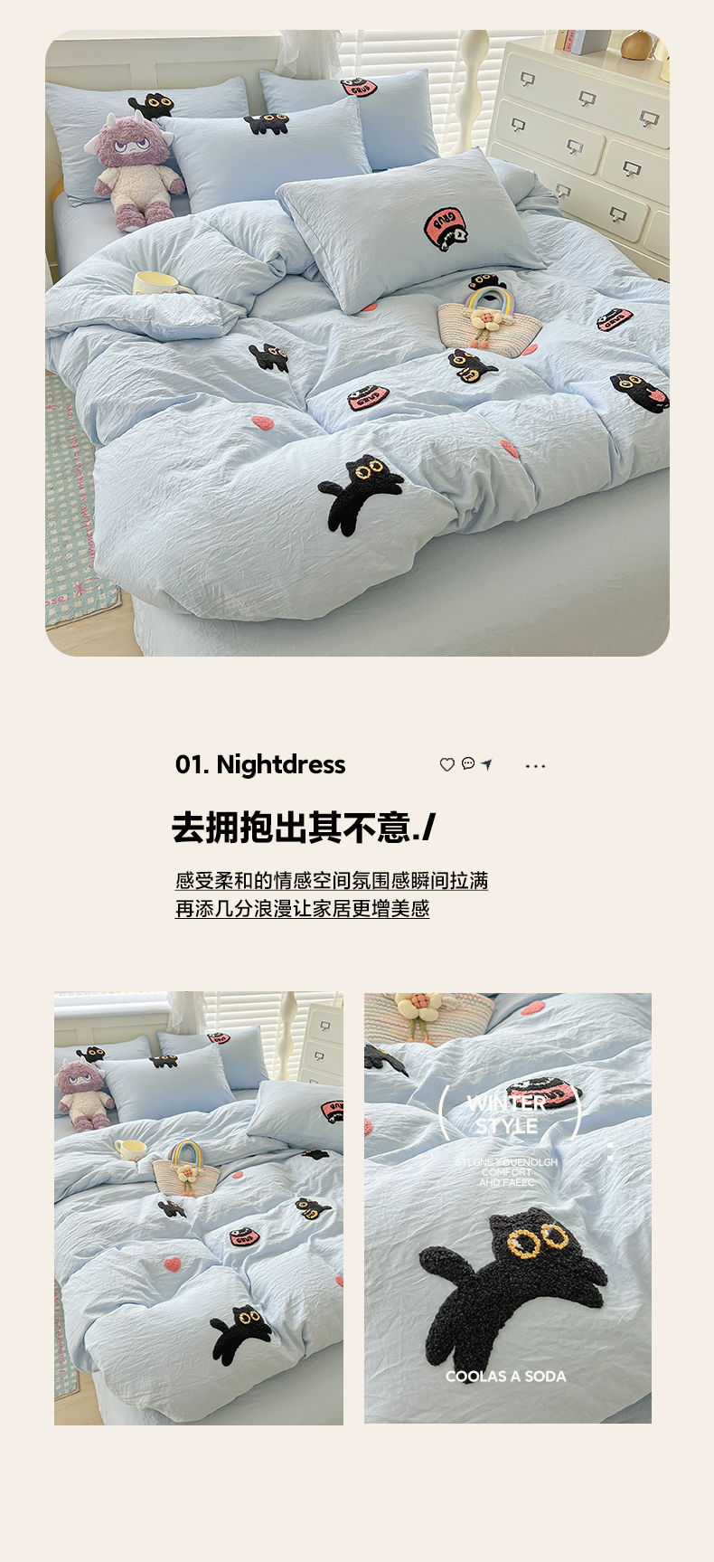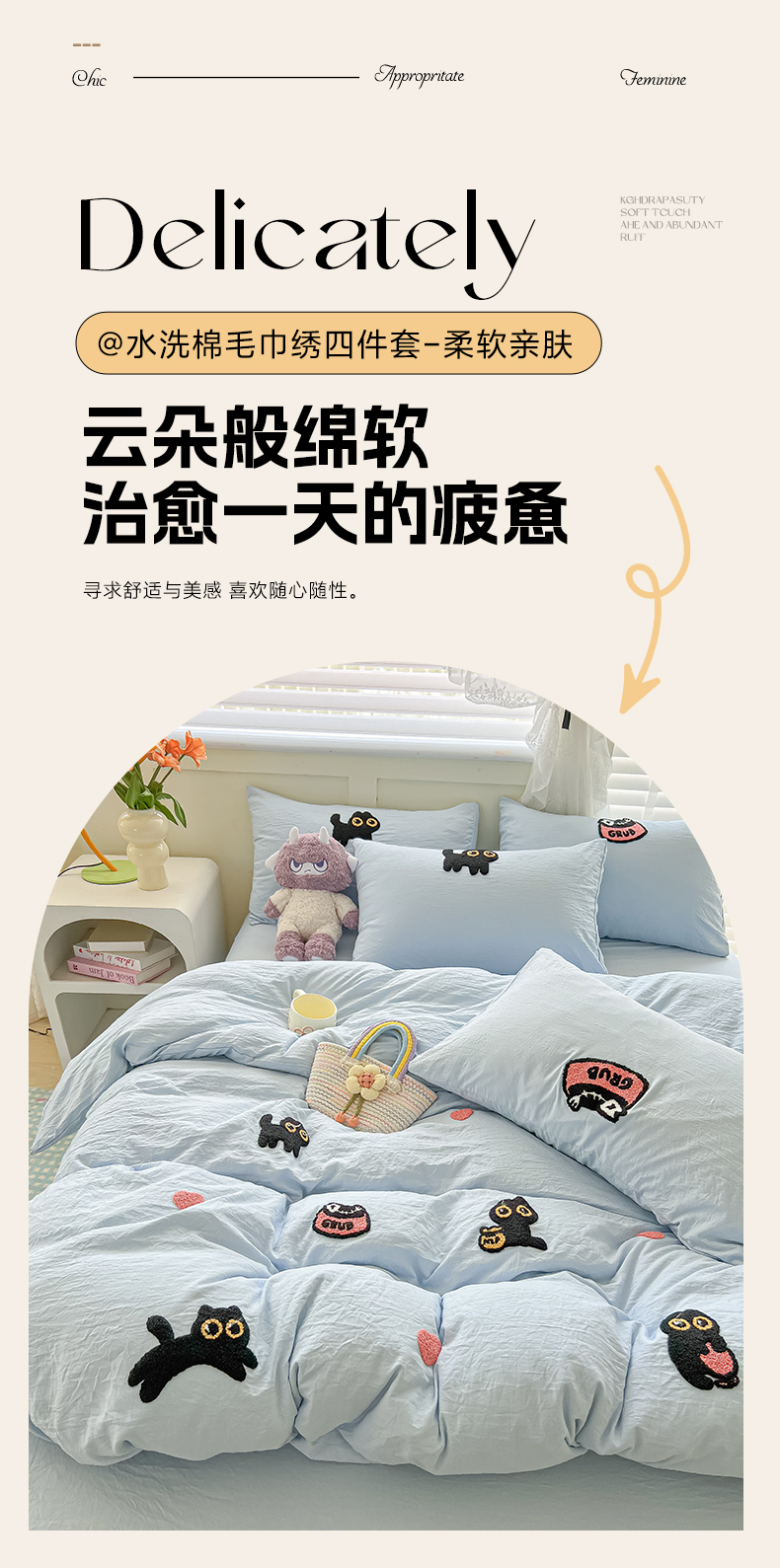 当前位置: 91家纺网 > 商品网购 > 床品套件 > 四件套 > 全棉普通四件套 > 韩巢家纺 2025款四季通用超柔水洗棉毛巾绣四件套-幸运猫系列 幸运猫浅蓝