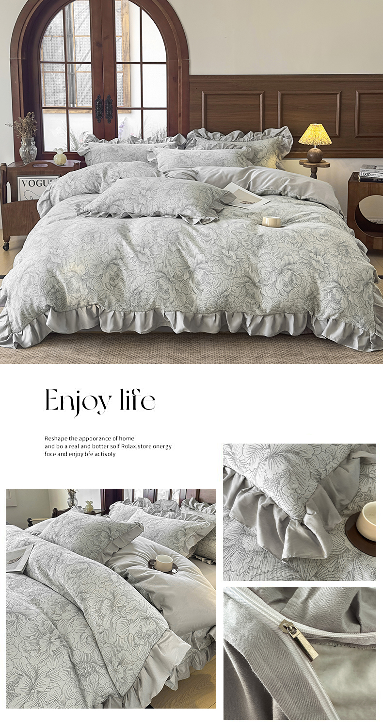 锦格家纺 2025年春夏新款A类全棉纯棉色织三层纱提花四件套 漫香花羽-灰